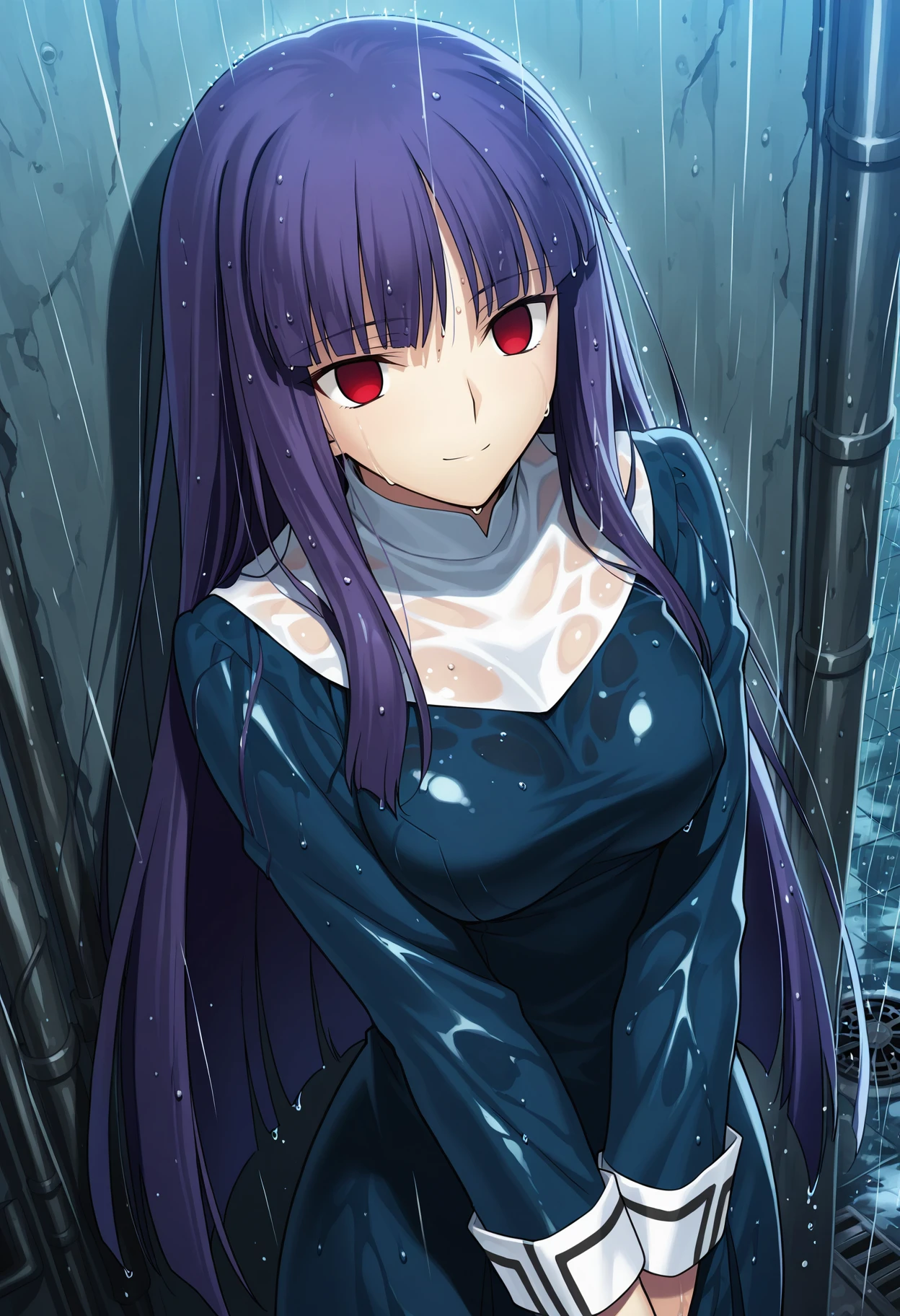 Base: a_fujino, 1girl, retro artstyle ,solo, long hair, purple hair, hime cut, red eyes, empty eyes, white turtleneck, fujino dress, blue dress, sleeve cuffs, long sleeves, long dress, medium breasts,