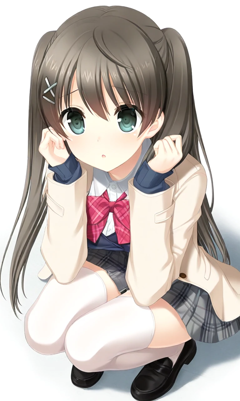 制服:futaba saki, teal eyes, black hair, long hair, hair ornament, twintails, thighhighs, skirt, white thighhighs, school uniform, gray skirt, plaid skirt, plaid, shoes, beige jacket, navy blue vest, red bow tie, loafers,