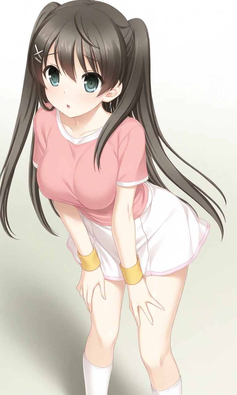 テニスウェア:futaba saki, teal eyes, black hair, long hair, hair ornament, twintails, white skirt, short sleeves, shirt, pink top, sporty pink top, white trim, white tennis skirt, yellow wristband, white socks, tennis shoes,