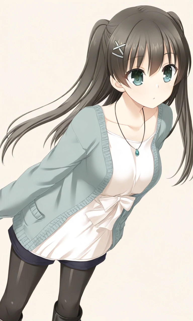私服1:futaba saki, teal eyes, black hair, long hair, hair ornament, twintails, jewelry, necklace, pantyhose, dark slateblue shorts, black pantyhose, light teal cardigan, light beige top,small bow, light beige bow, black shorts, black heeled boots,