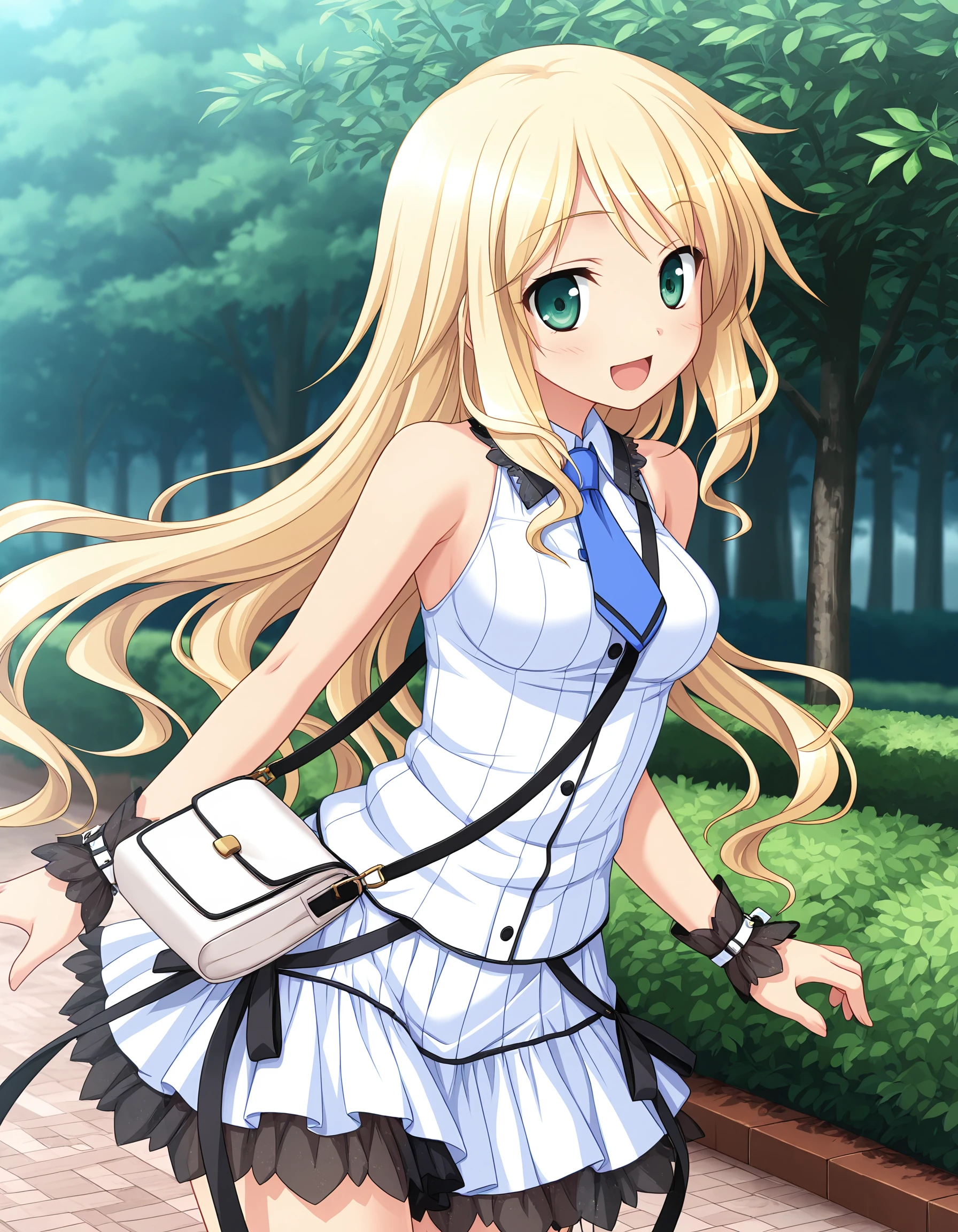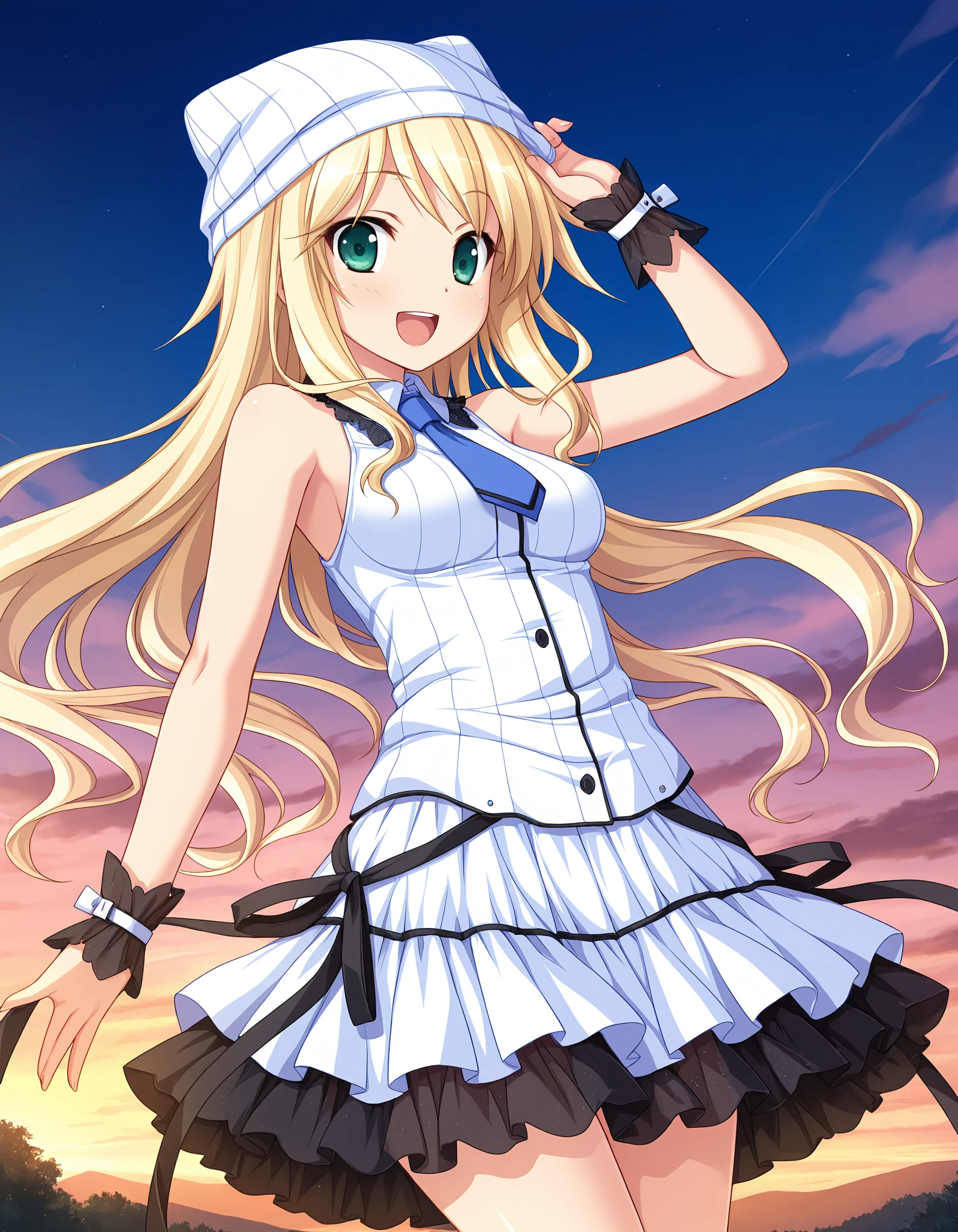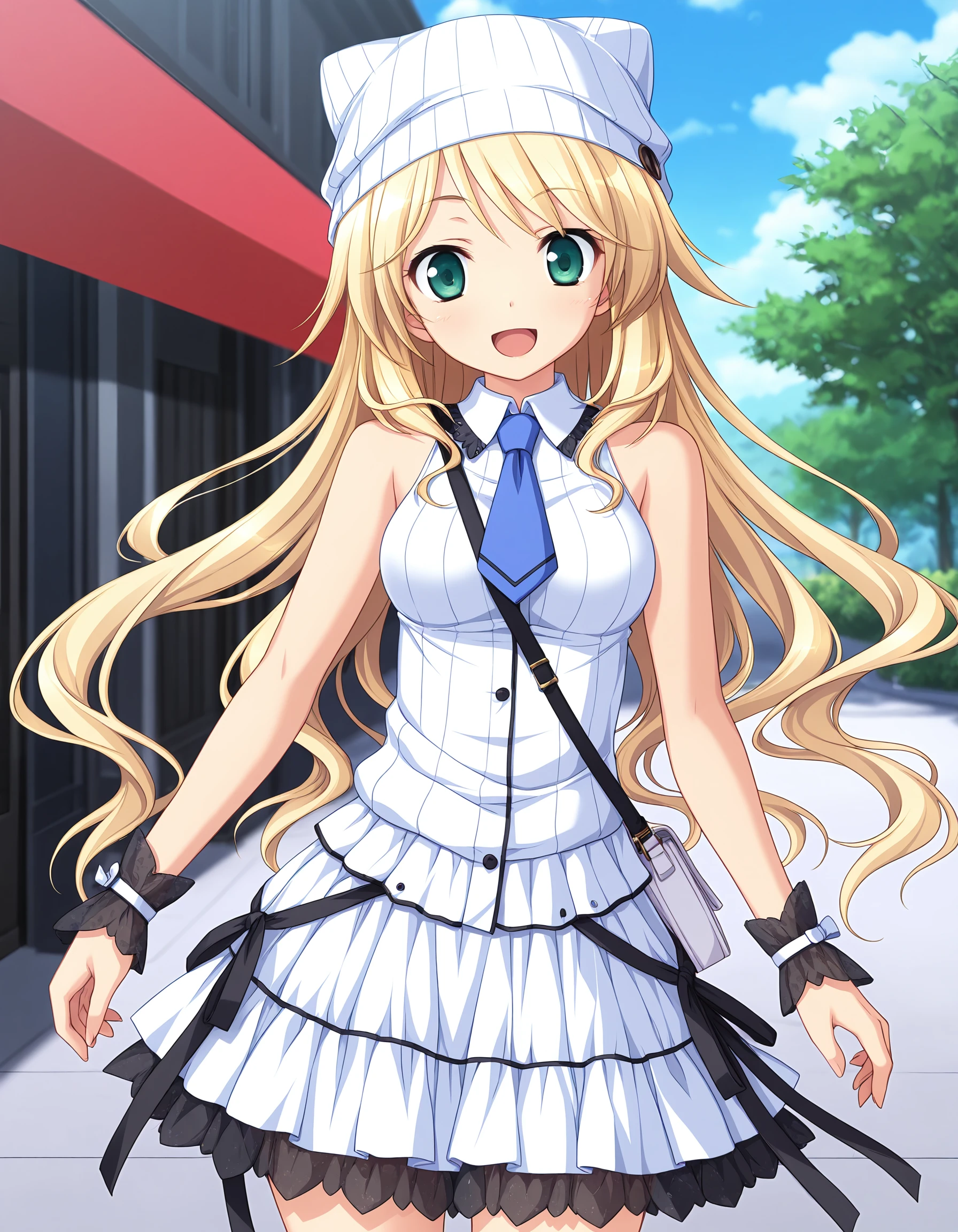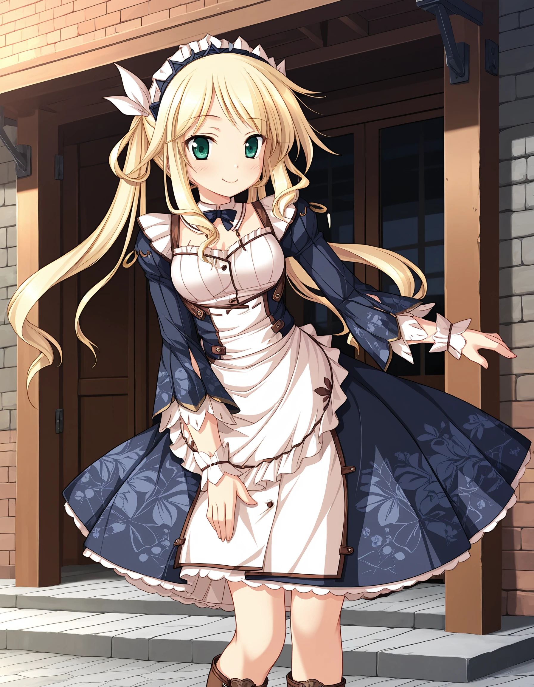 D-D, blond hair, long hair, green eyes, medium breasts,