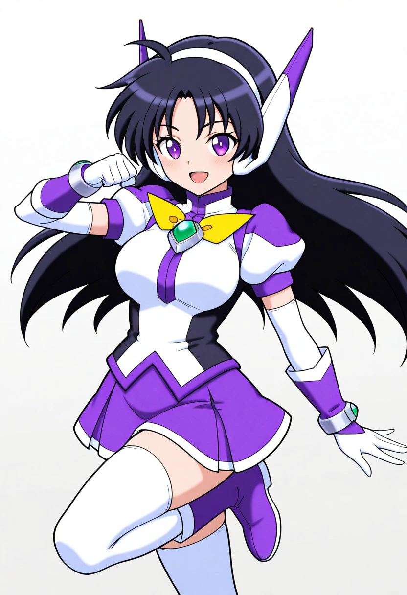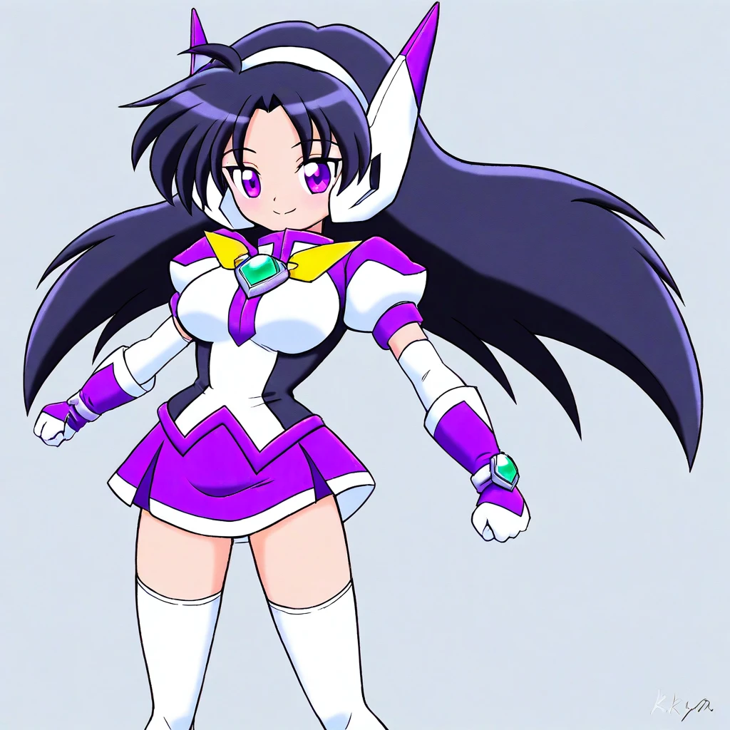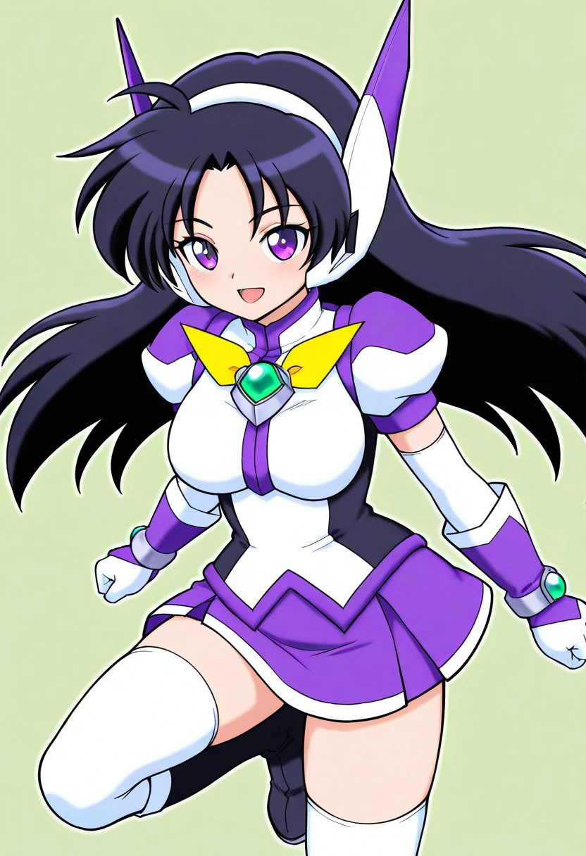 purpswa, 1girl, solo, black hair, long hair, purple eyes, purswaoutfit, white and purple shirt, raised collar, white hairband, white and purple headphones, white and purple glove, wristband, green gems, purple skirt with white trim, miniskirt, white thighhighs, zettai ryouiki, white and purple boots, yellow bow