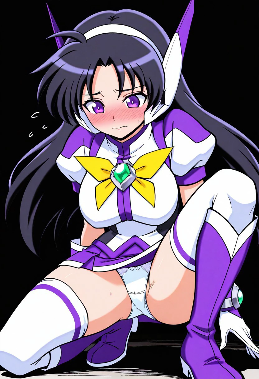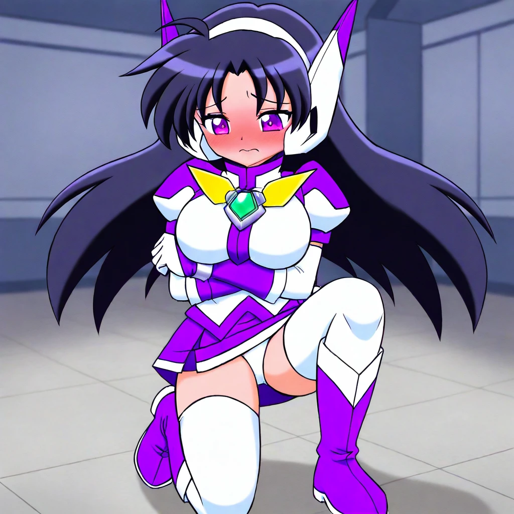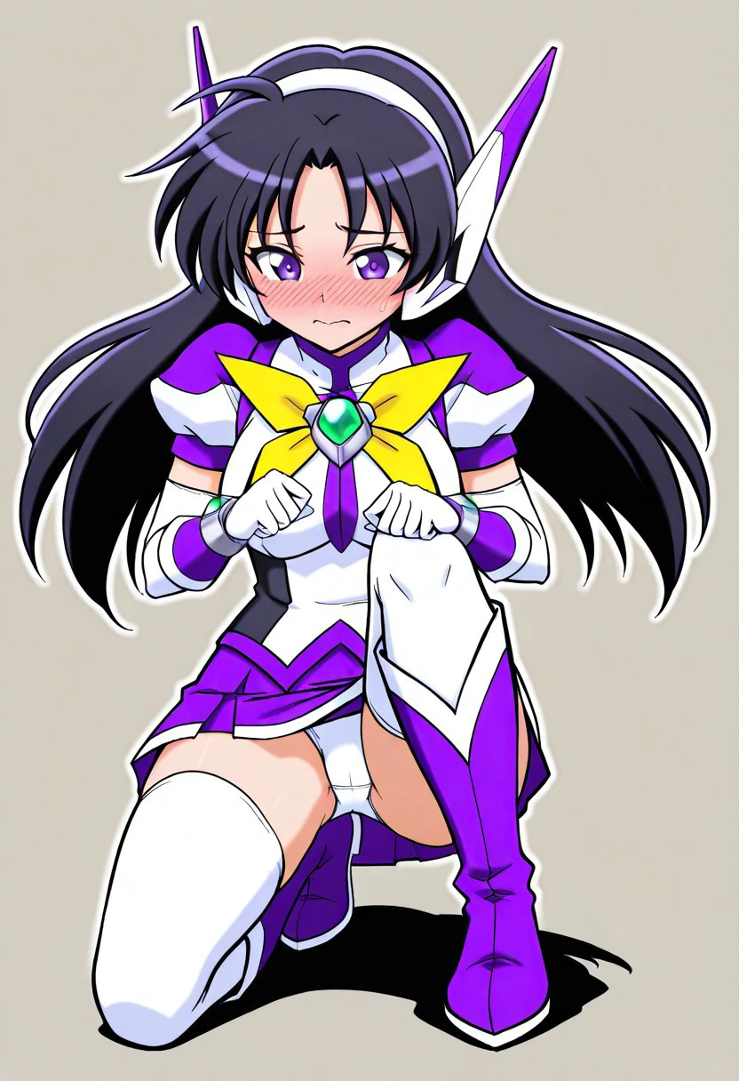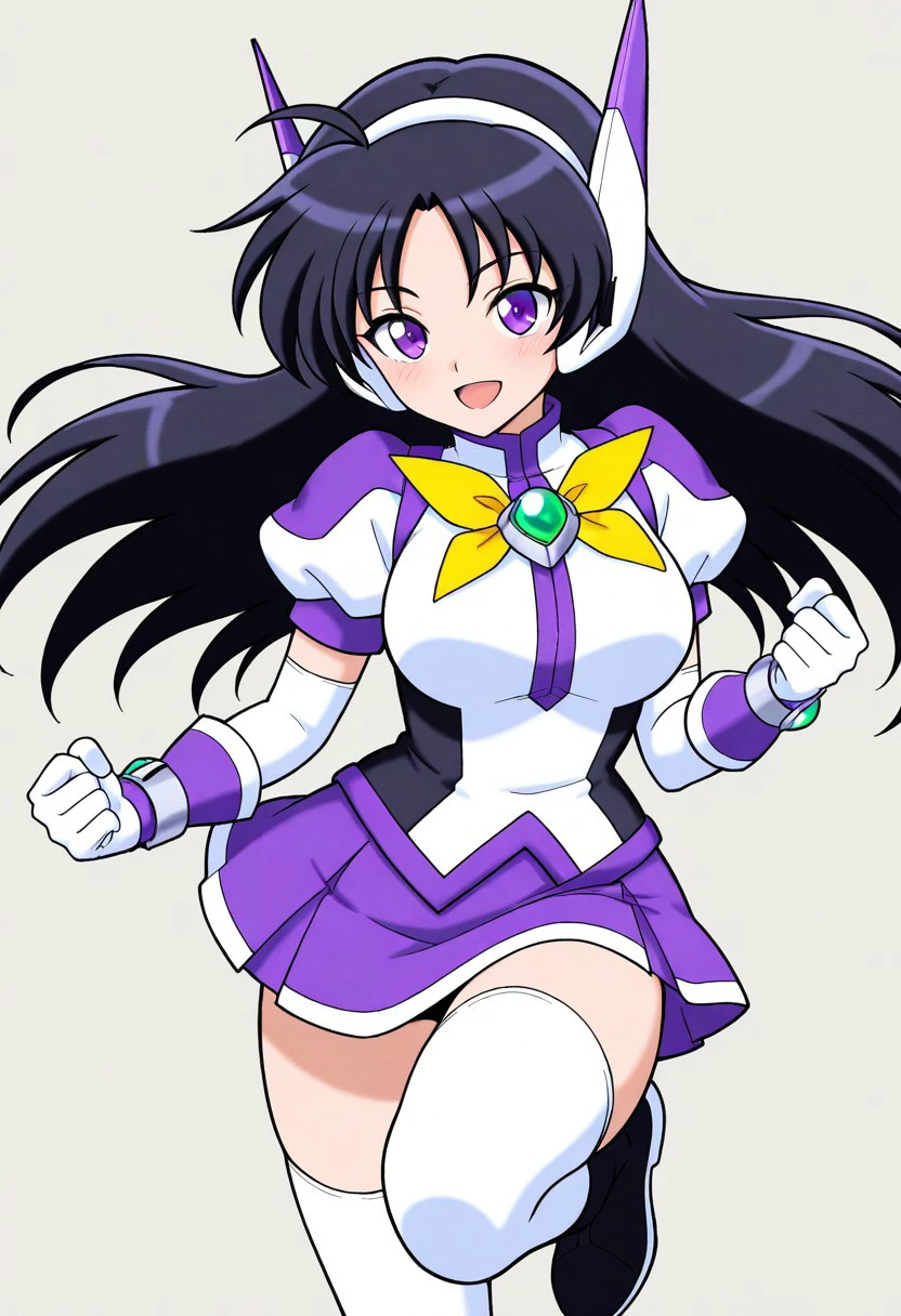 purpswa, 1girl, solo, black hair, long hair, purple eyes, purswaoutfit, white and purple shirt, raised collar, white hairband, white and purple headphones, white and purple glove, wristband, green gems, purple skirt with white trim, miniskirt, white thighhighs, zettai ryouiki, white and purple boots, yellow bow