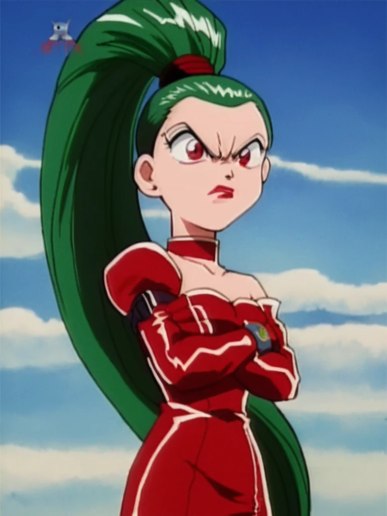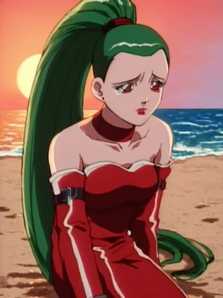 long hair, green hair, red eyes, lipstick, ponytail, red dress,