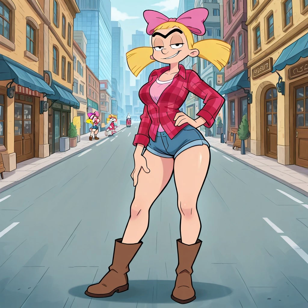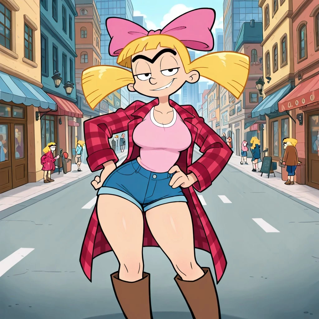 solo female, blonde hair, two long square pigtails, unibrow, black eyes, pink hairbow, curvy, breasts,