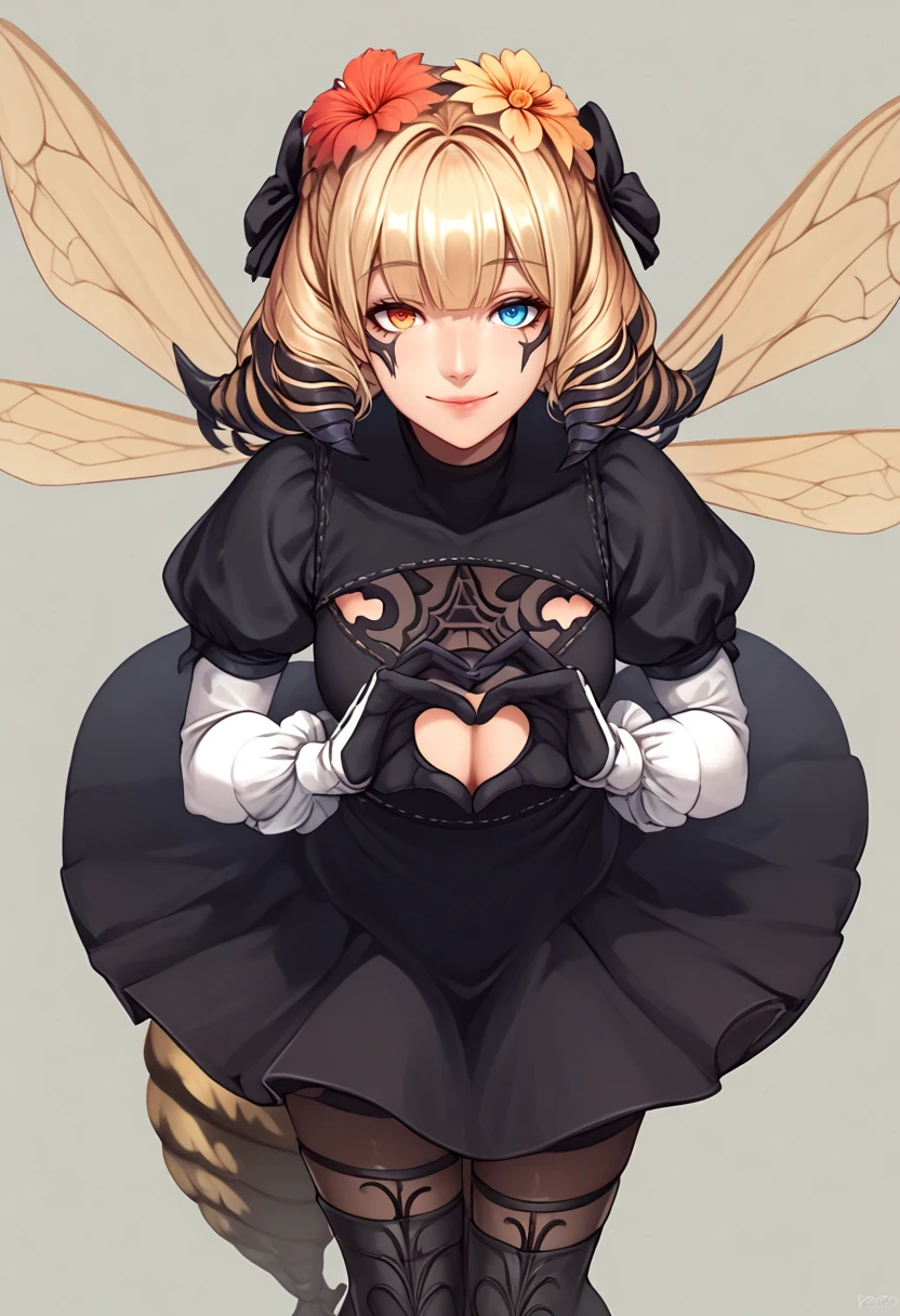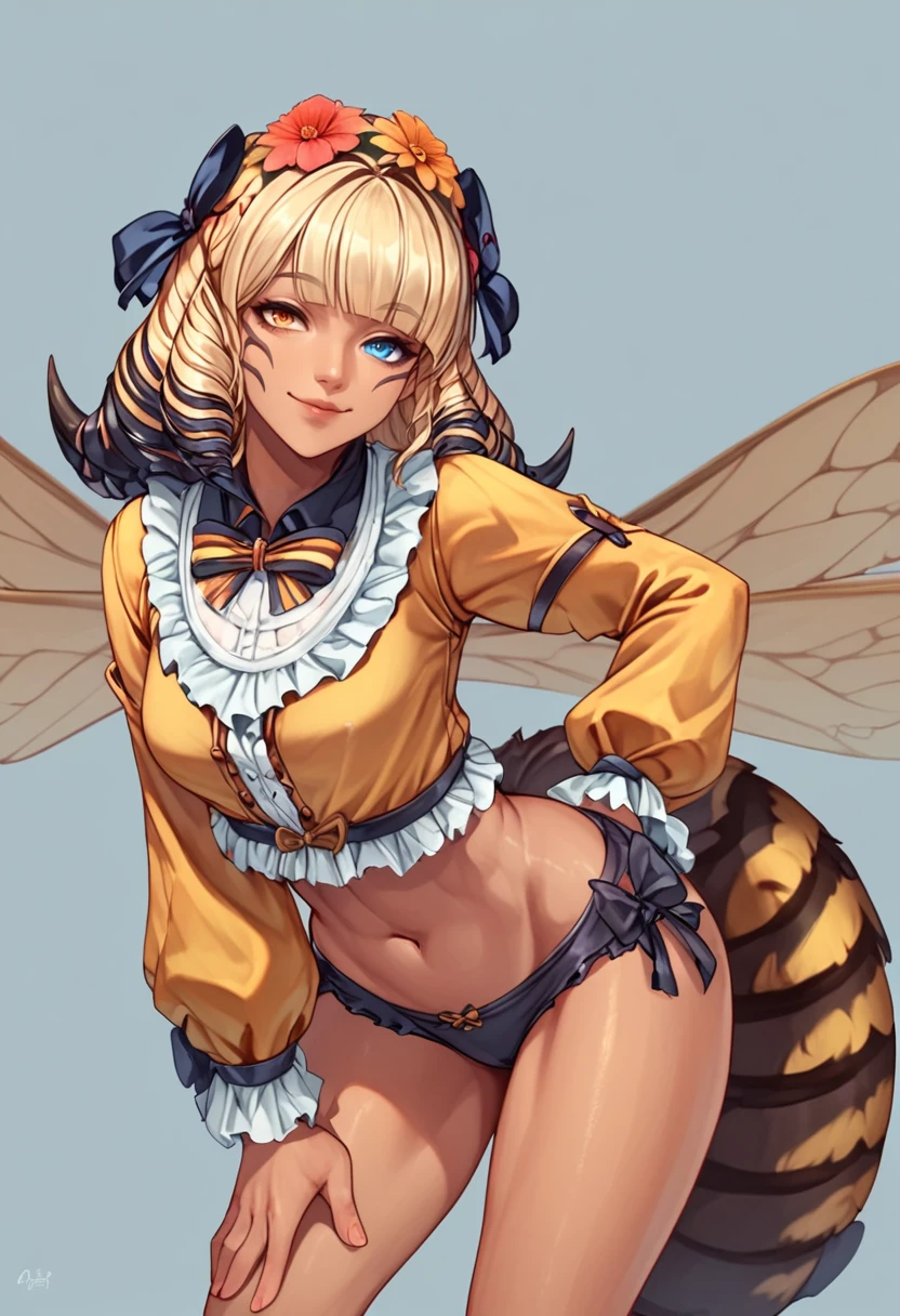 hnyb, drill hair, blunt bangs, facial mark, hair ornament, hair flower, heterochromia, hnybeetail, wings, bee tail
