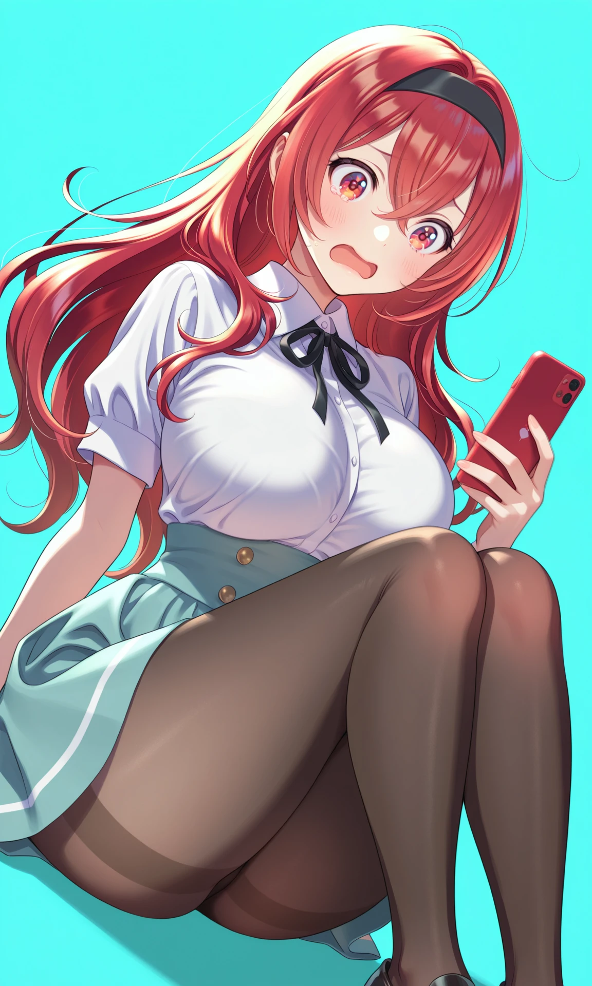 夏装:short sleeves,white shirt,collared_shirt,neck_ribbon,black_ribbon,high-waist skirt,aqua skirt,double-breasted,black pantyhose,black footwear,loafers,