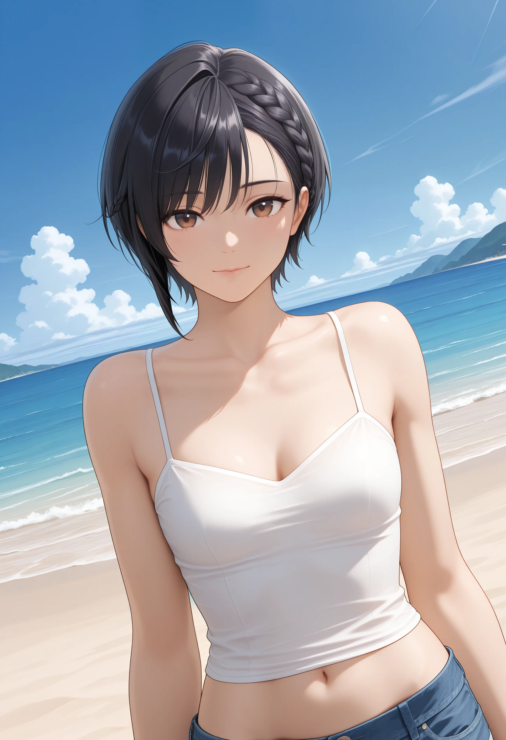 • Half Crown Braid:"brown eyes,black hair,short hair,braid,asymmetrical hair,small breasts,aged up"