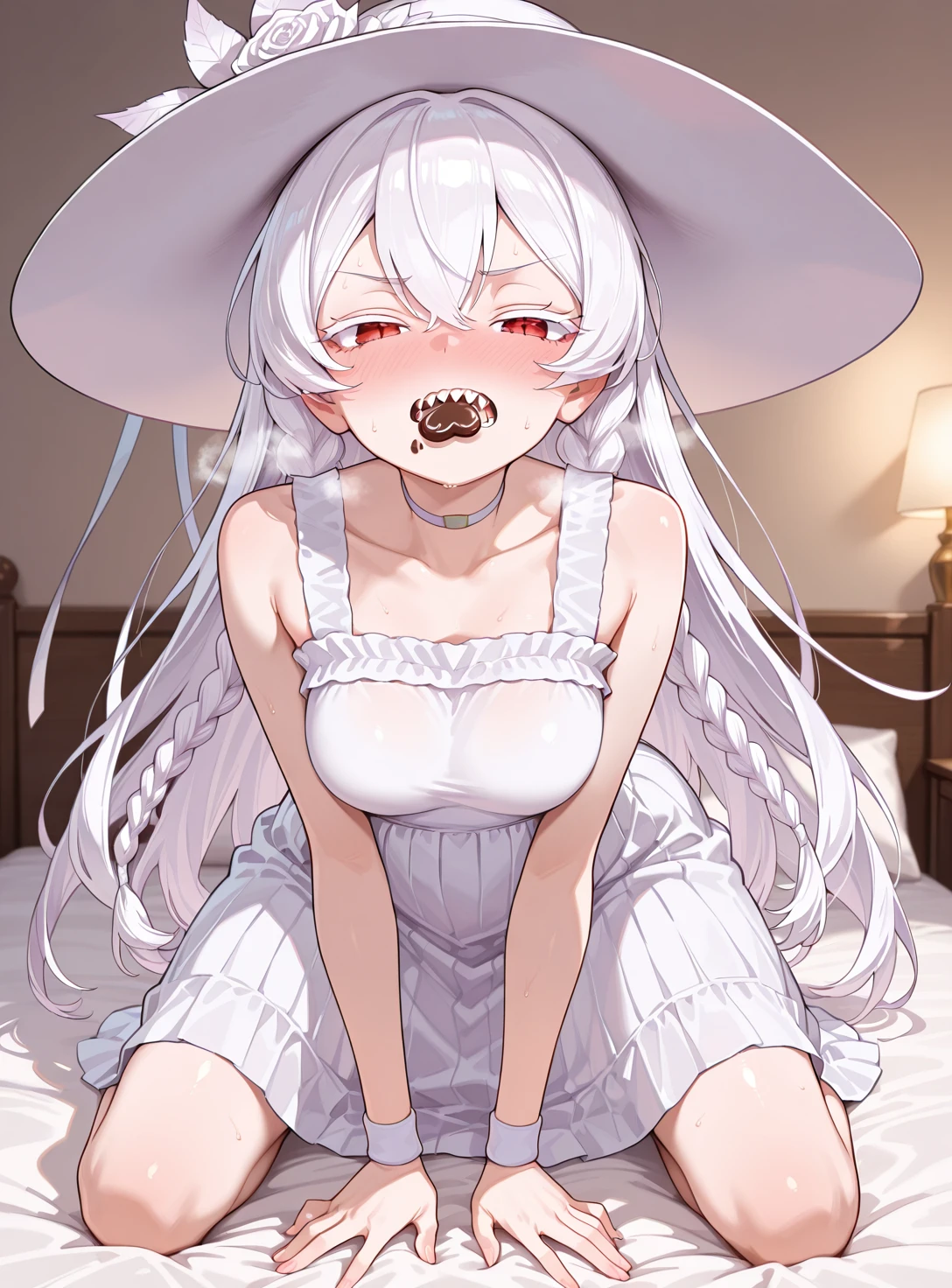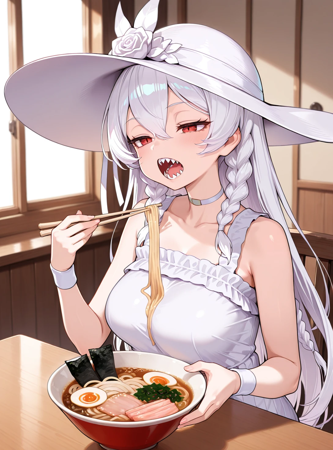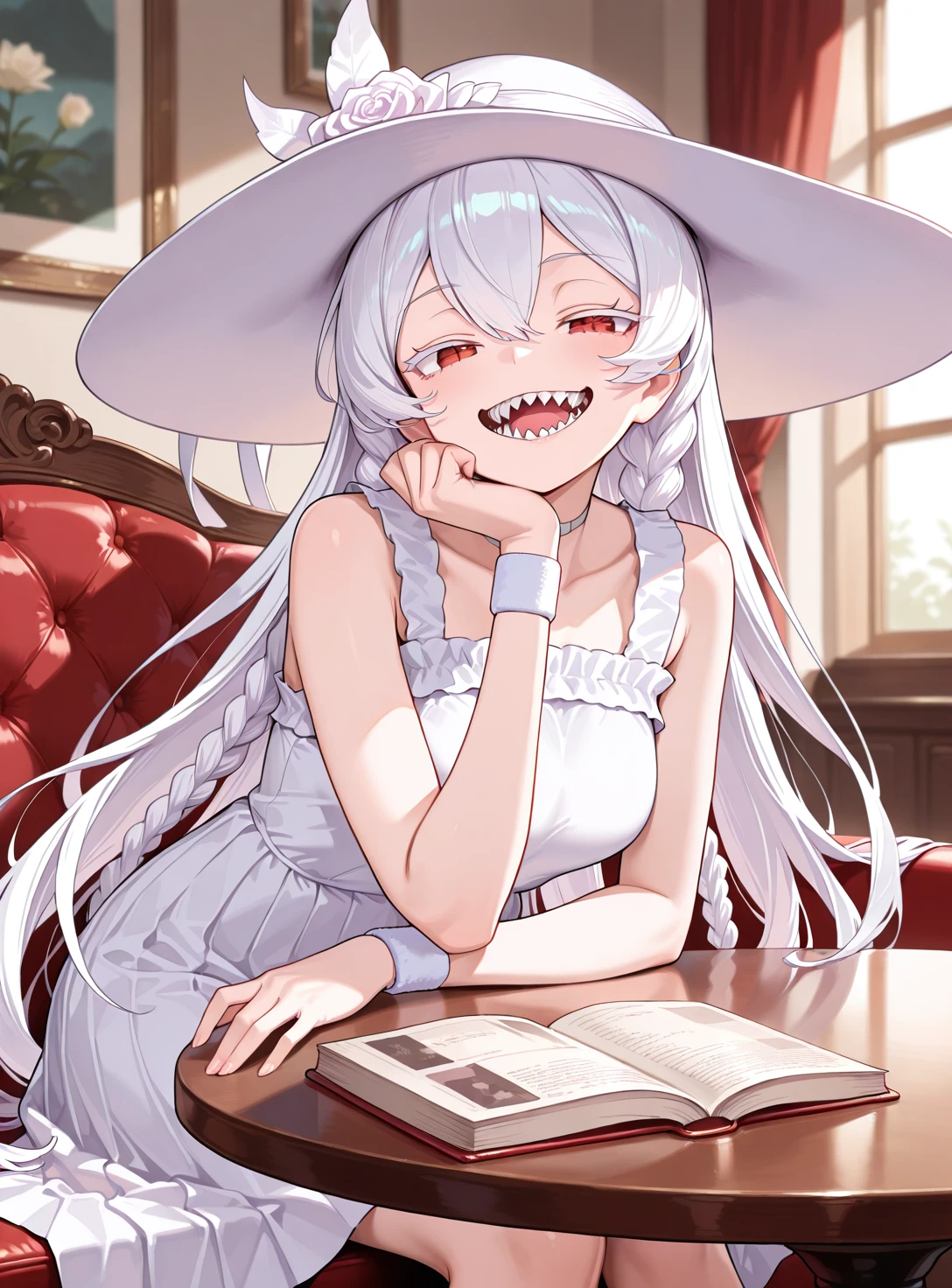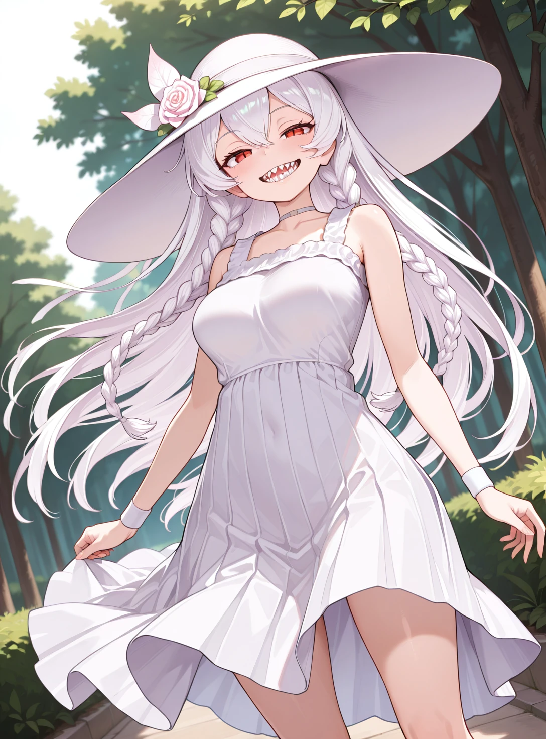 Mandator White, long hair, sun hat, choker, sundress, wristband, sharp teeth,