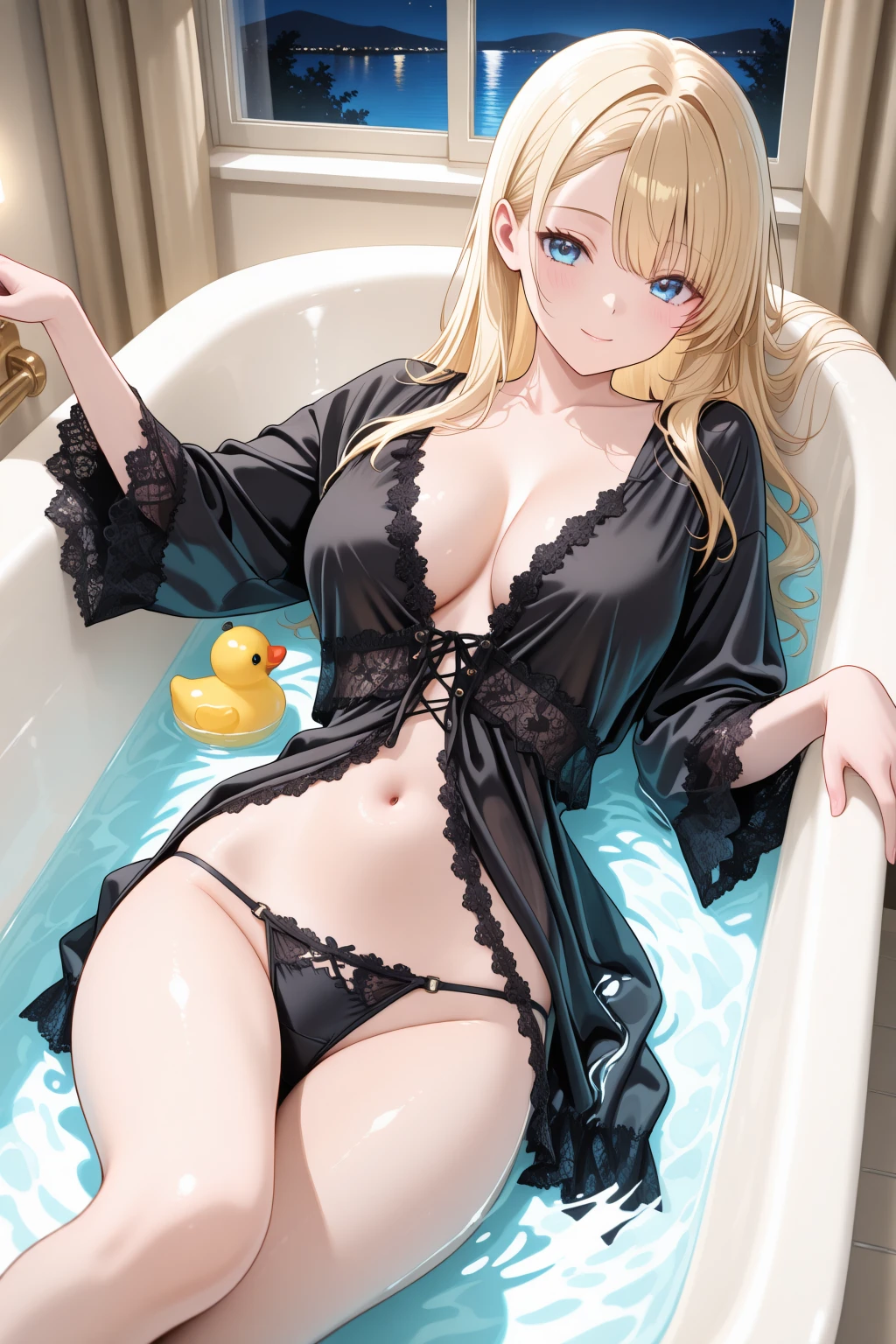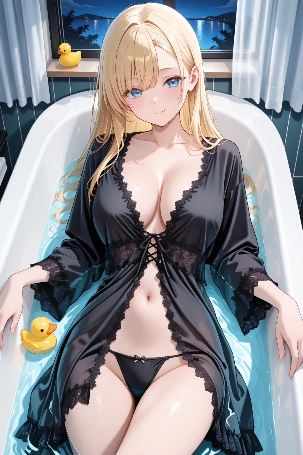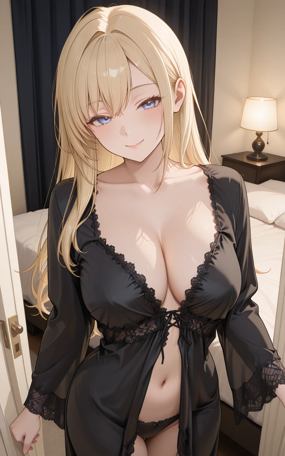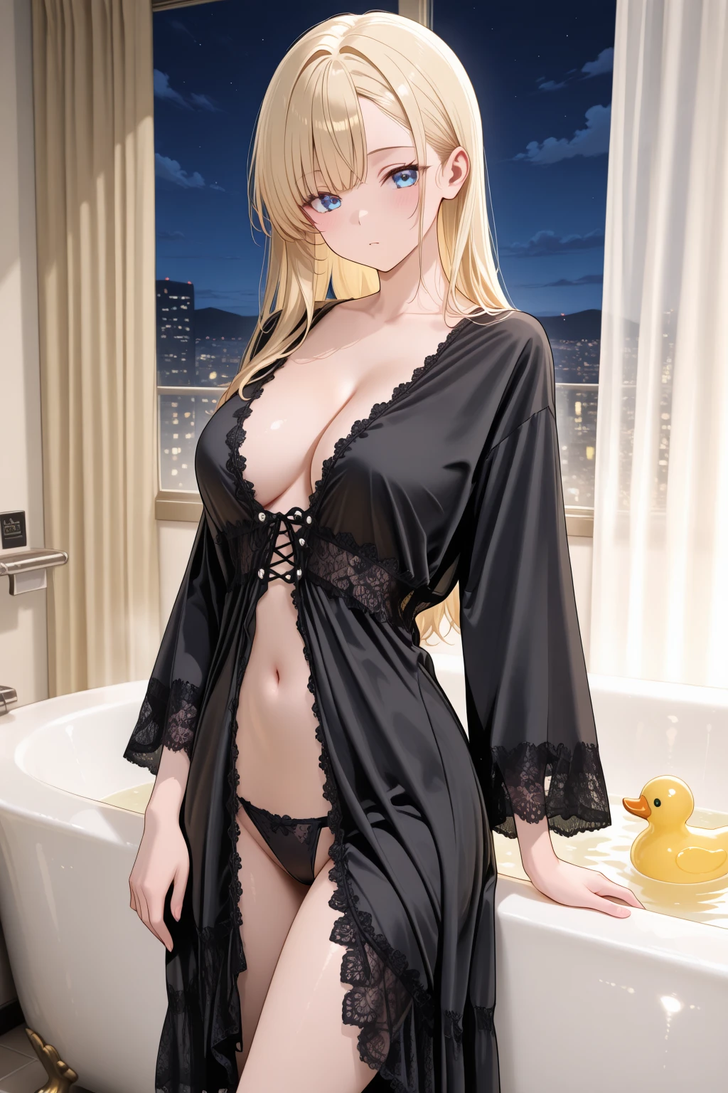 long sleeves open-front nightgown,black nightgown,lace trim,lace waist,lace cuff,lace hem,cleavage,navel,