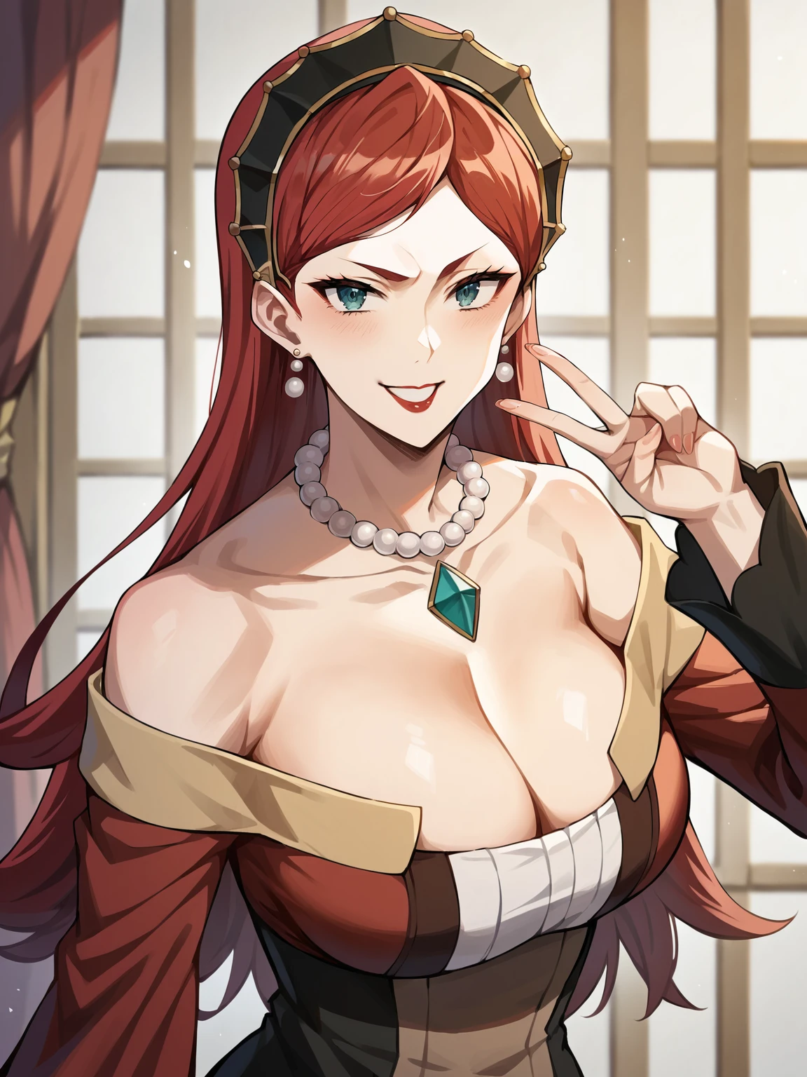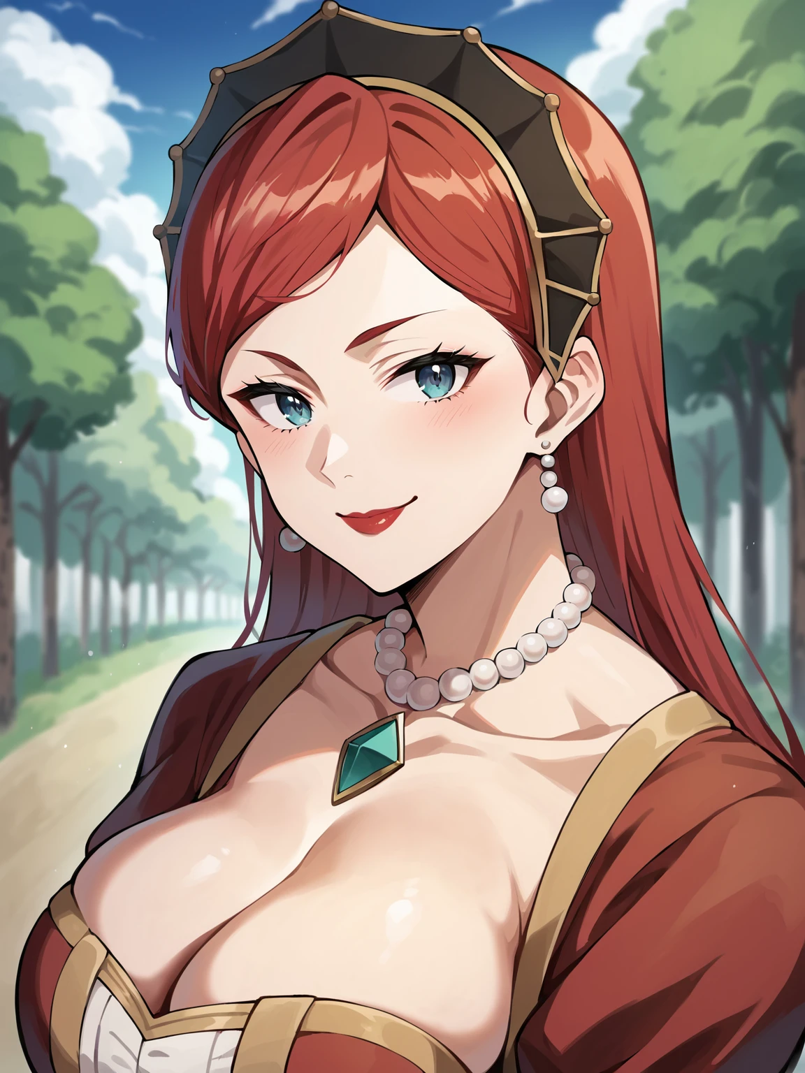 hilda boreas greyrat, mushoku tensei, red hair, long hair, hairband, lipstick, large breasts,