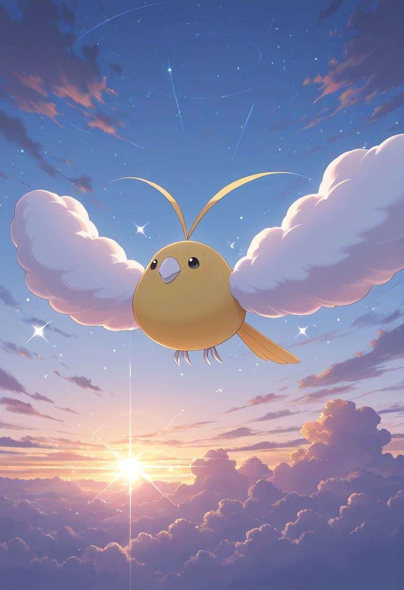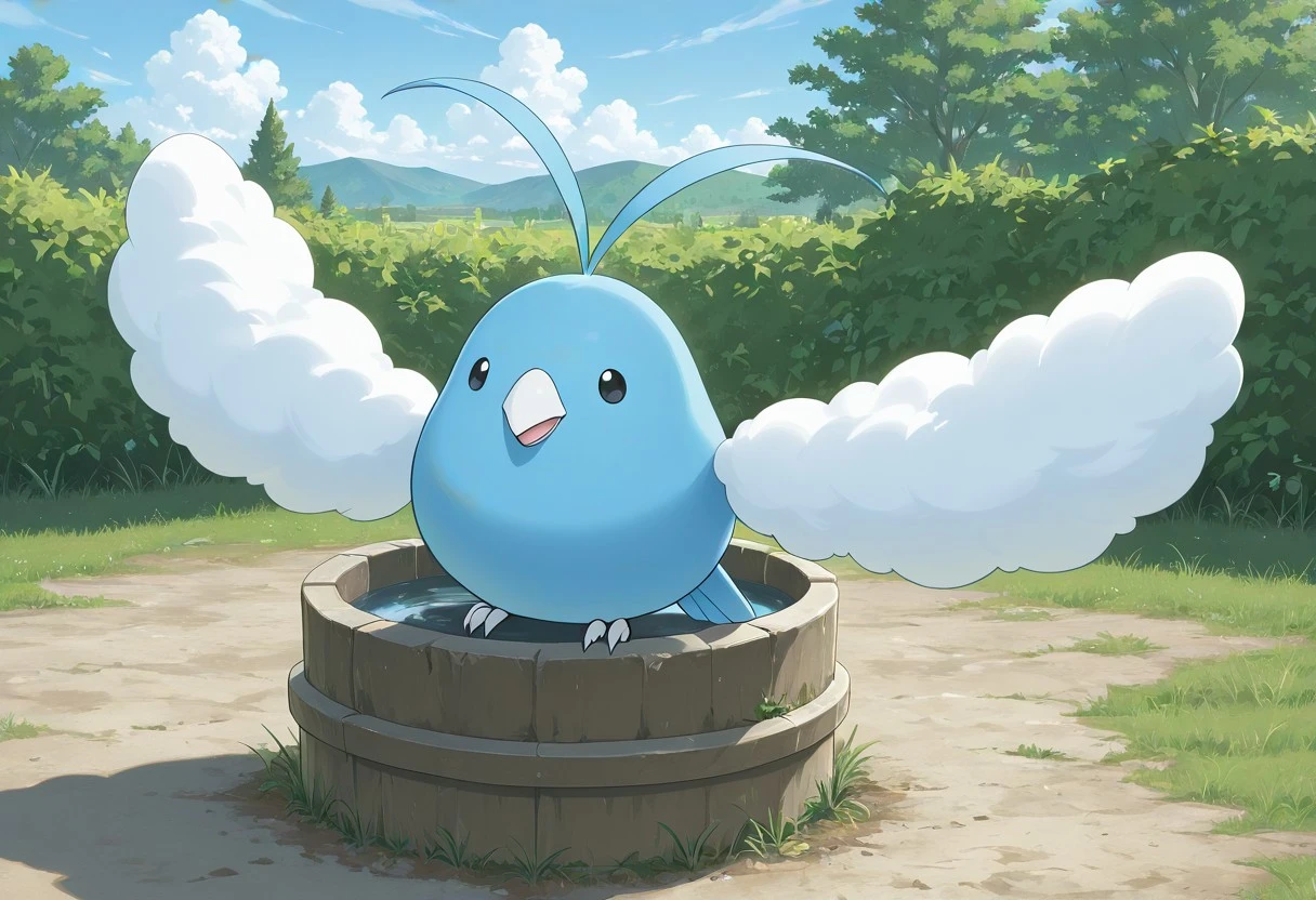 Swablu_PKMN, blue body, blue feathers, blue tail, round body, cloud wings, white beak, black eyes, white bird feet