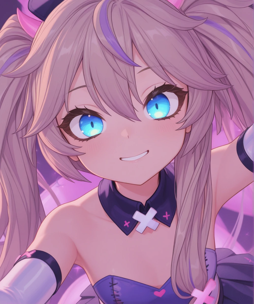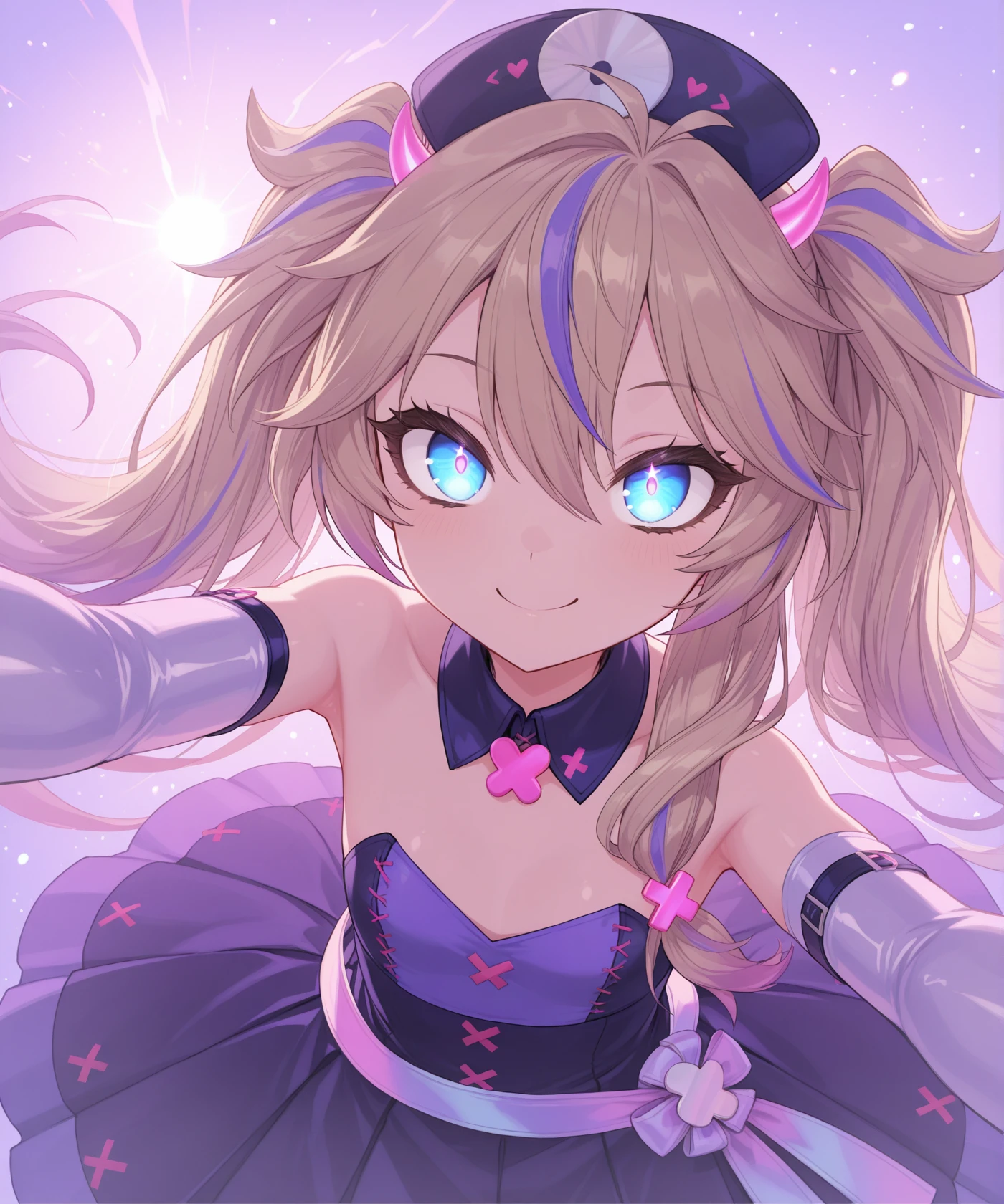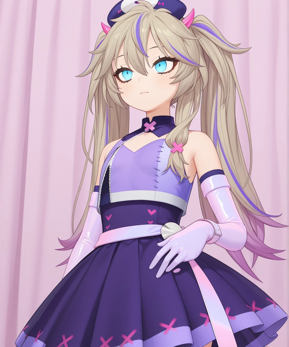 kasukabe_tsukushi,Long eyelashes, Lower eyelashes, purple mesh bangs, Flaxen Hair, blue eye,