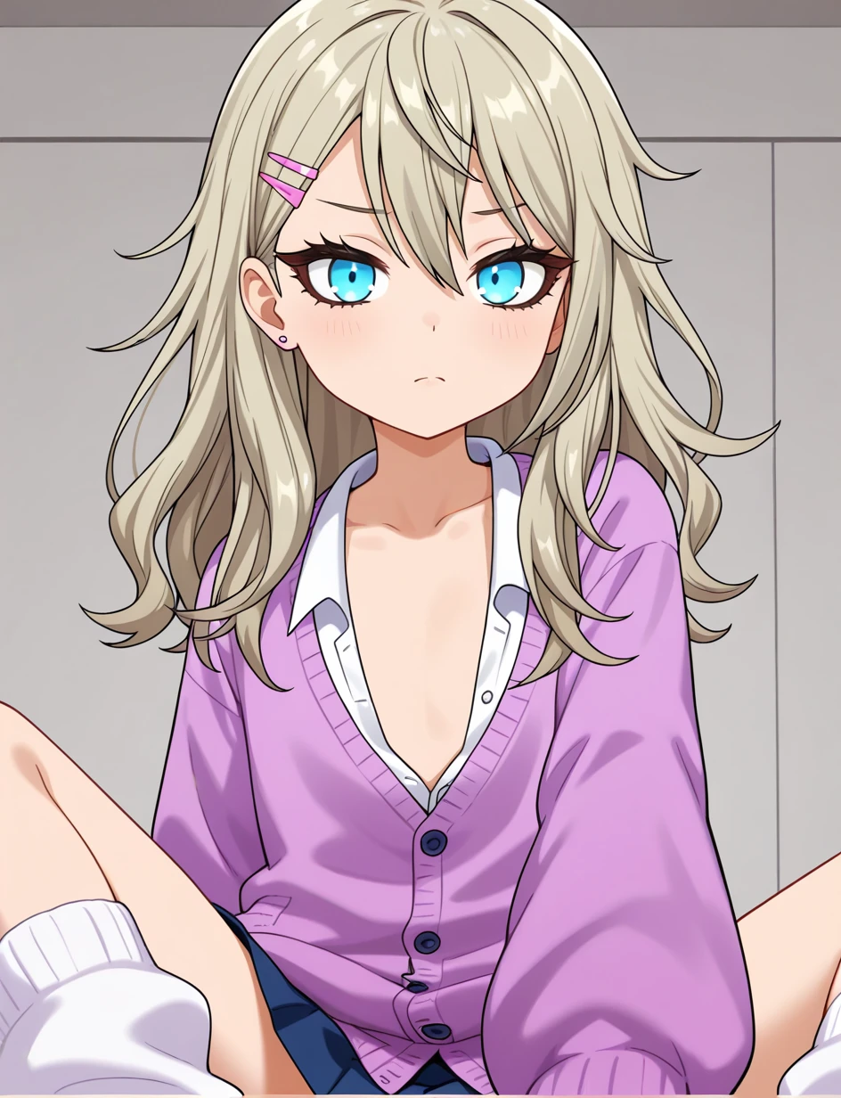 kasukabe_gyaru,school uniform, open shirt, purple cardigan, loose socks, Other