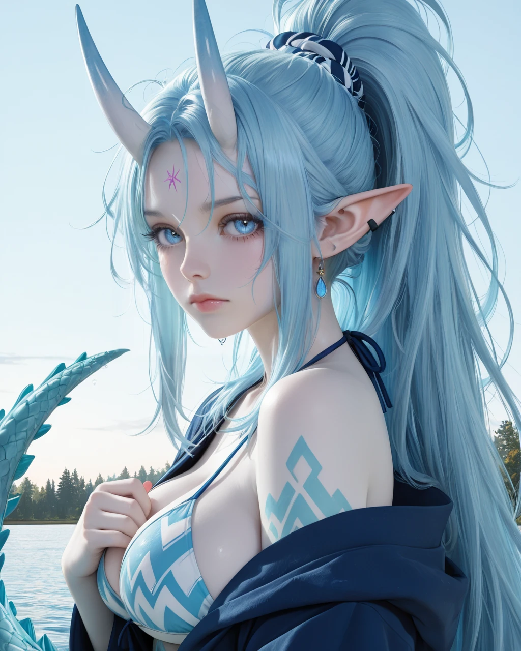 First release. Best results with trigger word: alina mizuryuu. Trained for SFW and NSFW (. All canonical features included: long blue-cyan hair, oni horns, draconic elf ears, dragon tail, tribal tattoos, piercings, gold feather earrings, water droplet iris, body.