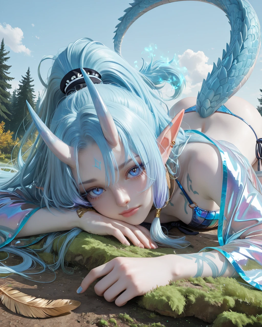 Alina Mizuryuu is an original fantasy OC: a blue-cyan haired draconic elf MILF with oni horns, long messy ponytail, tribal tattoos, dragon tail, gold feather earrings, multiple piercings, and water-droplet irises. Trained for both SFW and NSFW content (mature themes, feet focus, seductive poses, dominant tsundere personality). Use trigger tag “alina mizuryuu” for best consistency. Style: anime, fantasy, high detail, versatile (nudity, lingerie, magic, forest, bedroom, etc.). All prompts should include core tags for full fidelity.