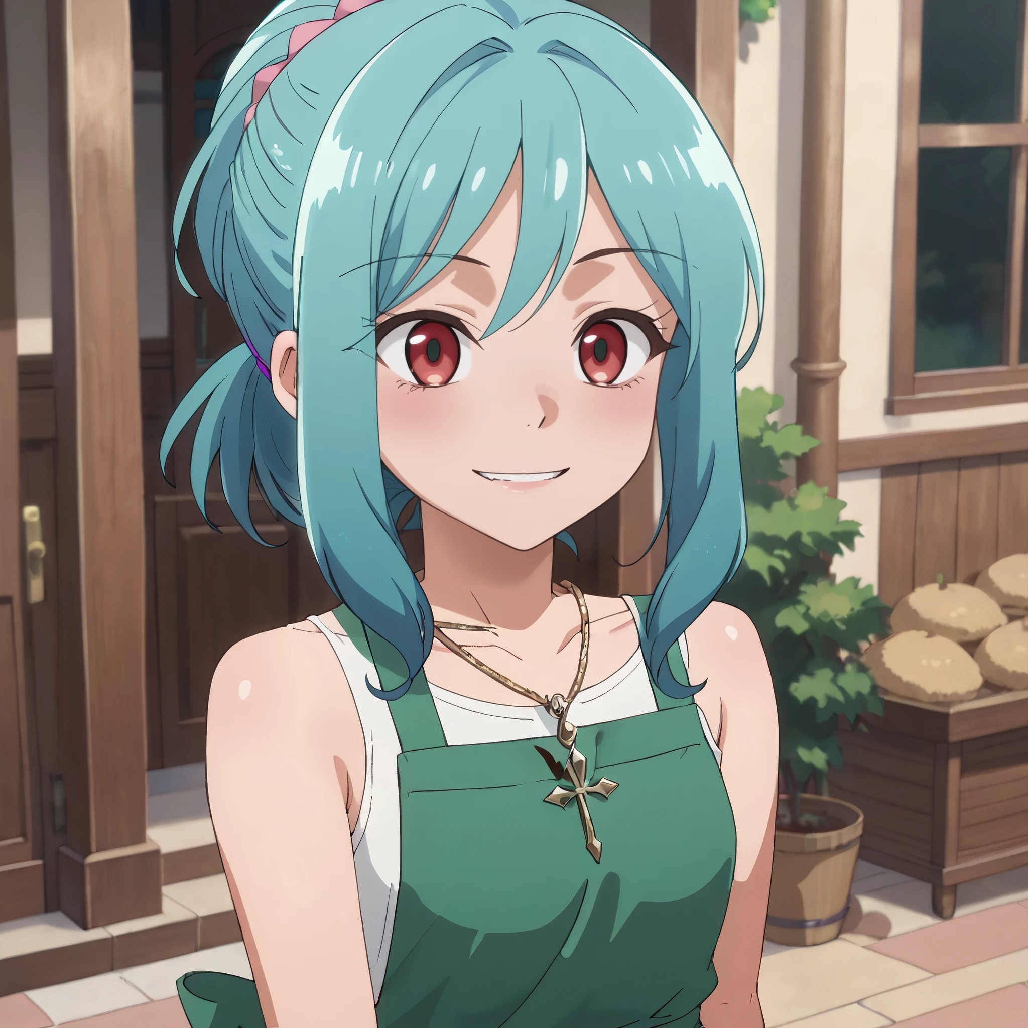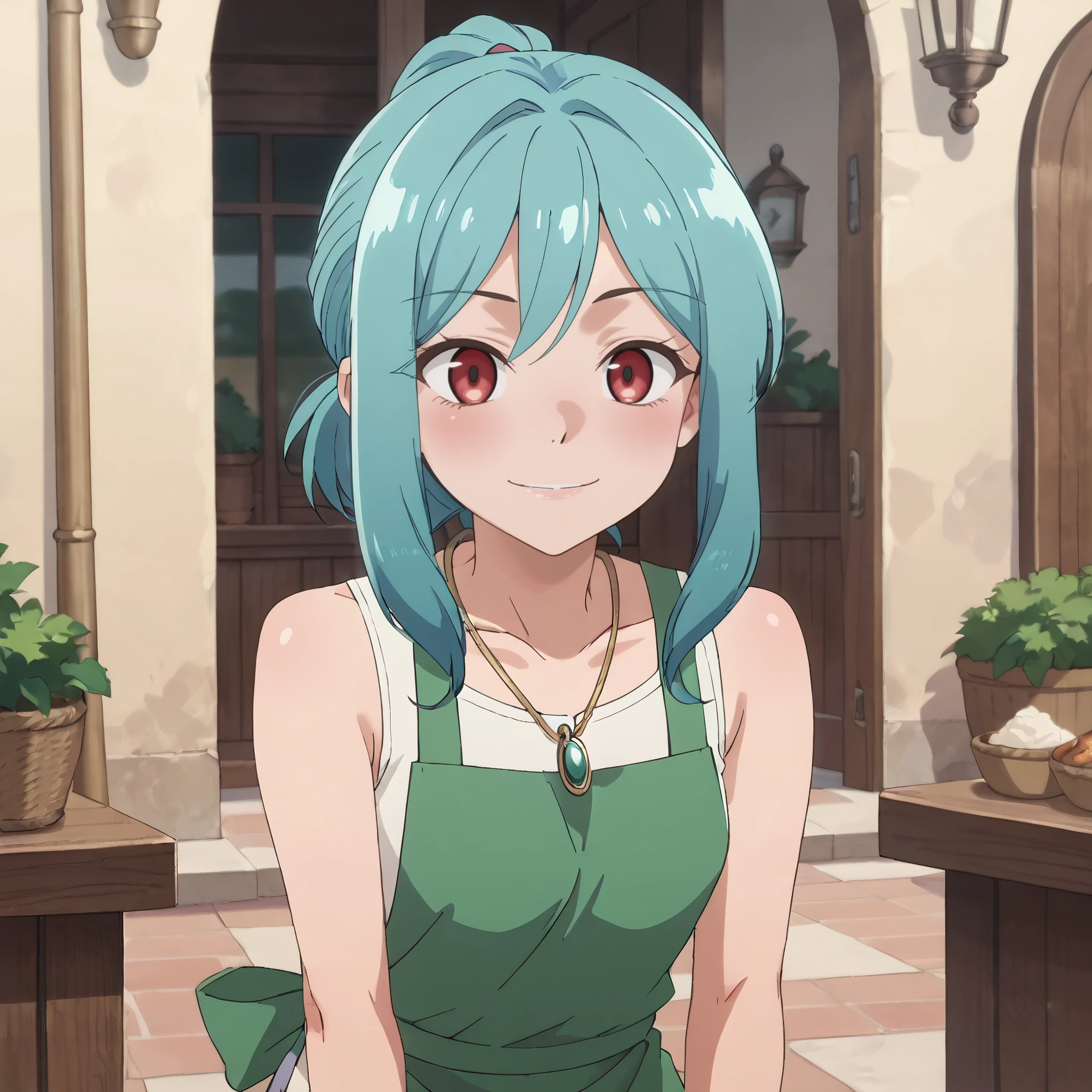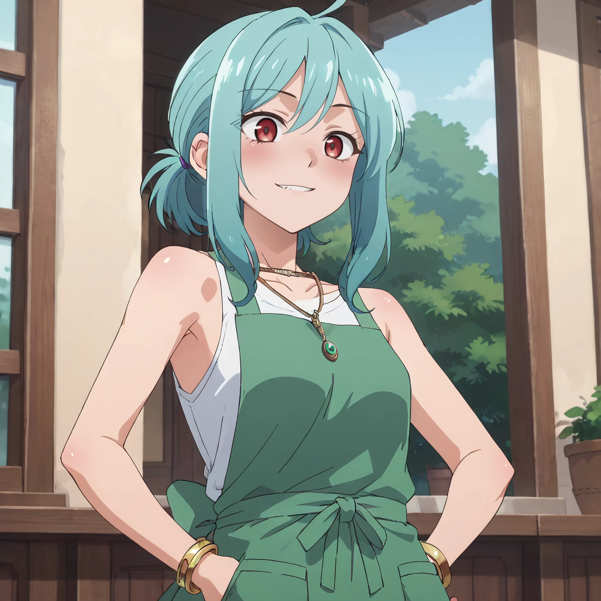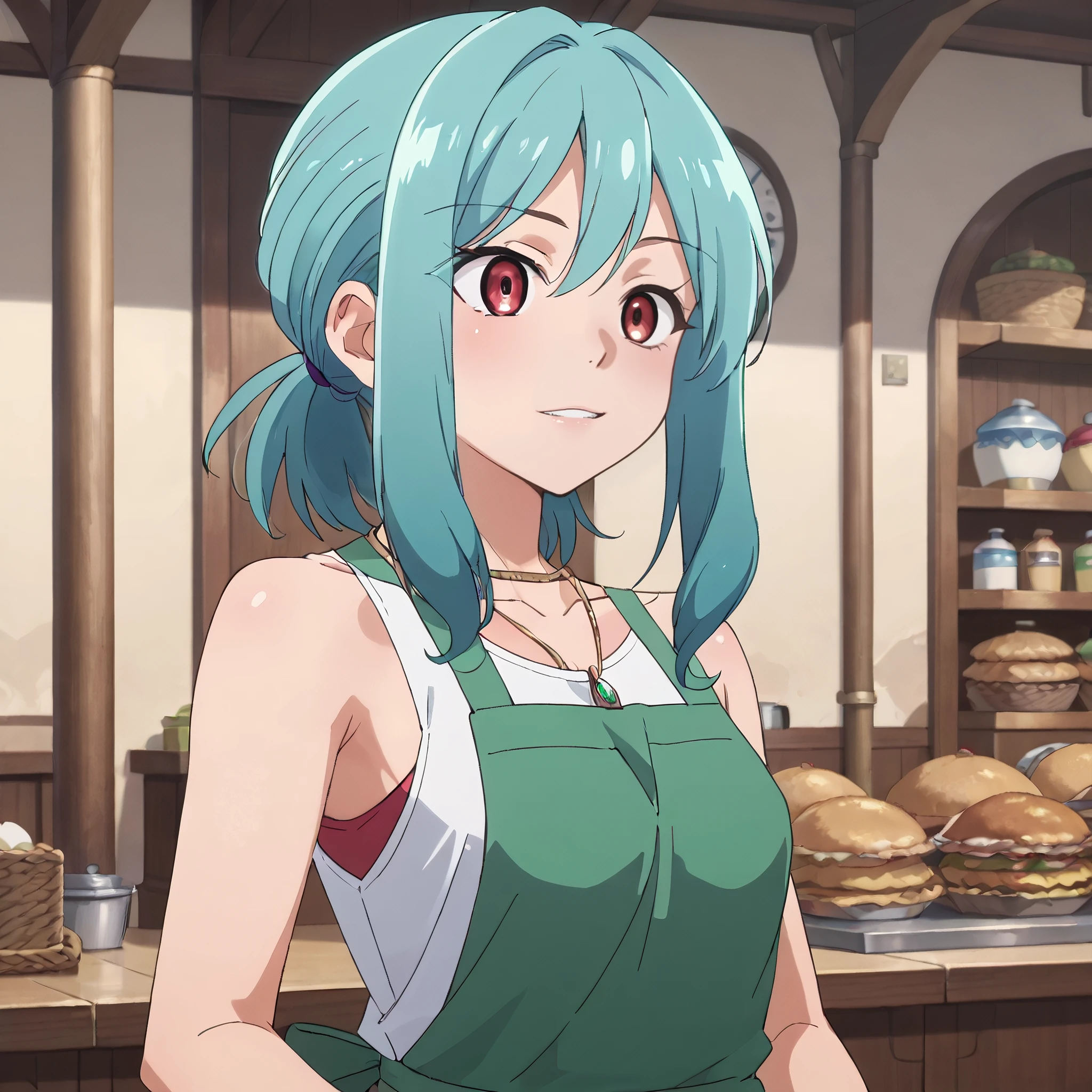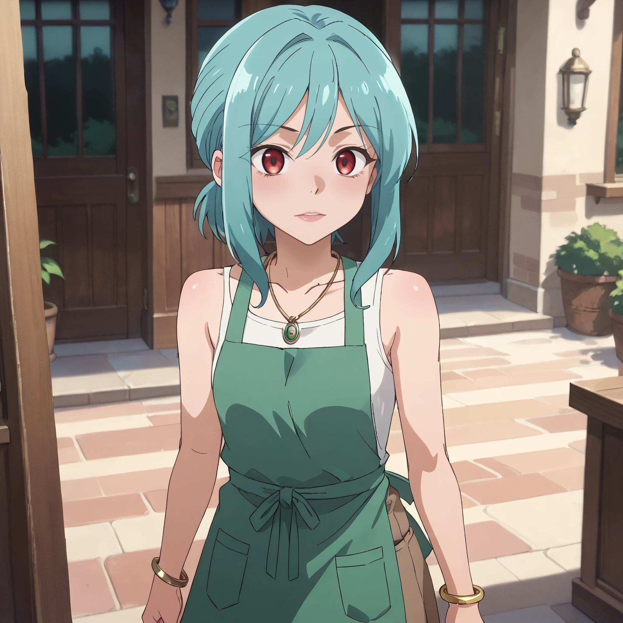 collarbone, necklace, shirt, bracelet, jewelry, bare shoulders, sleeveless, tank top, brown tanktop, apron, green apron,