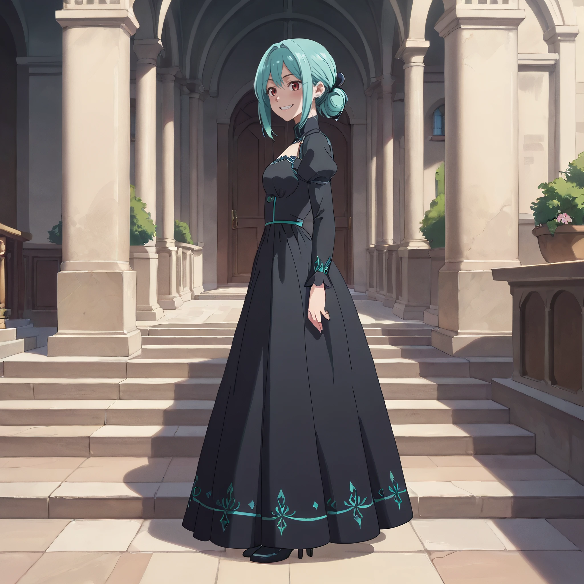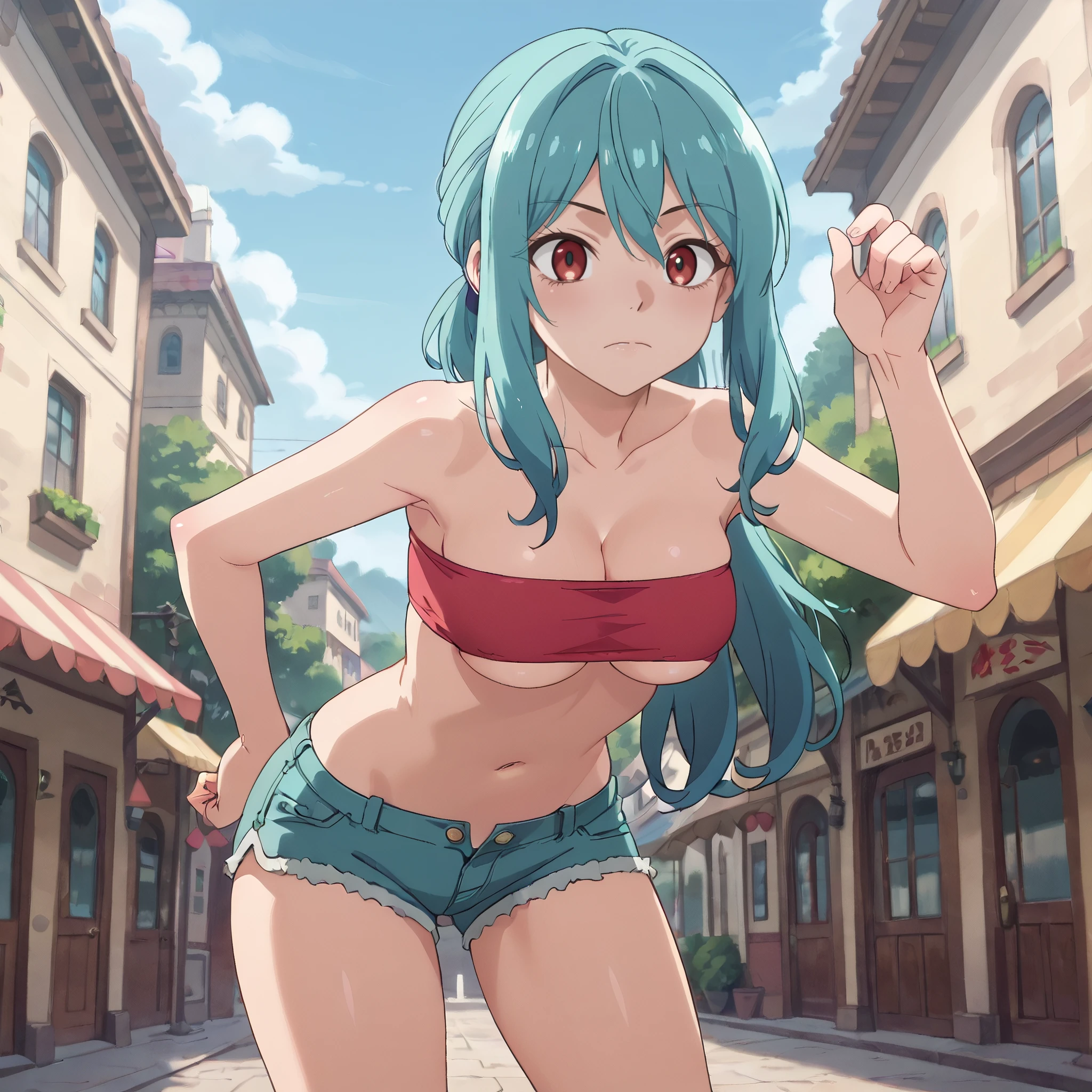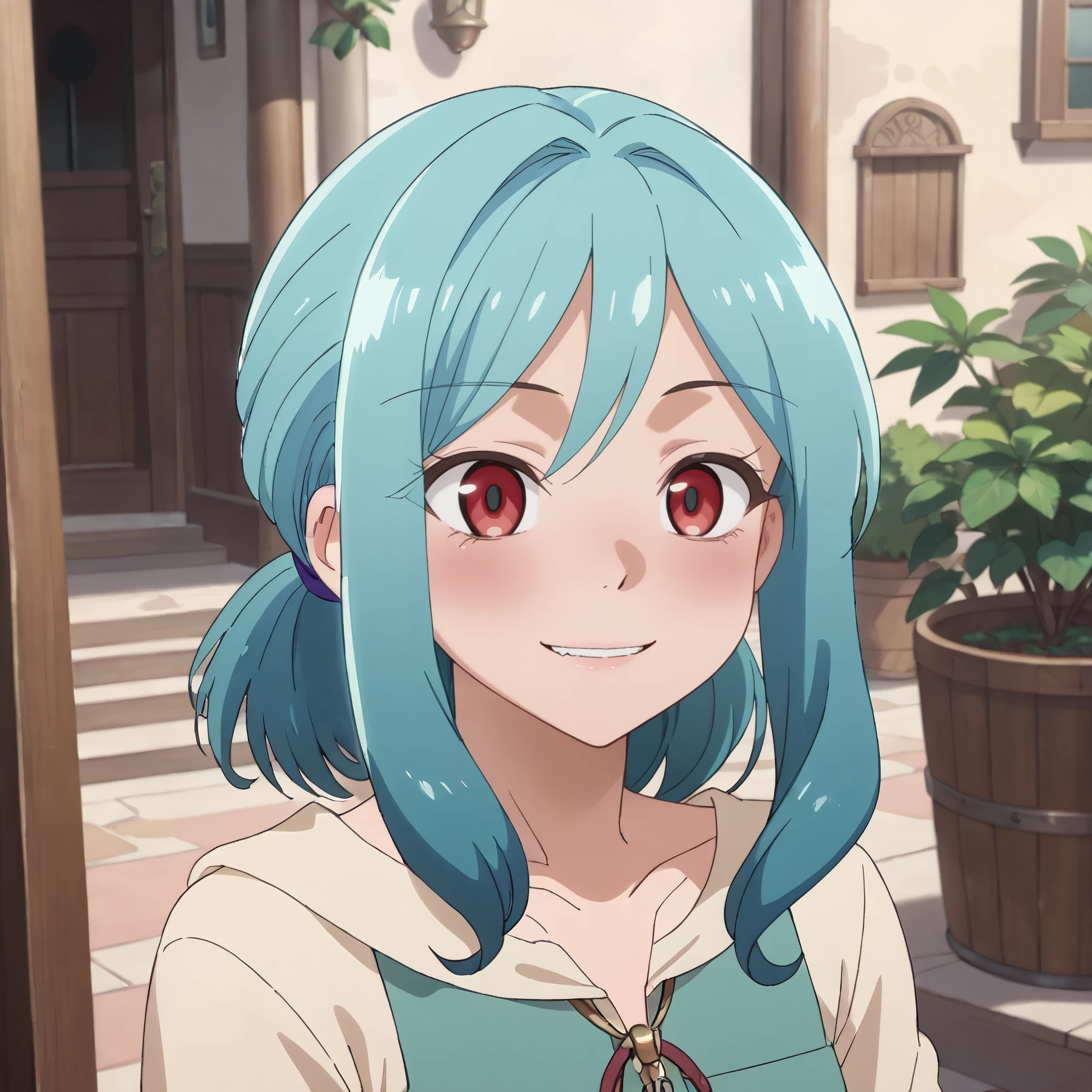A4OFruitSeller, aqua hair, bangs, red eyes, eyebrows visible through hair, long hair, sidelocks, hair between eyes,