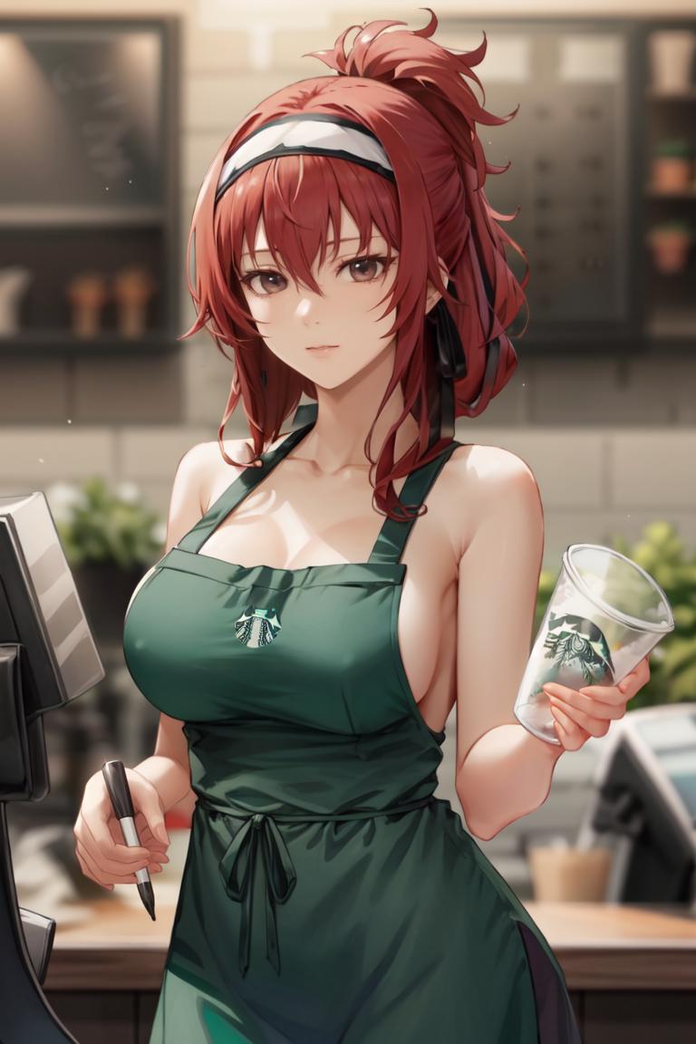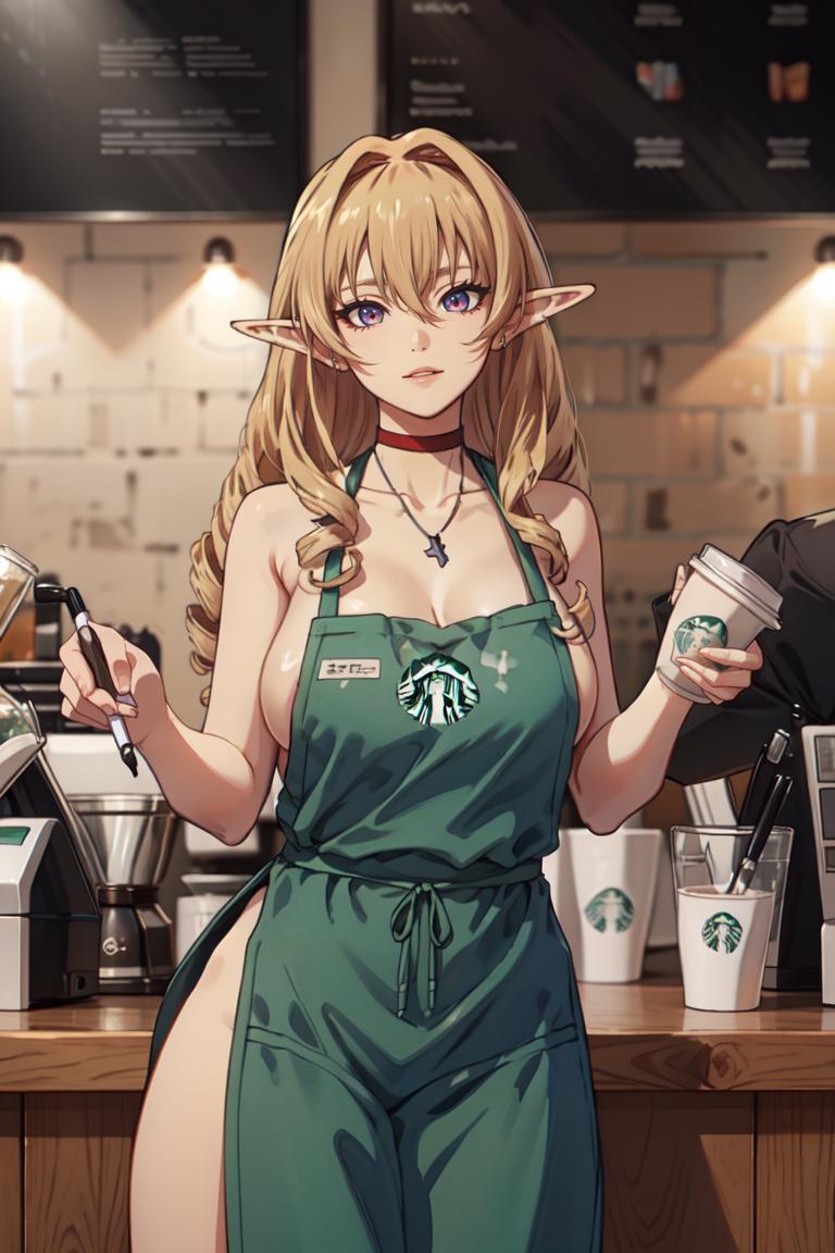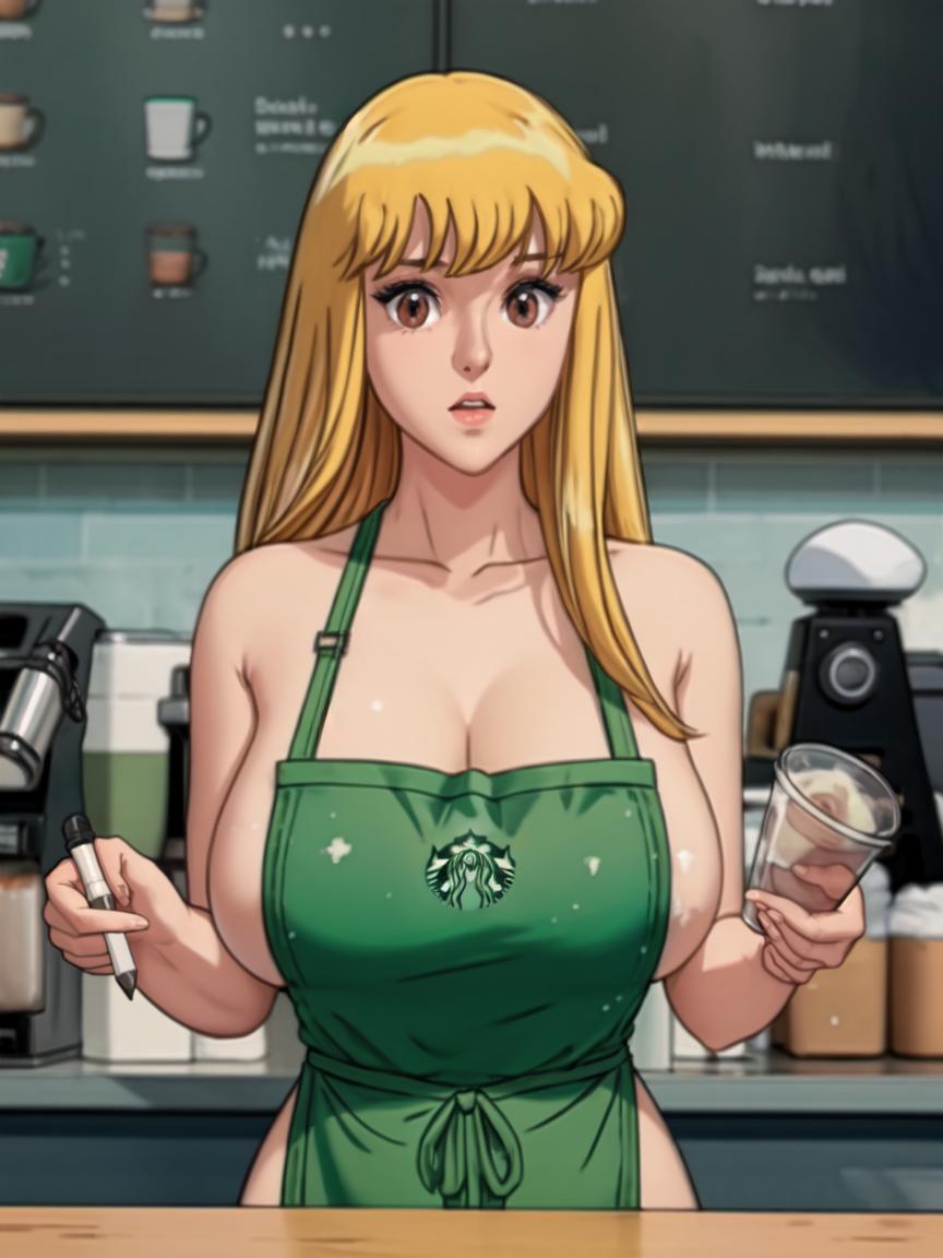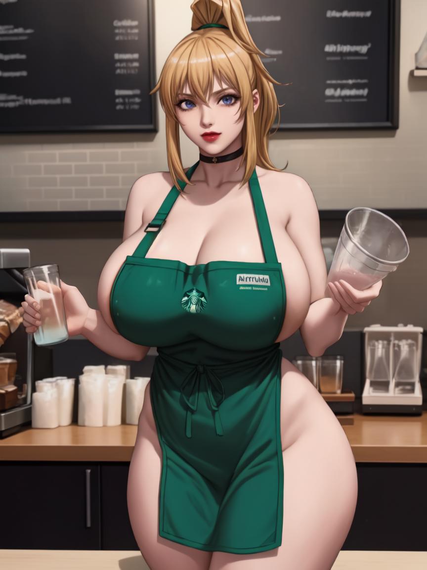 MEME PROMPTS1girl,green_apron, starbucks,naked_apron, cafe,apron, barista, breasts, cleavage, sideboob,collarbone,cup, coffee,holding, holding_cup,disposable_cup,logo_parody,sparkle,
