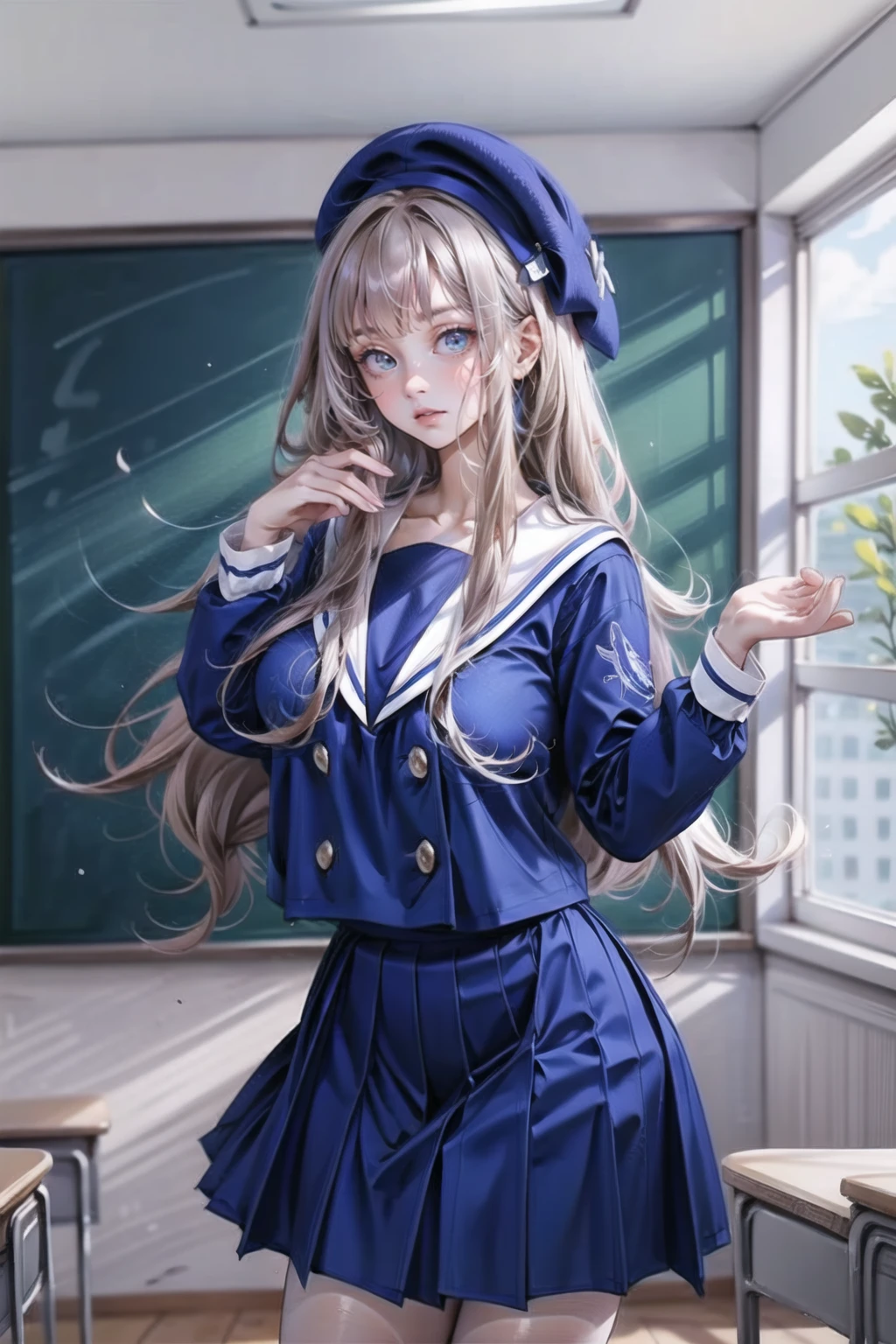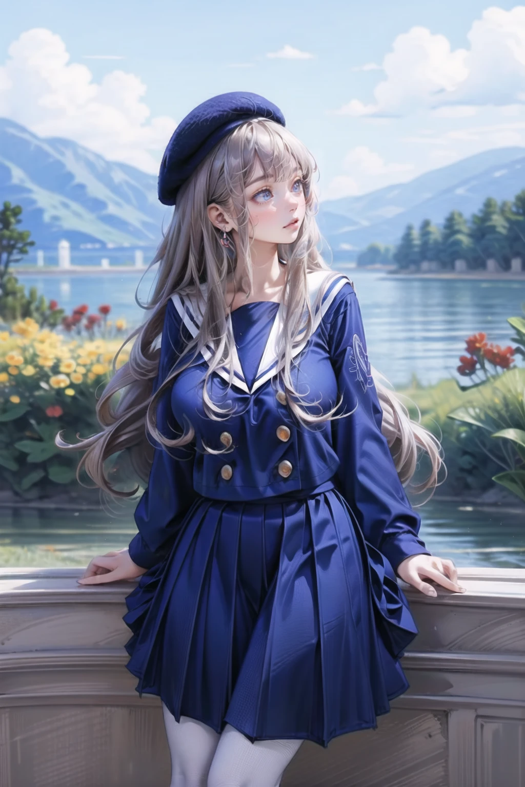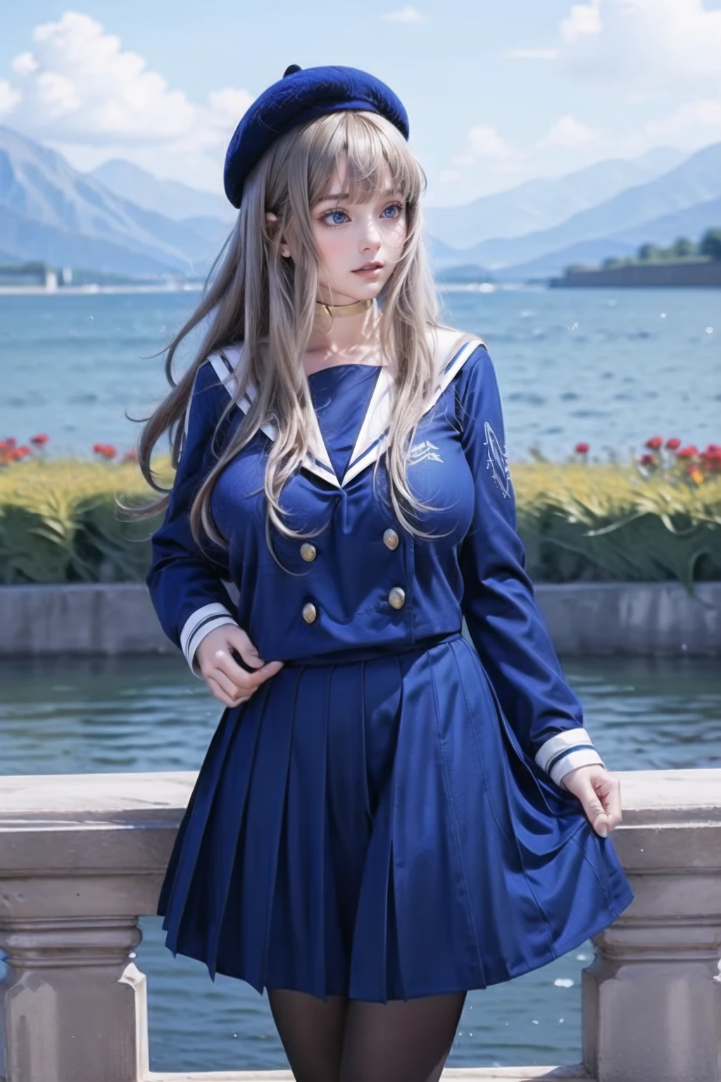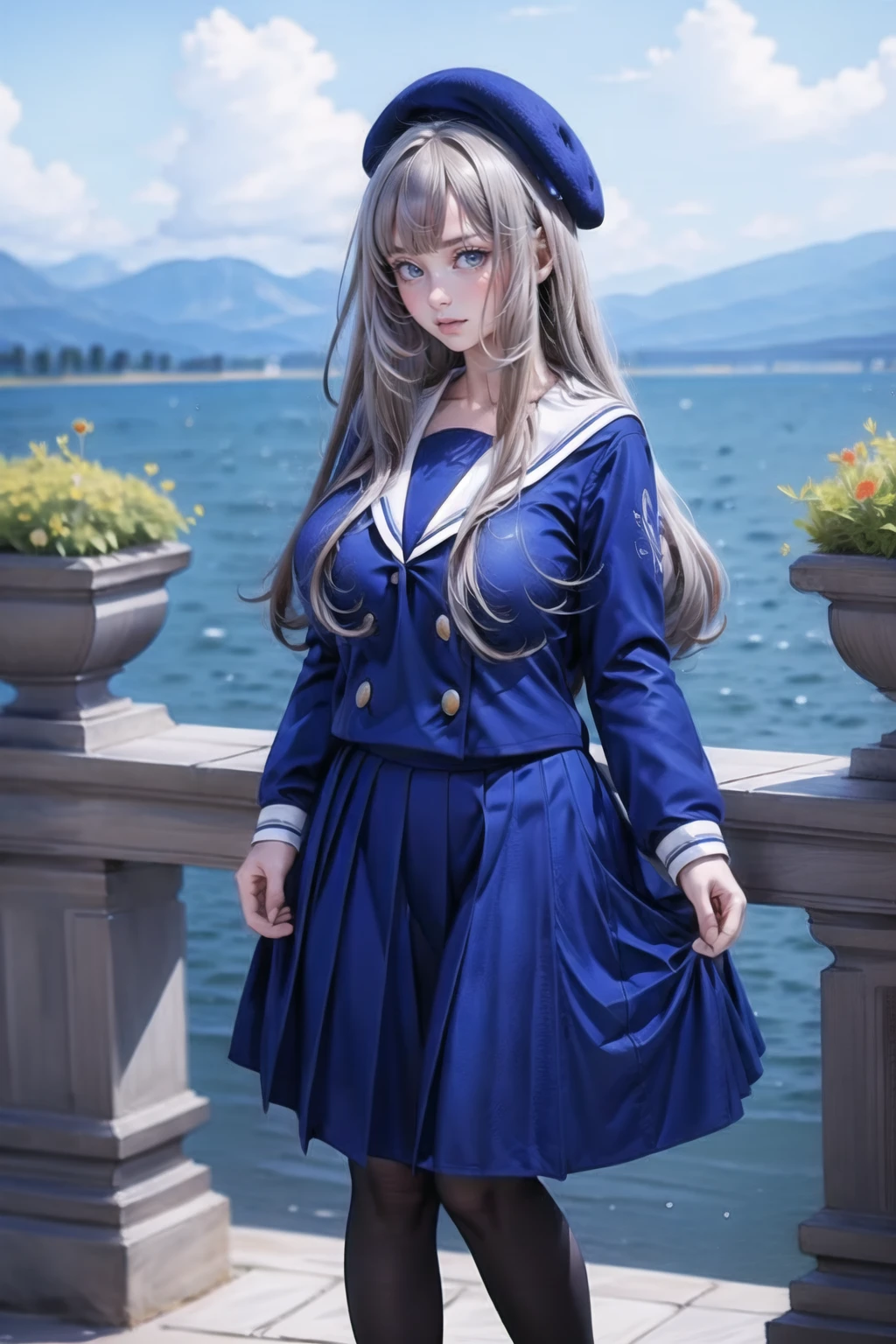 SHJ,(black pantyhose:1.1),school uniform,skirt,blue skirt,pleated skirt,blue headwear,beret,serafuku,white sailor collar,long sleeves