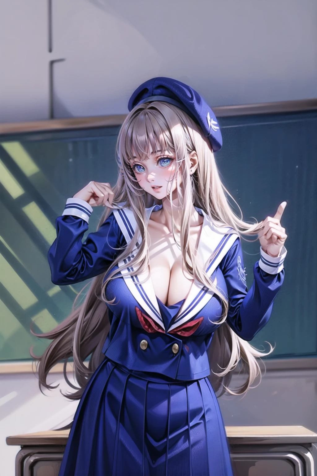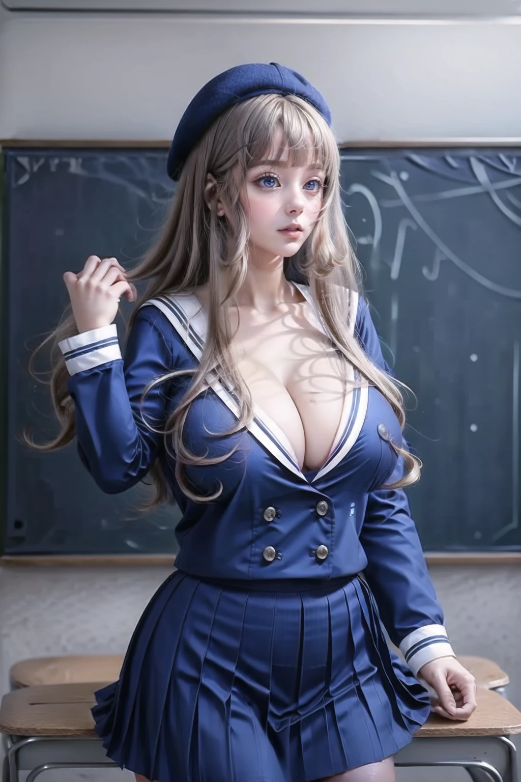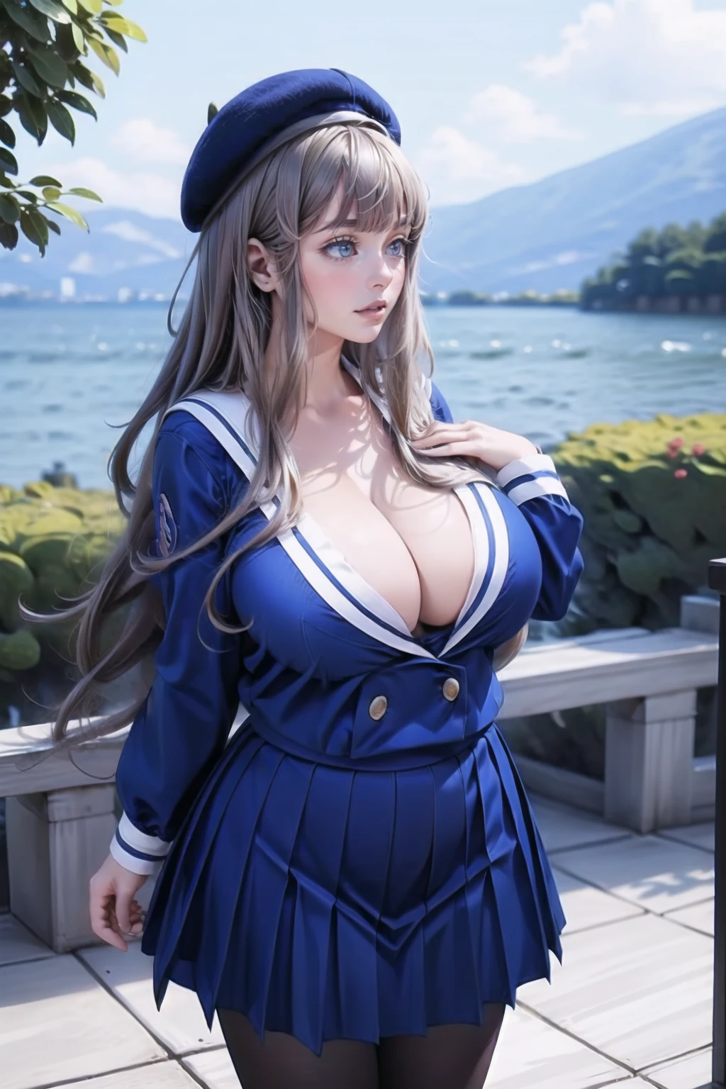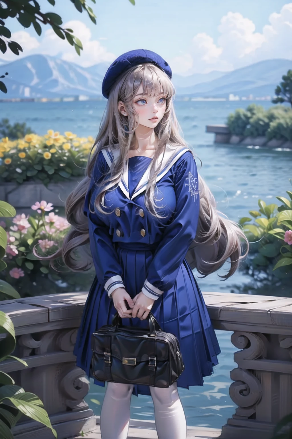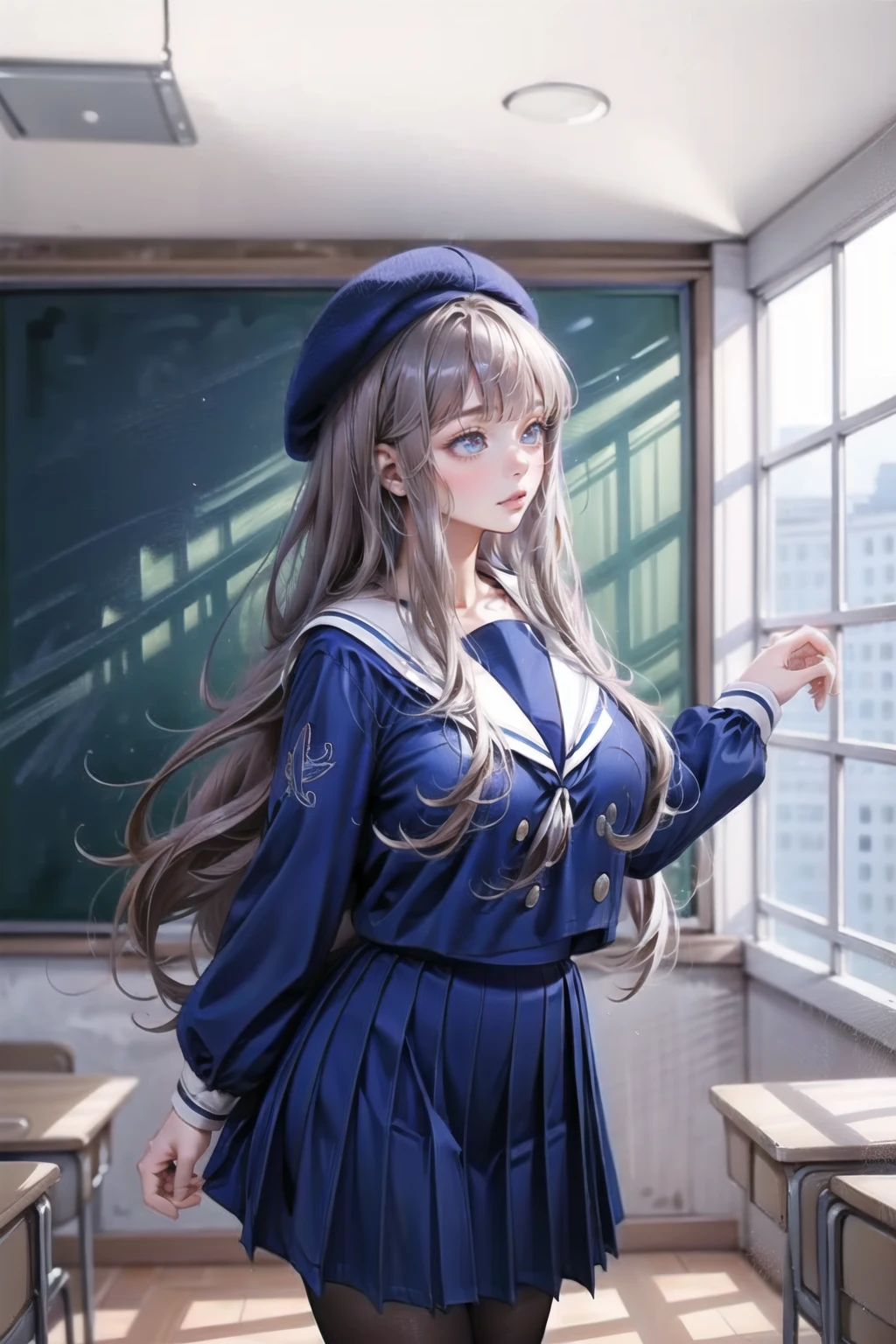 SHJ,(black pantyhose:1.1),school uniform,skirt,blue skirt,pleated skirt,blue headwear,beret,serafuku,white sailor collar,long sleeves