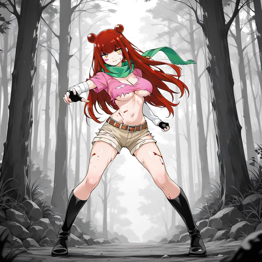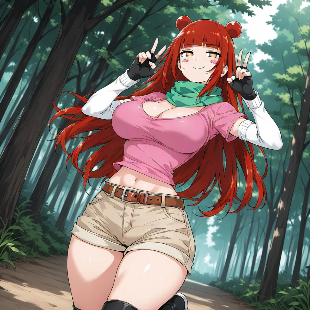 Mio-sensei, 1girl, solo, large breasts, red hair, amber eyes, blush sticker, blunt bangs, long hair, hair bun, double bun, green scarf, cherry blossom pink shirt, v-cut shirt, cleavage, navel, black gloves, fingerless gloves, white sleeves, belt, shorts, beige color shorts, ninja footwear