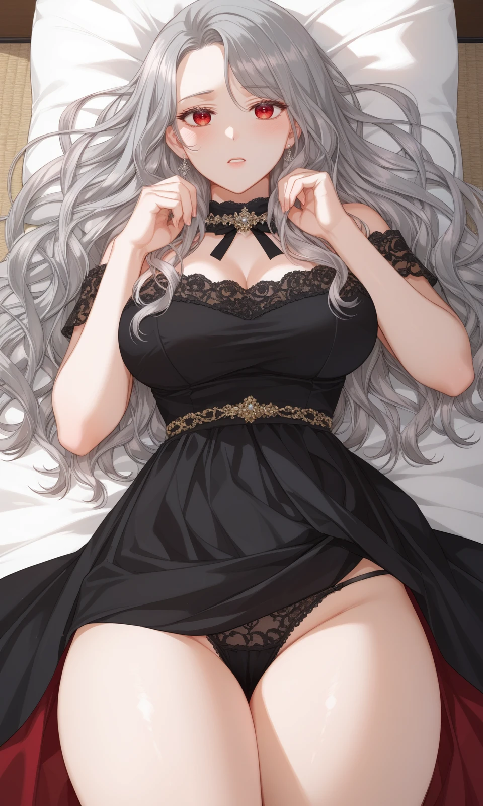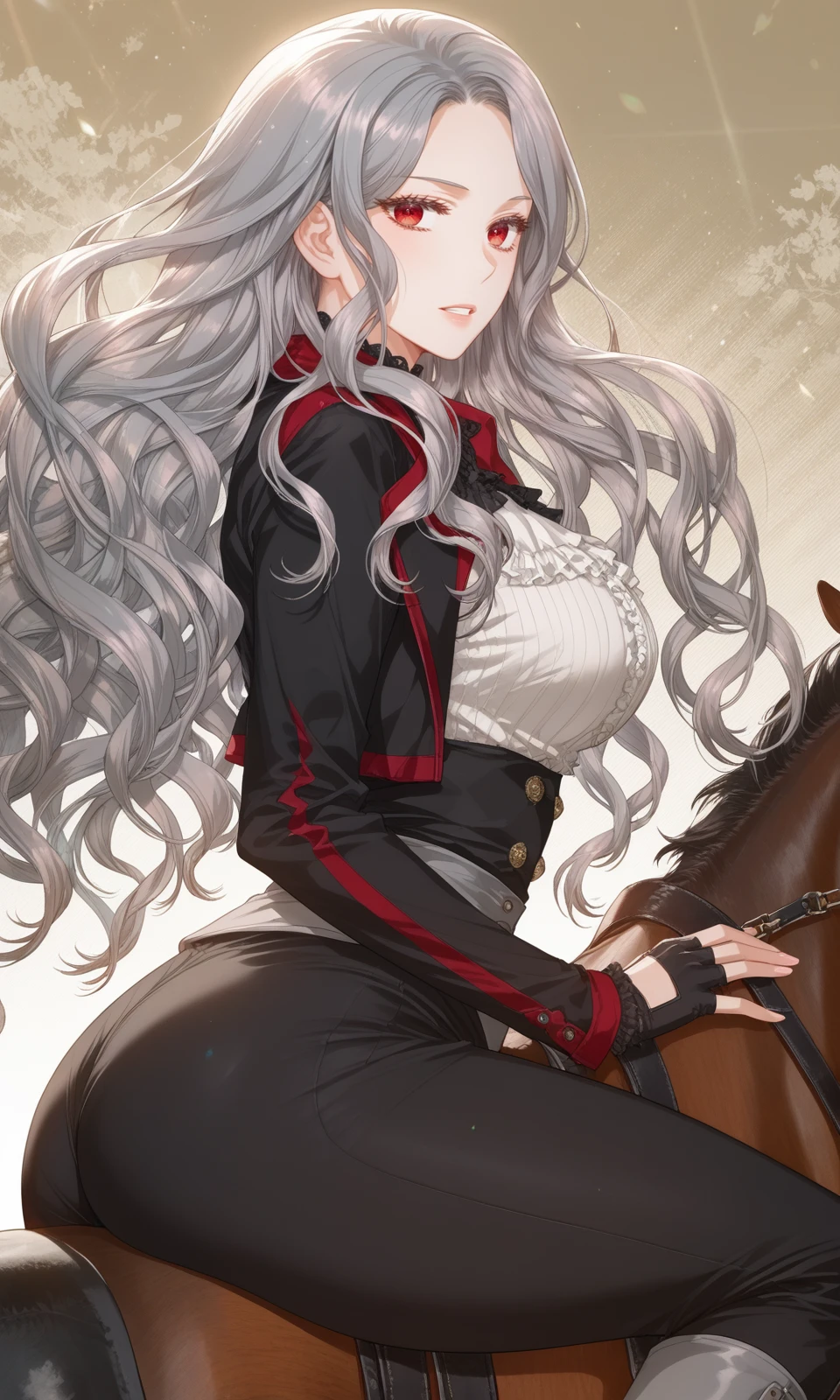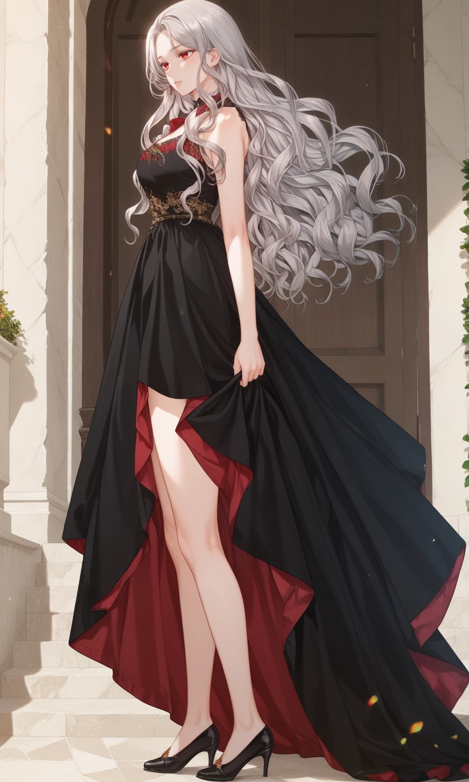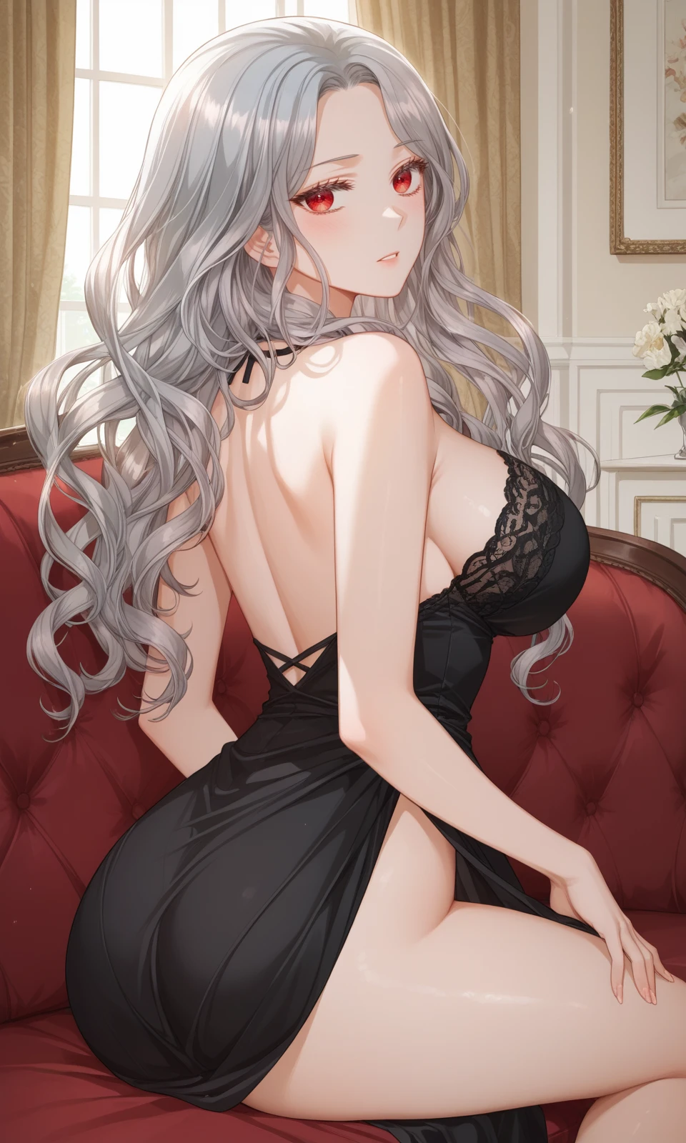 Prompt: arne, 1girl, red eyes, grey hair, long hair, wavy hair
