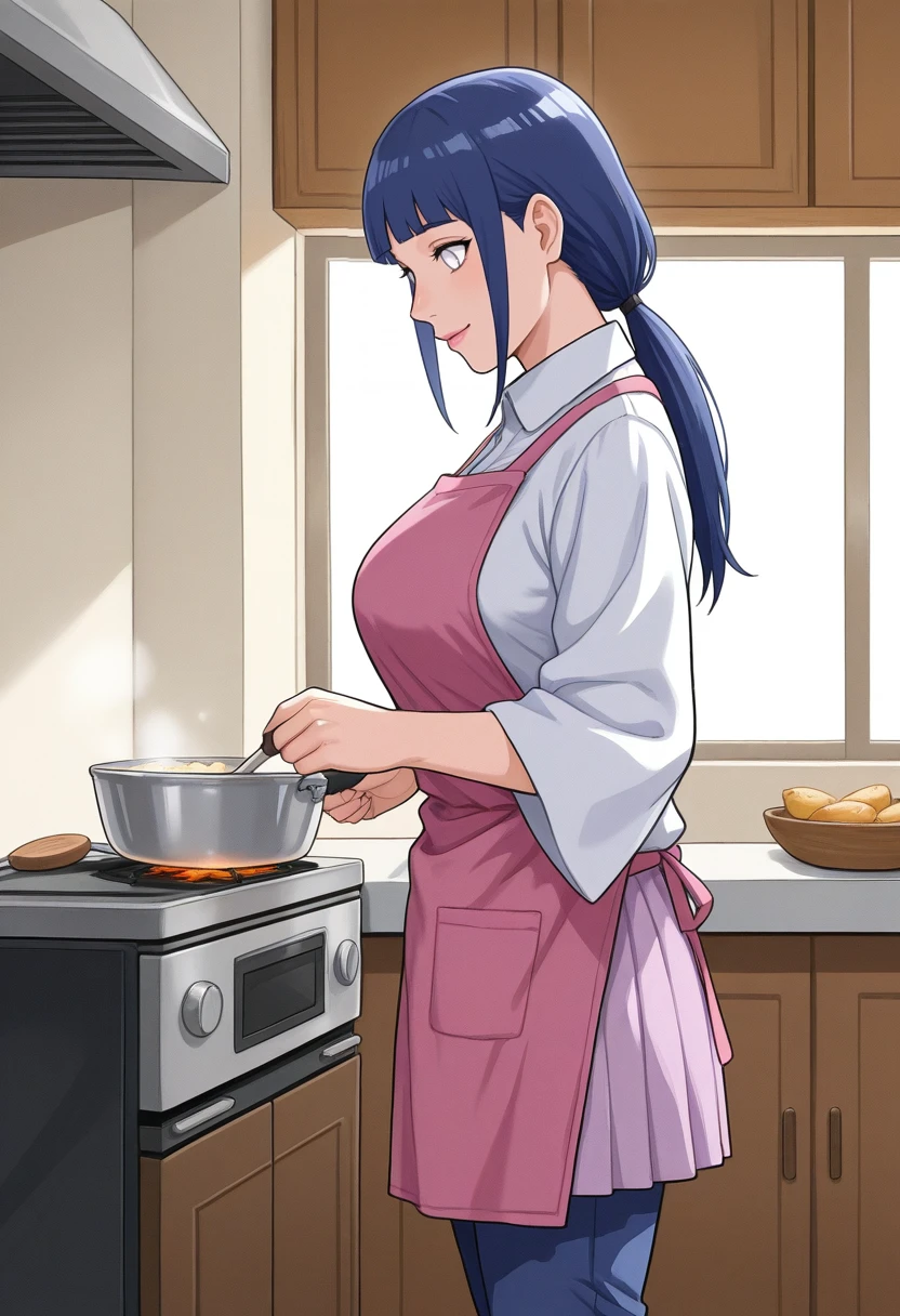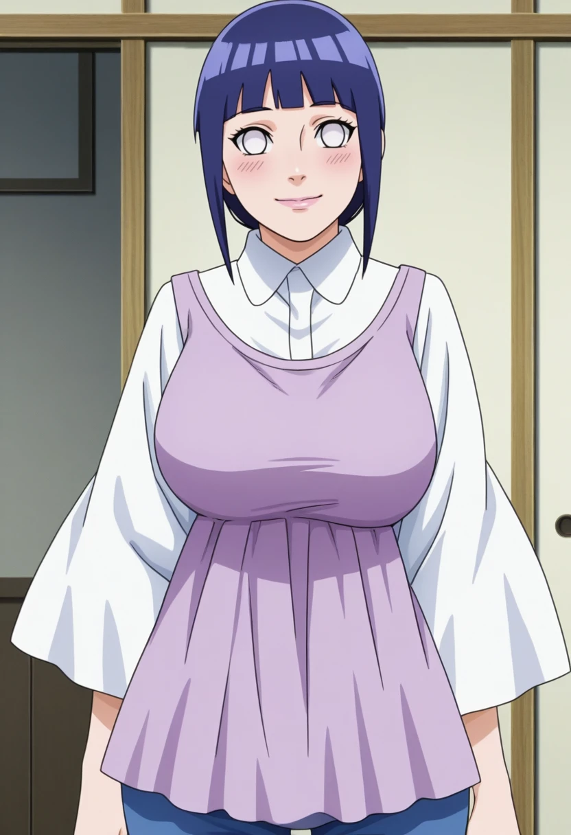 hinatam700, 1girl, solo, long hair, blue hair, blunt bangs, low ponytail, white eyes, no pupils, pink lips, large breasts, short purple dress, short pleated dress, sleeveless dress, white shirt, collared shirt, wide sleeves, blue capri pants, black sandals, black footwear, anime screencap, wide hips