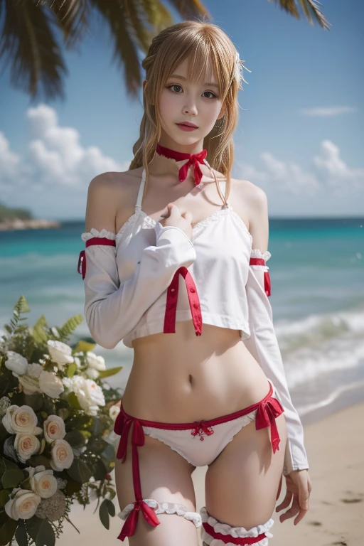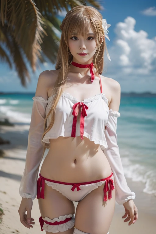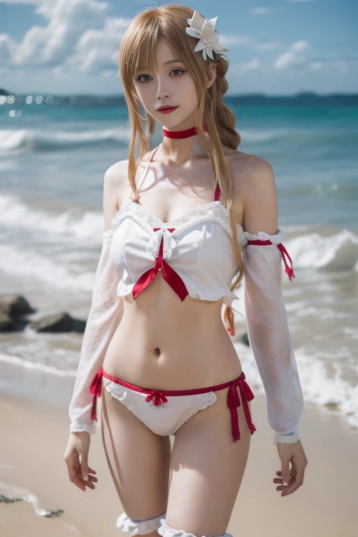 sleeves past wrists, choker, frilled panties, detached sleeves, ribbon, crop top, bow, thigh strap, side-tie panties,
