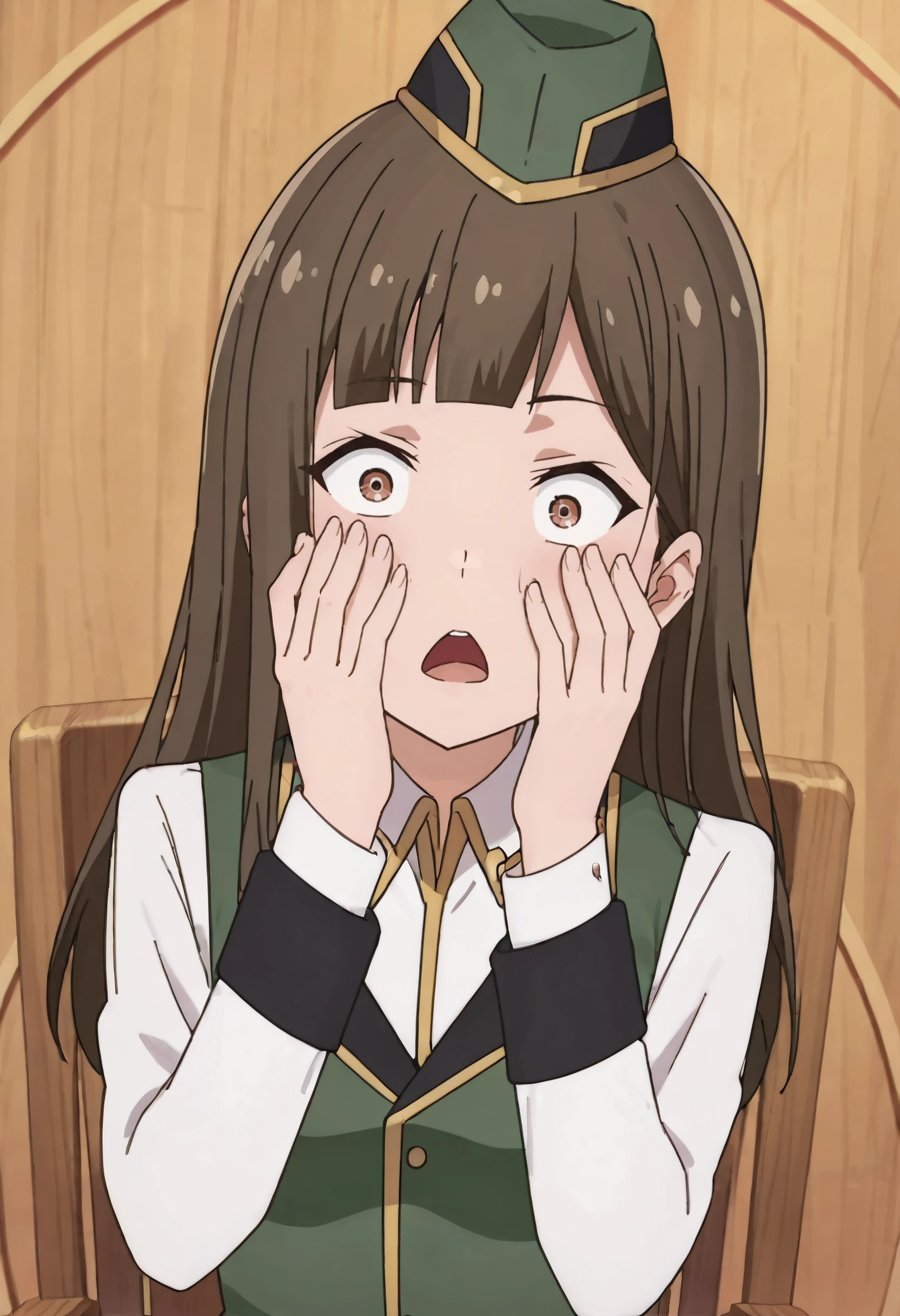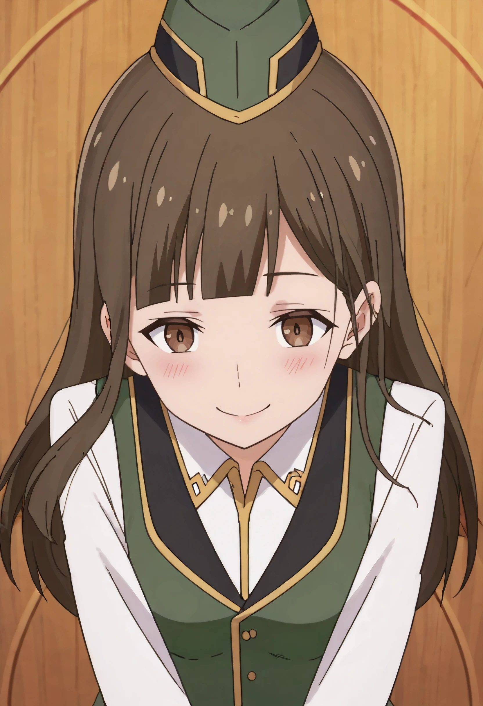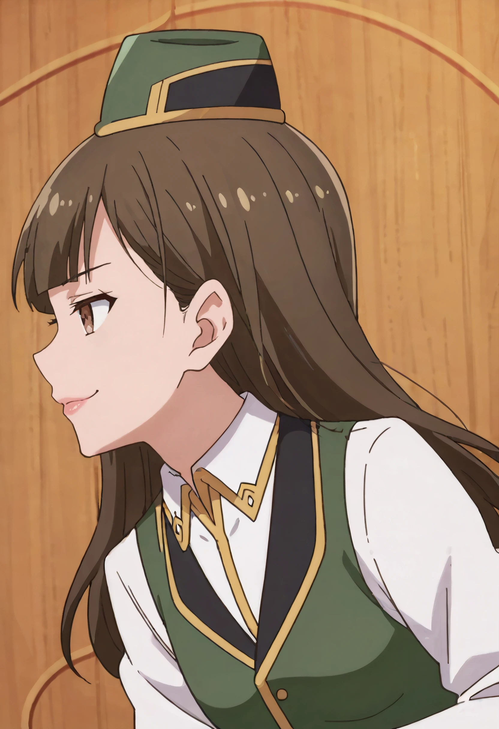 ReceptBrownOutfit, green hat, white shirt, garrison cap, green vest, long sleeves, vest, collared shirt, green headwear, military uniform, military hat, dress shirt, wing collar,
