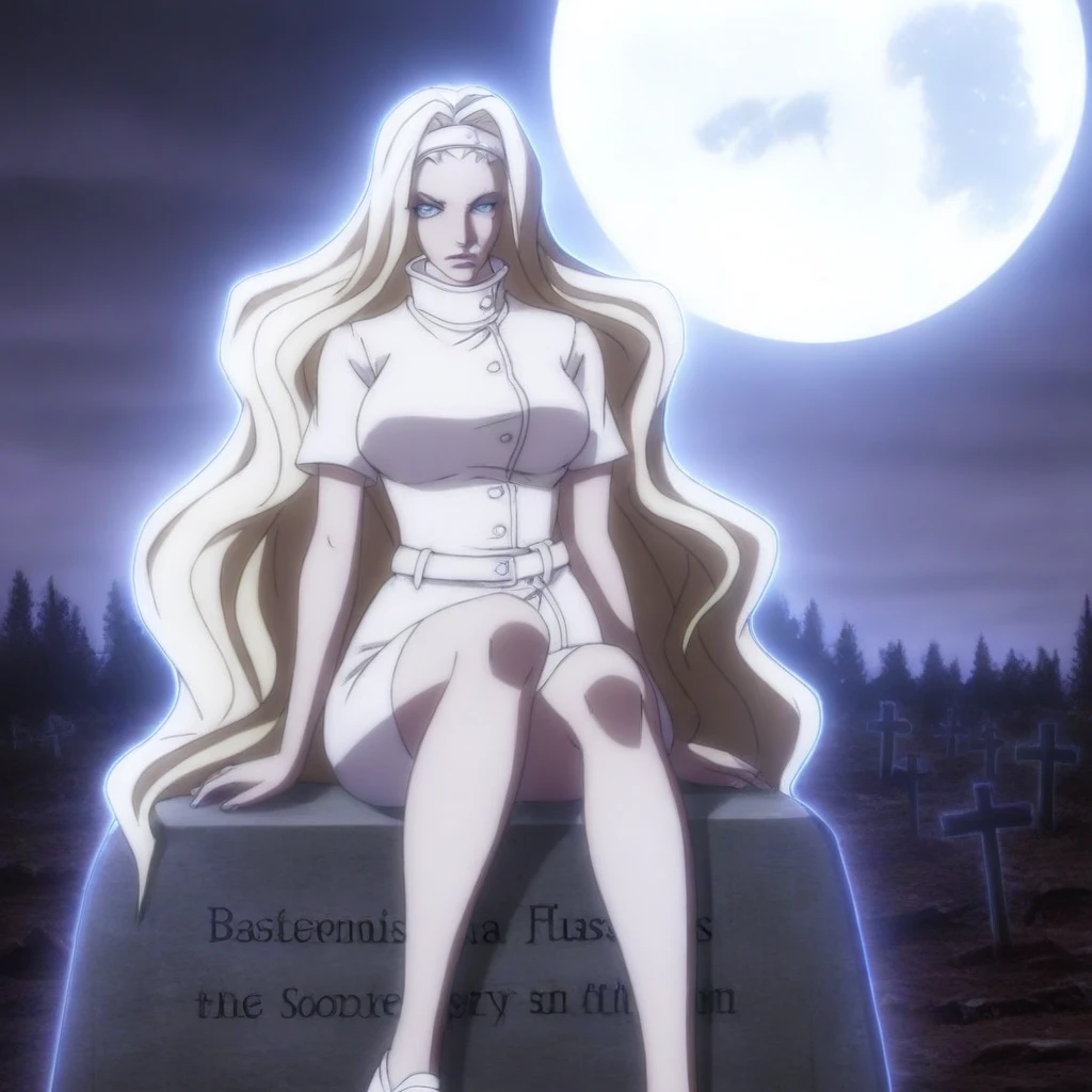score_9, photorealistic, hyper realistic, ultra detailed, high quality. Eliza_Faust_SK, light-blonde hair, very long hair, wavy hair, hair parted in the middle, very long bangs, white headband, light blue eyes, light blonde eyebrows, big breasts, thin waist, wide hips, white dress, high collar, short sleeves, white front buttons, white belt at the waist, white shoes. nighttime, full moon, old cemetery, tombstones, crosses, sinister place, will-o'-the-wisps. sitting on a tombstone, sexy pose, sensual expression. cinematic composition, cinematic lighting, soft natural light.