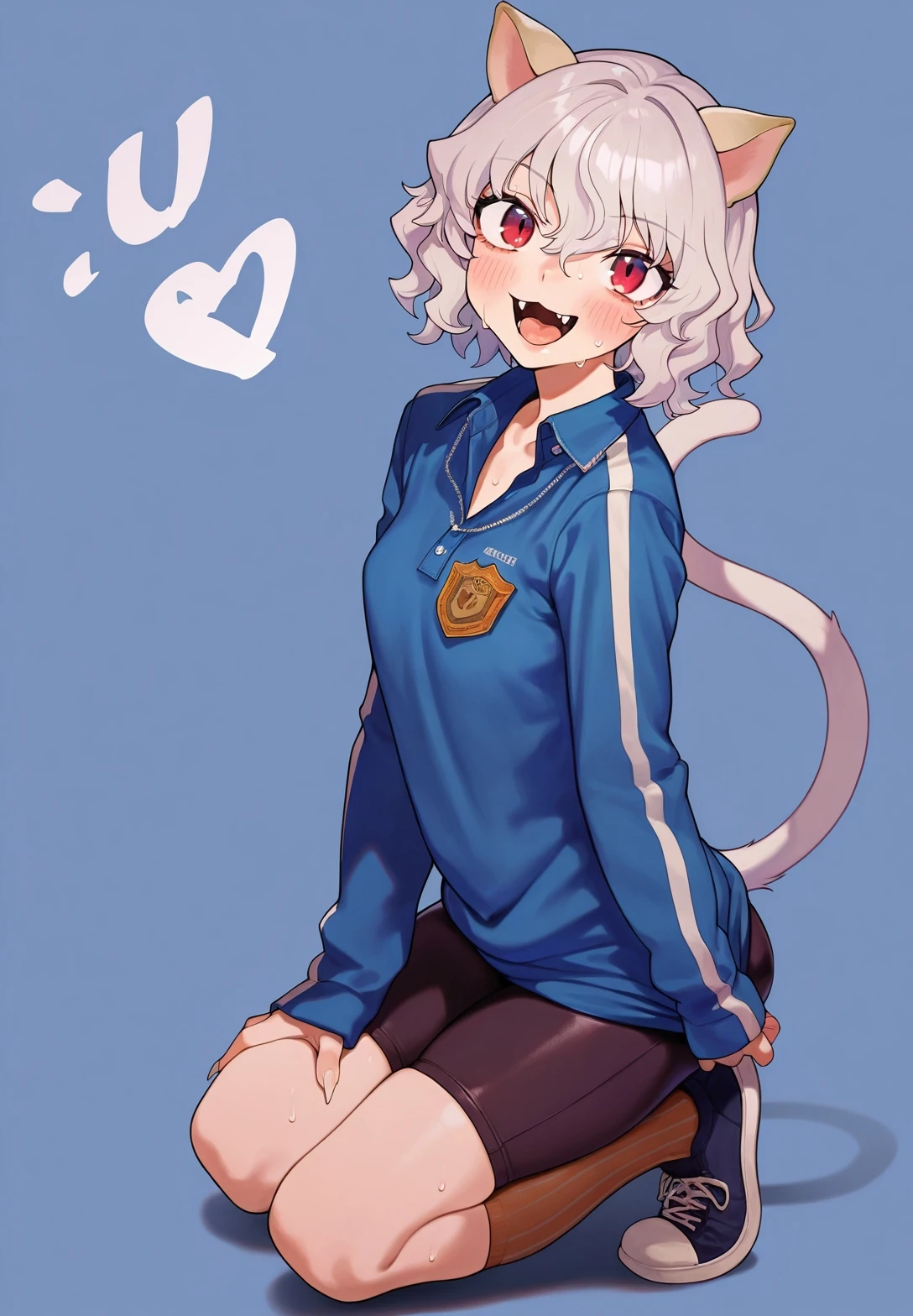 特征:cat ears,white hair,short hair,wavy hair,hair between eyes,eyebrows visible through hair,red eyes,claws,cat tail,