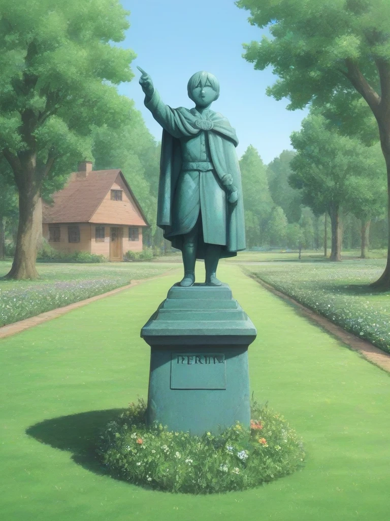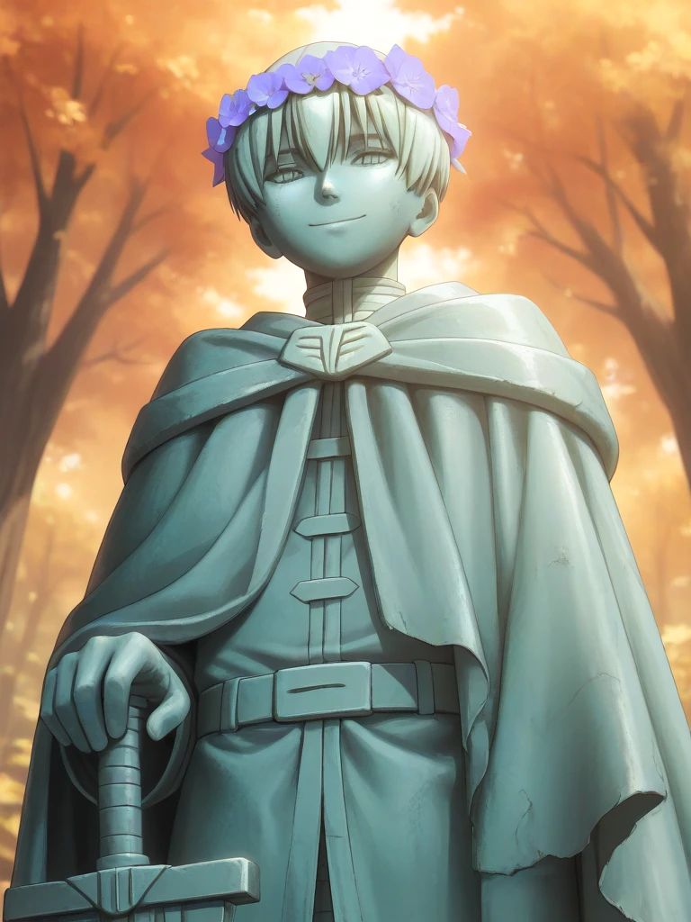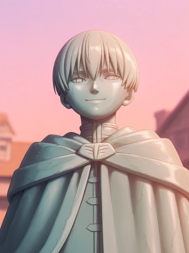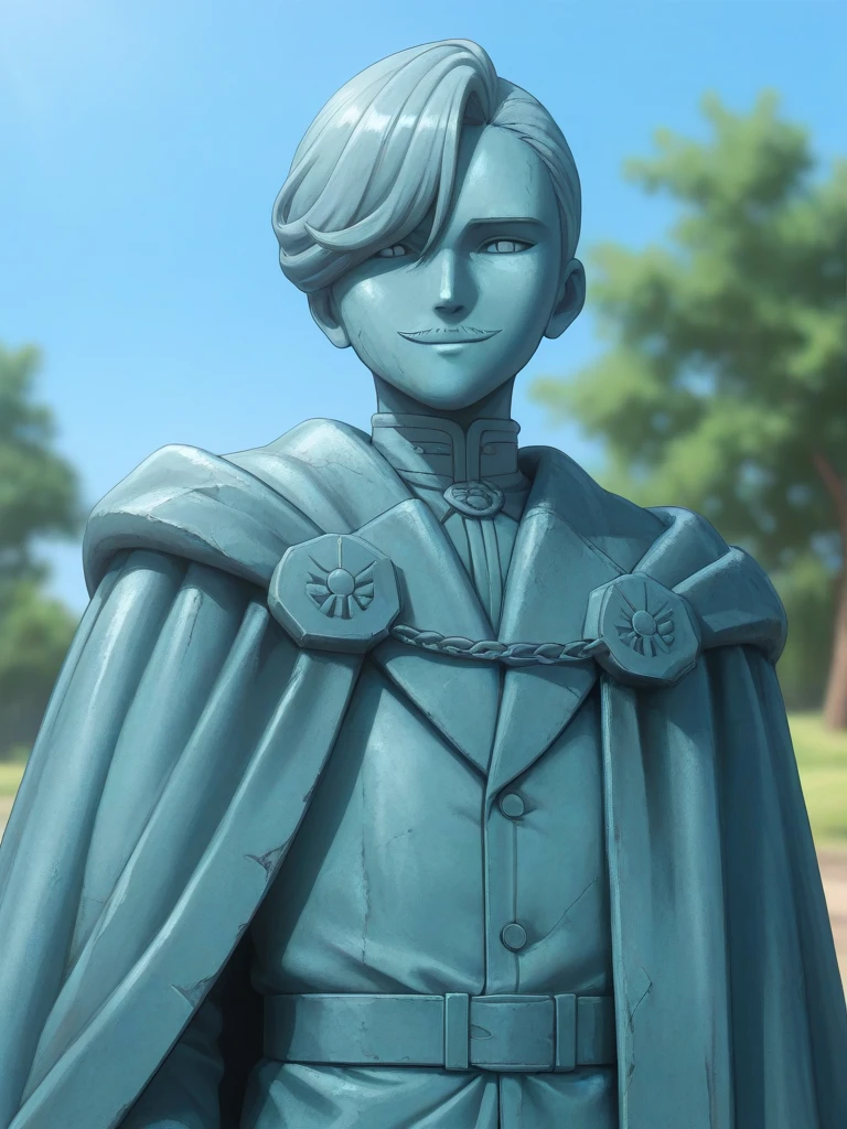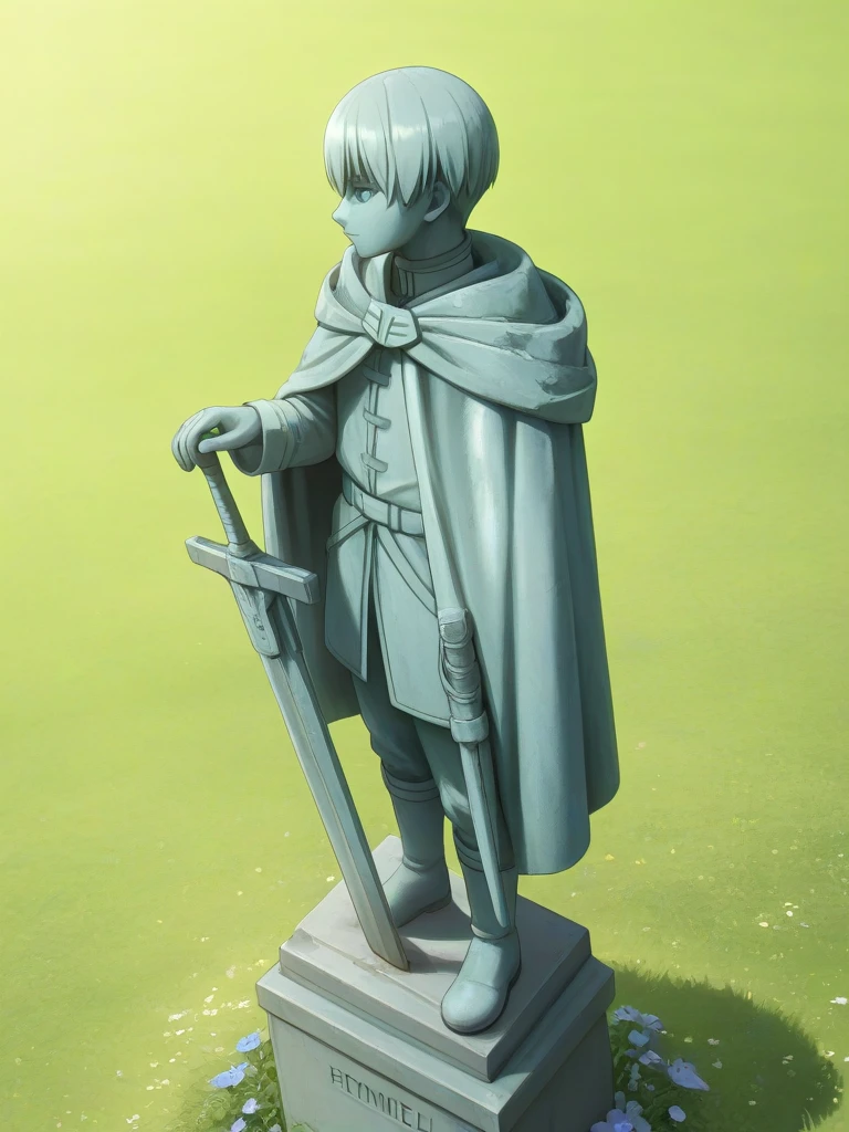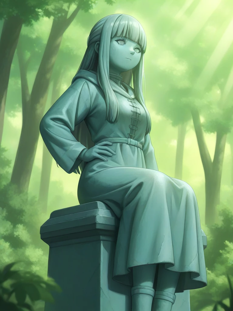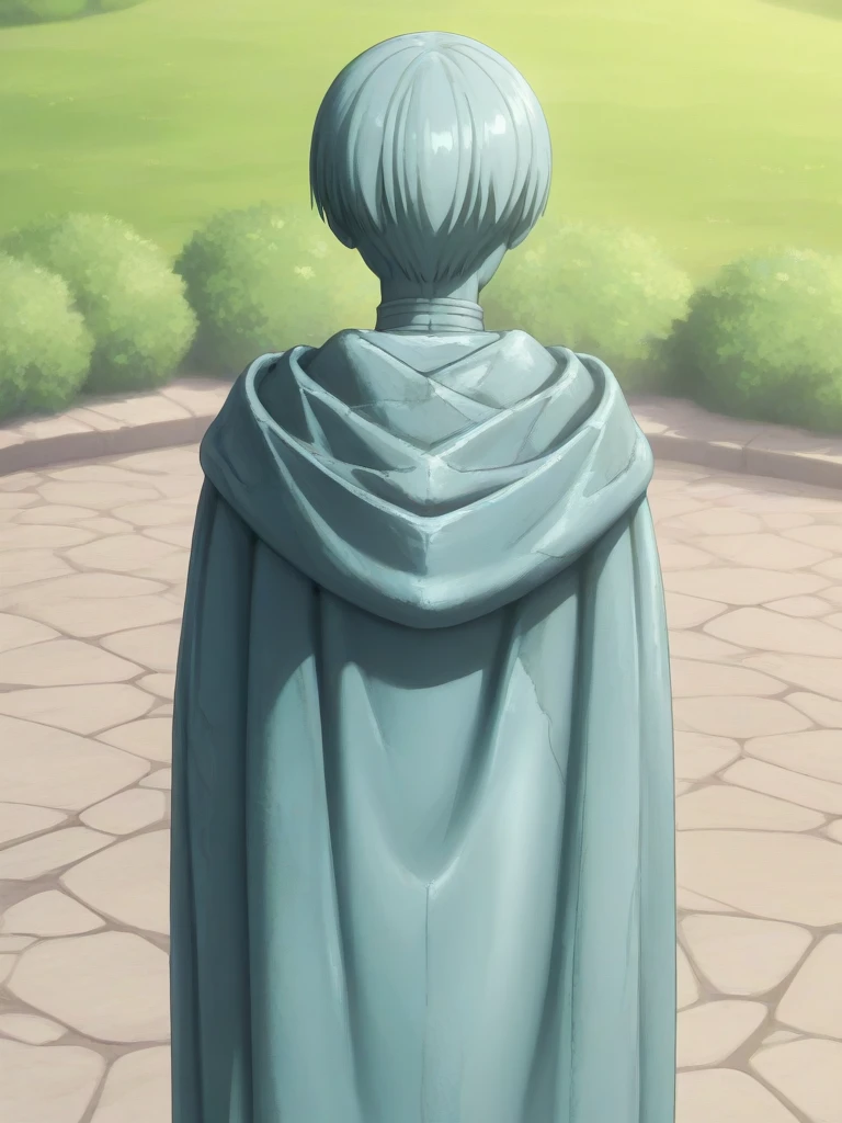 weathered statue, petrification, cracked skin, grey skin, grey hair, grey eyes, grey sclera, no pupils, outdoors,