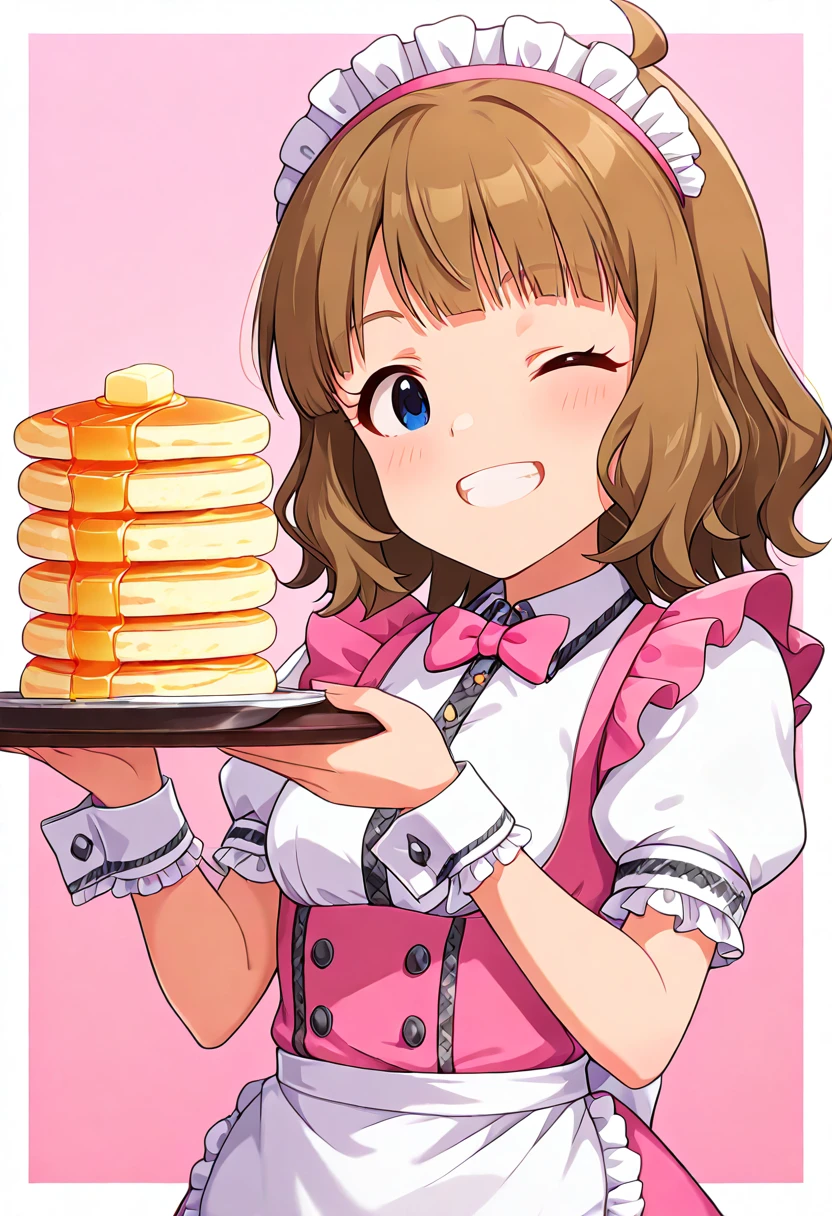 suou momoko, pritty-waitress, ahoge, short hair, brown hair, light brown hair, blue eyes, eyebrows visible through hair, wavy hair, blunt bangs, pink dress, frilled dress, white shirt, collared shirt, puffy short sleeves, frilled sleeves, waist apron, frilled apron, maid apron, white apron, pink skirt, frilled skirt, pink bowtie, maid headdress, wrist cuffs, back bow, white legwear, thighhighs, pocket, buttons