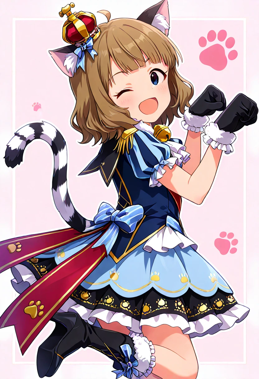 suou momoko, gatto-marciale, ahoge, short hair, brown hair, light brown hair, blue eyes, eyebrows visible through hair, wavy hair, blunt bangs, cat girl, cat ears, animal ear fluff, frilled dress, blue dress, layered dress, vest, frilled sleeves, puffy short sleeves, puff and slash sleeves, fur-trimmed collar, black skirt, frilled skirt, paw print skirt, red sash, epaulettes, gold trim, blue bow, striped bow, neck bell, white neckerchief, blue bowtie, striped bowtie, mini crown, tilted headwear, black gloves, frilled gloves, fur-trimmed gloves, high heel boots, black footwear, fur-trimmed boots, cat tail, striped tail, red waist ribbon