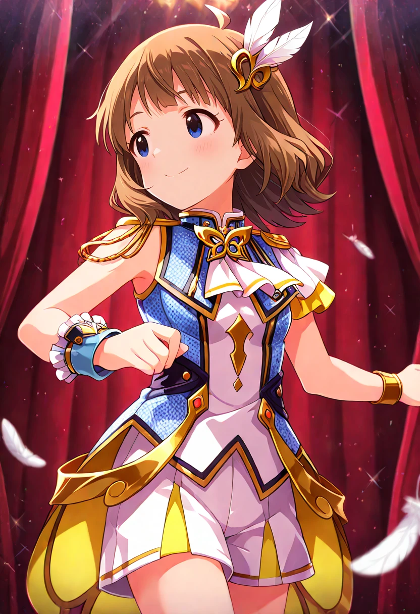 suou momoko, ahoge, short hair, brown hair, light brown hair, blue eyes, eyebrows visible through hair, wavy hair, blunt bangsTHEATER DAYS SSR card illustration style (Animagine XL 3.1 ver. only supported) / ミリシタSSRカードイラスト風 (Animagine XL 3.1バージョンのみ対応)