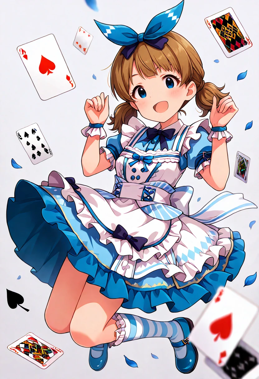 suou momoko, made-on-alice, brown hair, light brown hair, short twintails, low twintails, medium hair, braid, alice \(alice in wonderland\) \(cosplay\), short twintails, low twintails, blue shirt, collared shirt, white collar, frilled dress, puffy short sleeves, frilled sleeves, blue skirt, frilled skirt, white apron, maid apron, frilled apron, striped, apron bow, back bow, center frills, black neckwear, black bow, blue bow, black ribbon, blue ribbon, hair bow, hair ribbon, wrist cuffs, striped legwear, white legwear, frilled legwearI did+I will=Make it! (Outfit name: I CAN=DO IT!) / I did+I will=Make it! (衣装名: アイキャン=ドゥーイット!)