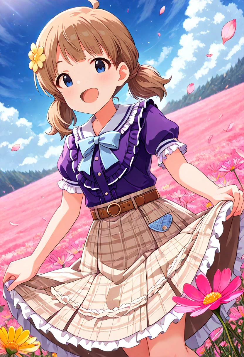 suou momoko, priv-dress, ahoge, brown hair, light brown hair, blunt bangs, low twintails, short twintails, braid, blue shirt, blue blouse, collared shirt, frilled shirt, center frills, frilled shirt collar, puffy short sleeves, hair ornament, blue bow, hair flower, white flower, hairclip, brown skirt, frilled skirt, plaid skirt, pleated skirt, skirt bow, bowtie, blue neckwear, brown beltBRIGHT DIAMOND (Outfit name: Diamond chronicle) / BRIGHT DIAMOND (衣装名: ダイヤモンド・クロニクル)
