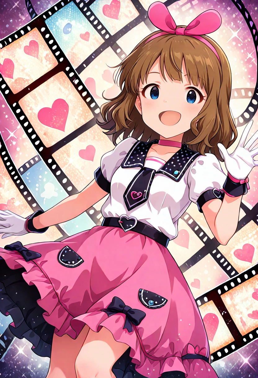 suou momoko, i-can-do-it, ahoge, short hair, brown hair, light brown hair, blue eyes, eyebrows visible through hair, wavy hair, blunt bangs, white shirt, collared shirt, puffy short sleeves, sailor collar, polka dot collar, black collar, pink skirt, frilled skirt, print skirt, black bow, skirt bow, pink bow, pink hairband, bow hairband, pink choker, black necktie, polka dot necktie, white gloves, black belt, heart shaped buckleCosmos and Promises (Outfit name: Private dress) / 秋桜と約束 (衣装名: プライベートドレス)