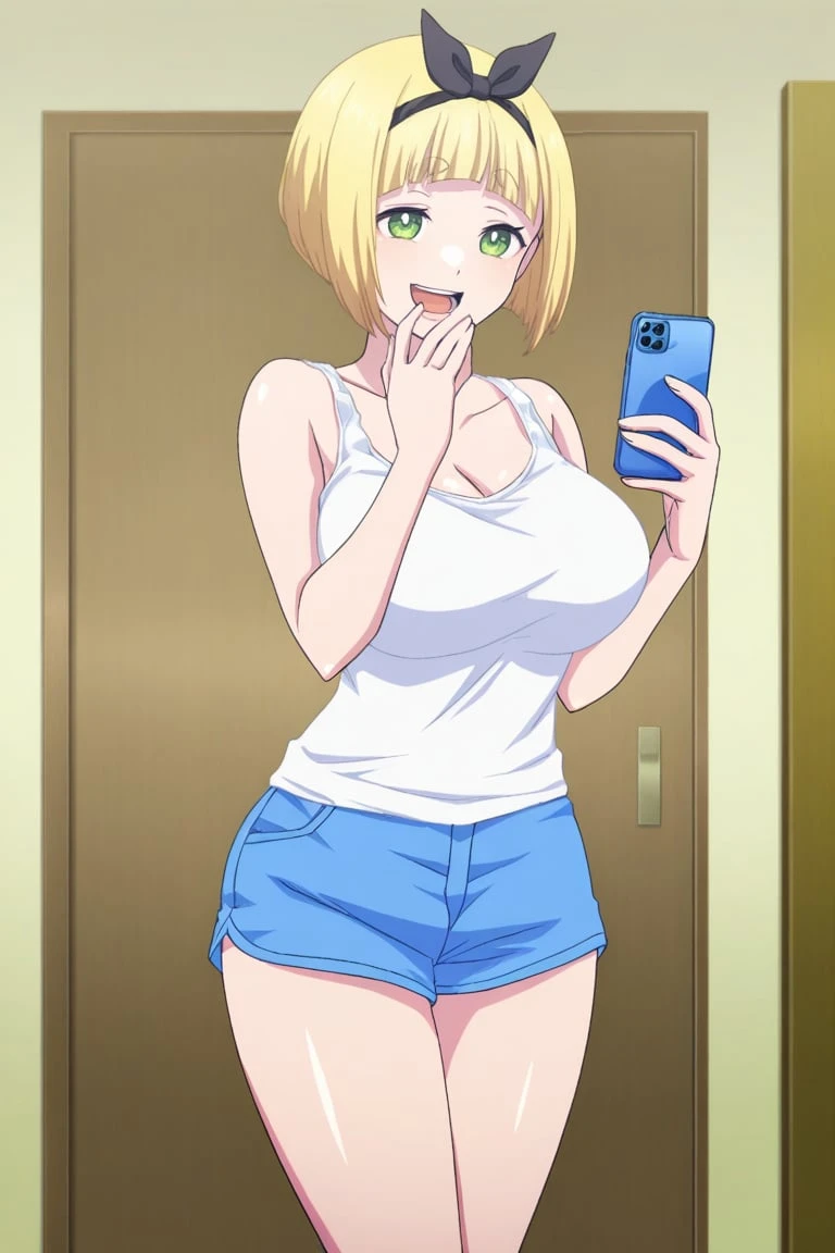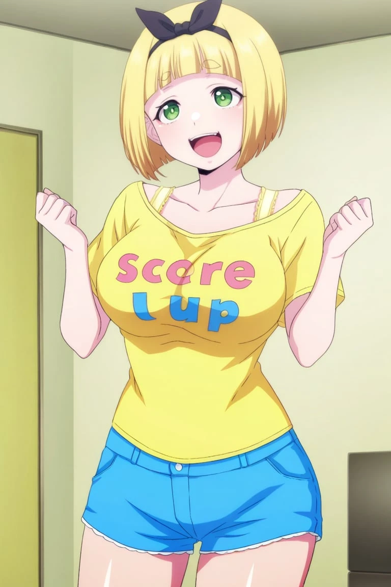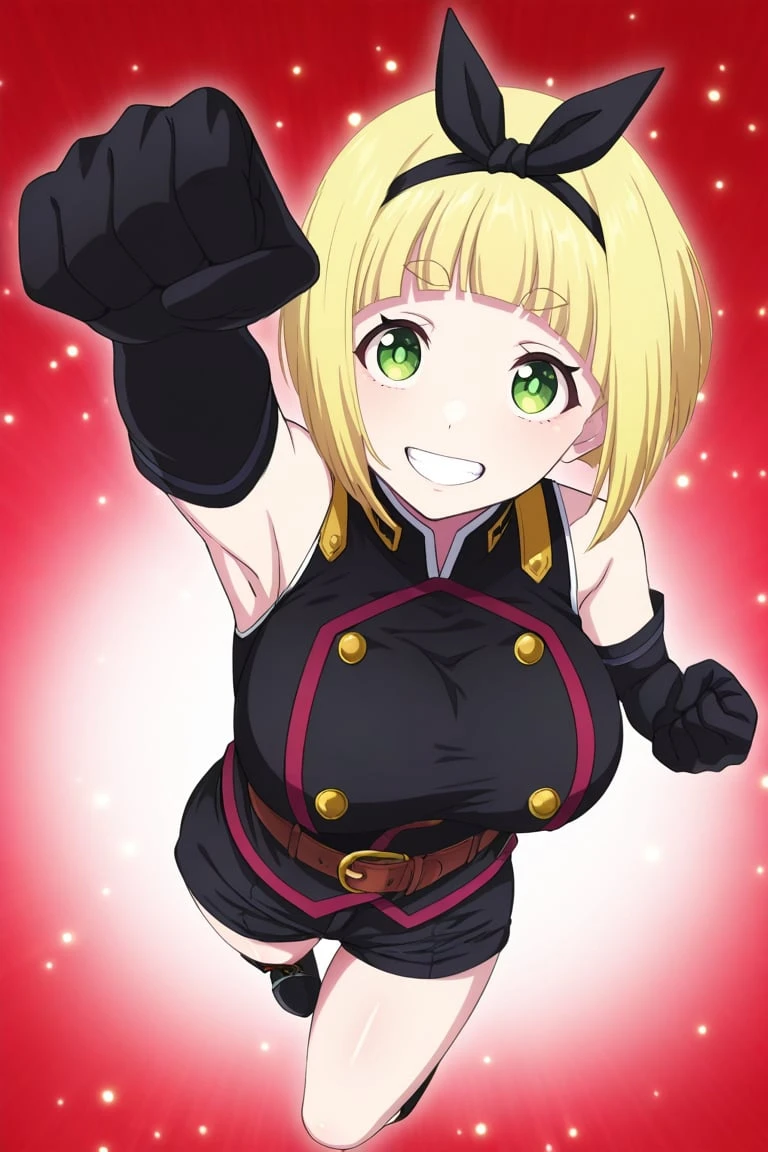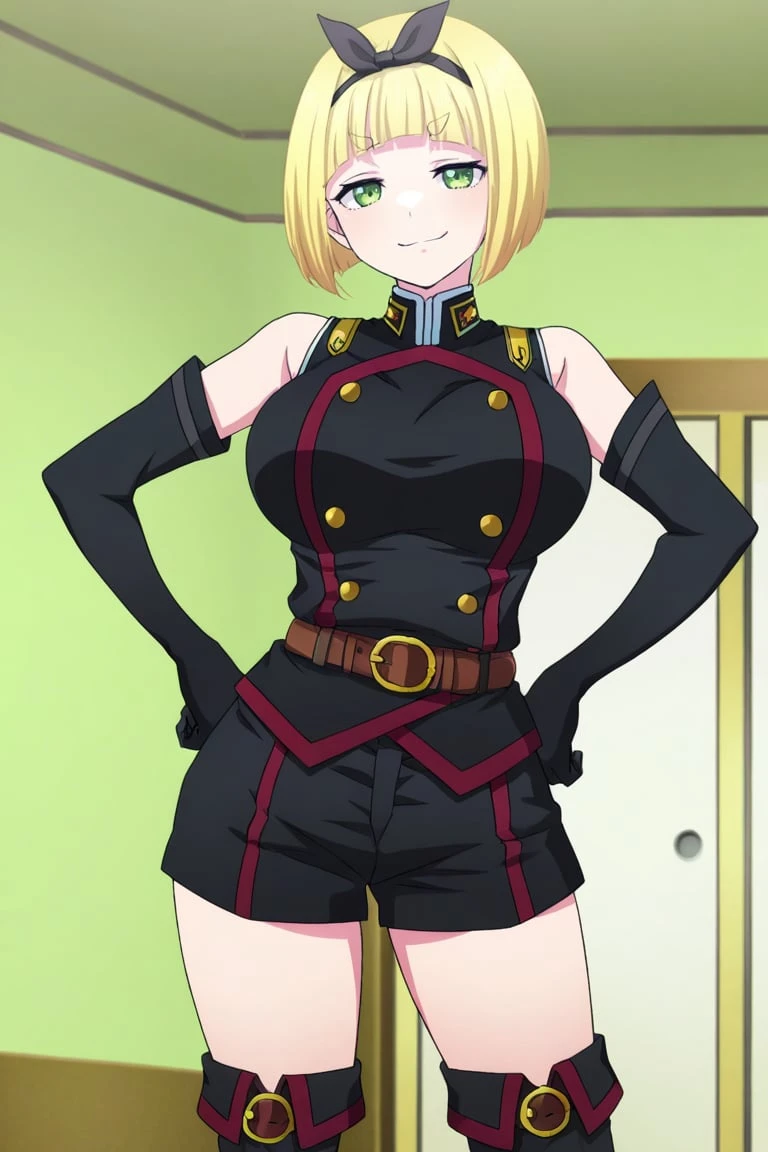 1girl,shushu suruga, blonde hair, short hair, bob haircut, straight bangs, thick eyebrows, green eyes, large breasts, bow hairband, black bow,