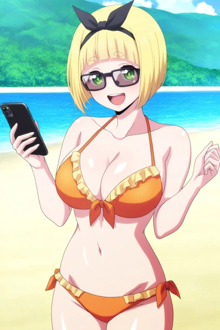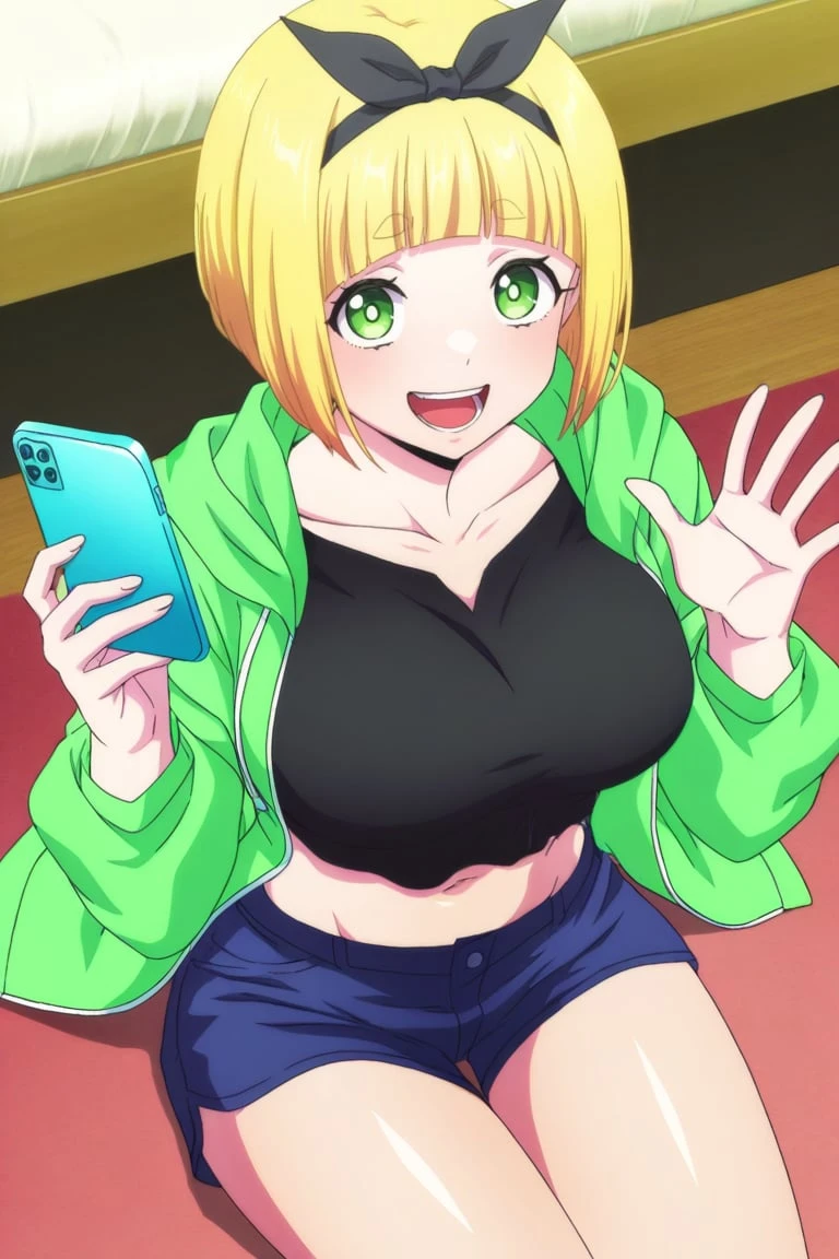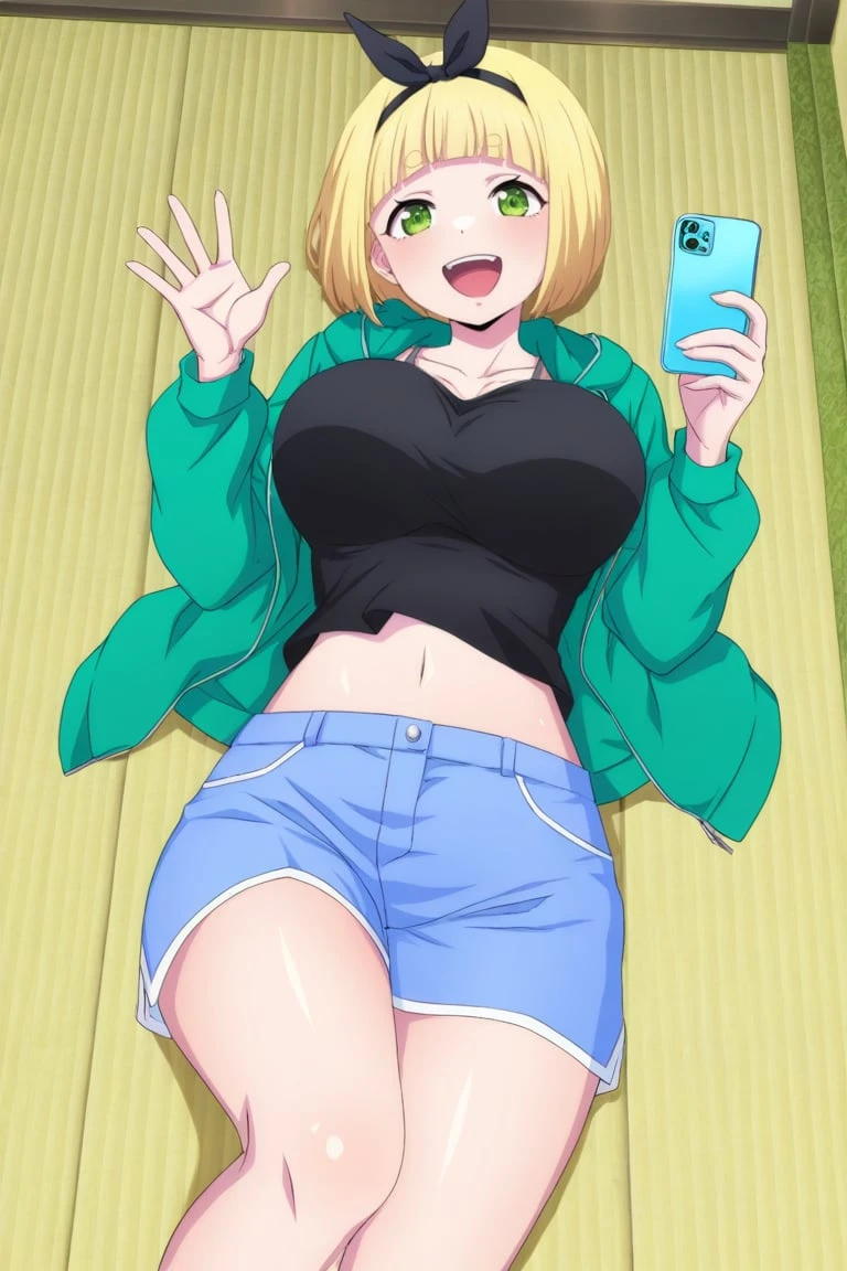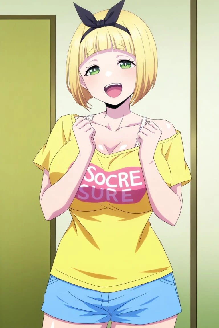 1girl,shushu suruga, blonde hair, short hair, bob haircut, straight bangs, thick eyebrows, green eyes, large breasts, bow hairband, black bow,