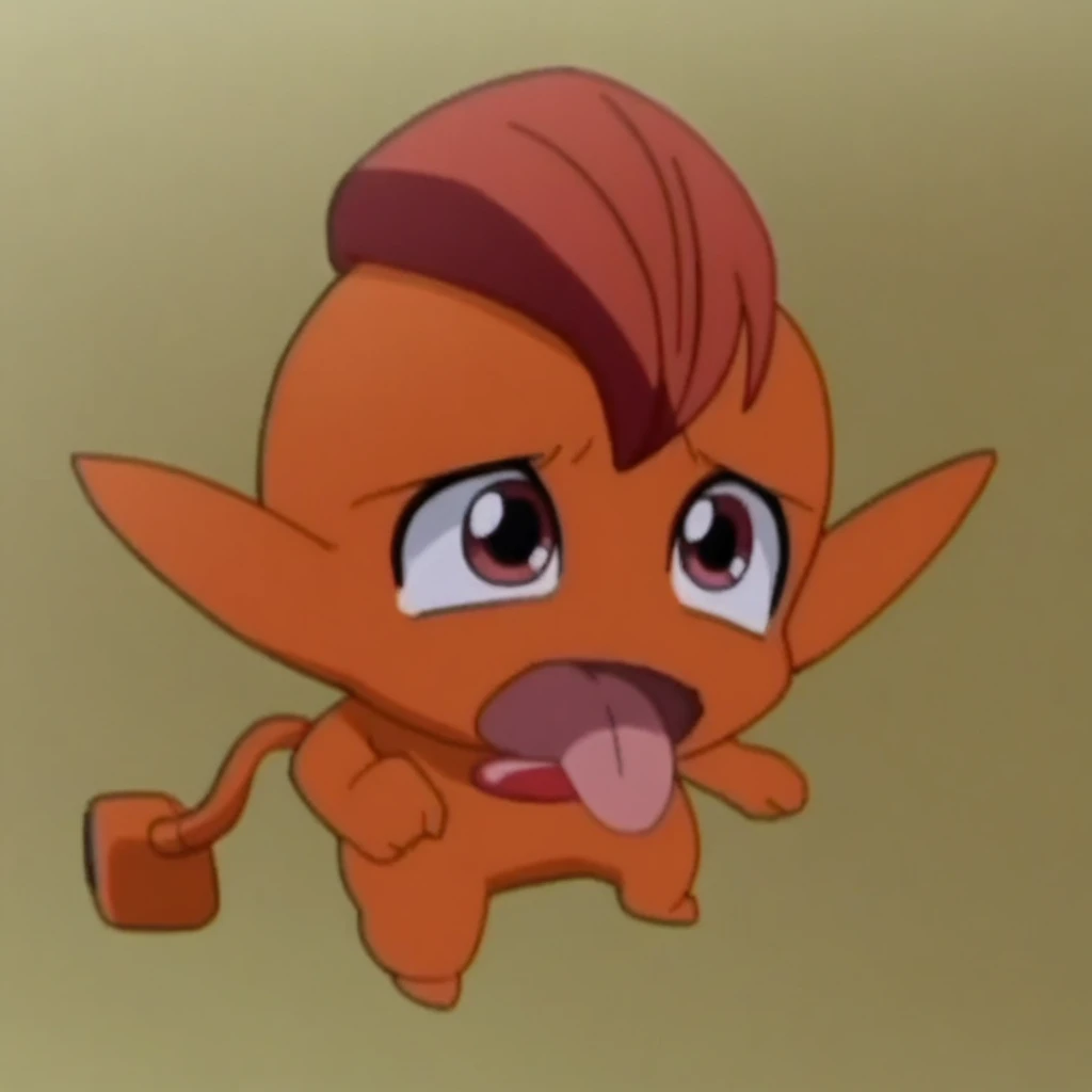 solo, no humans, pokemon(create), brown eyes, 1boy, male focus, full body, orange skin, red eyes, tail, orange eyes, pointy ears, flame-tipped tail, red hair