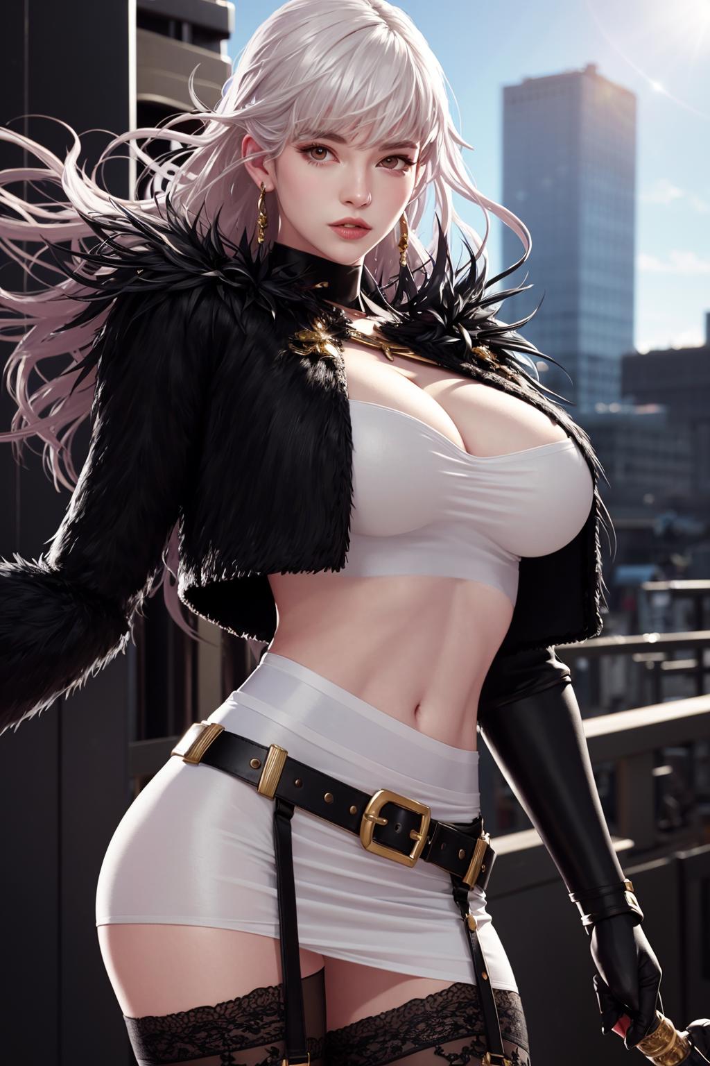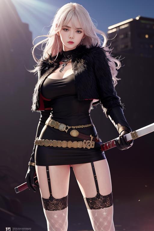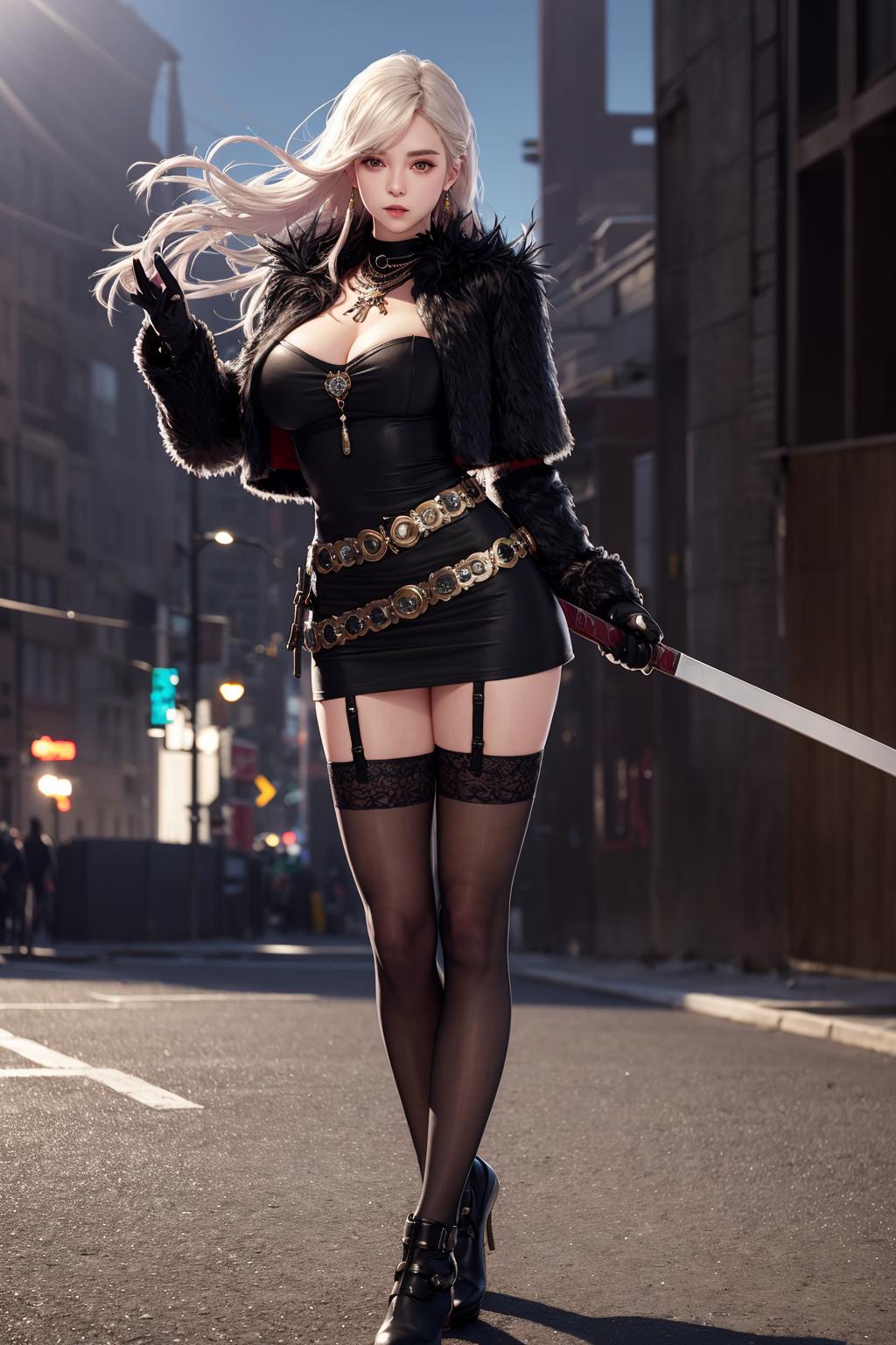 thighhighs, gloves, garter straps, black gloves, belt, white thighhighs, fur trim, cropped jacket,short black dress, scabbard, lips, black footwear,
