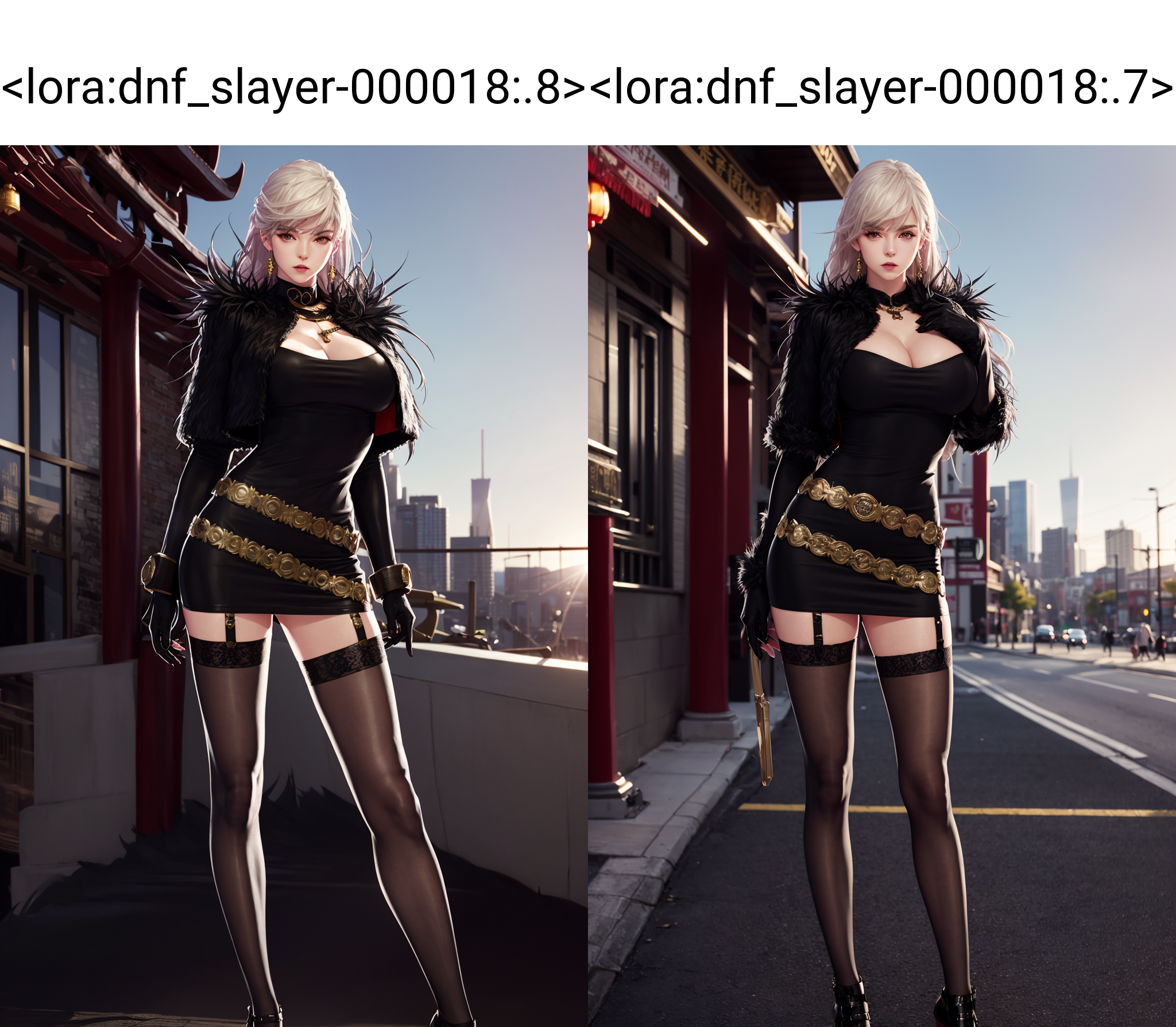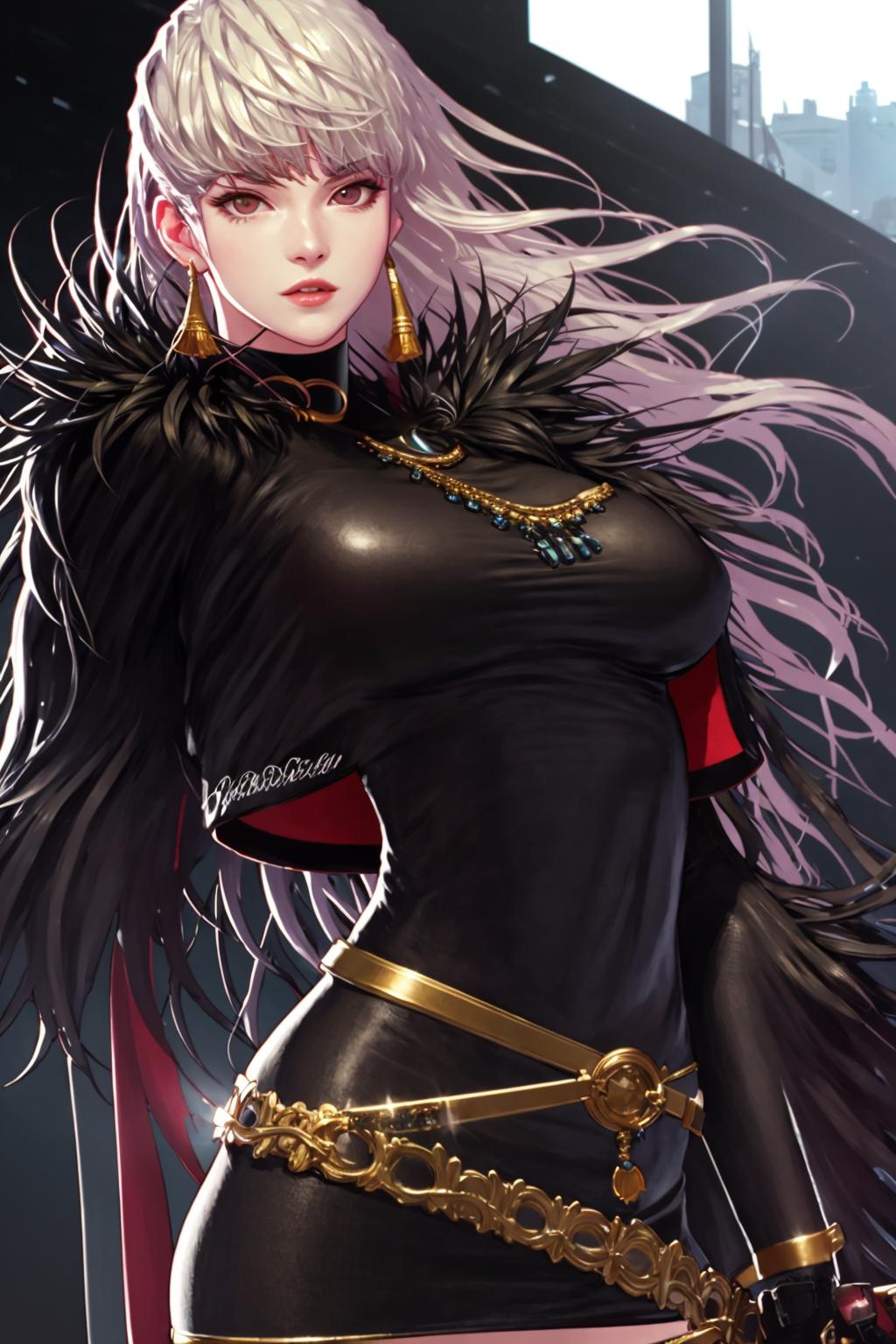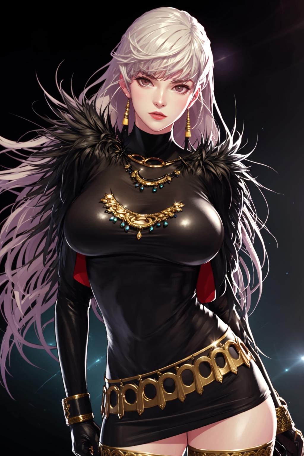 thighhighs, gloves, garter straps, black gloves, belt, white thighhighs, fur trim, cropped jacket,short black dress, scabbard, lips, black footwear,