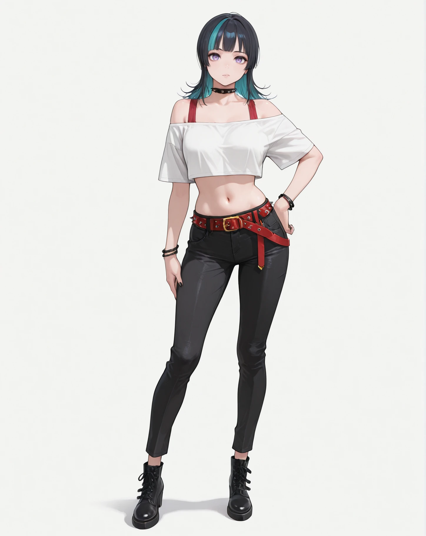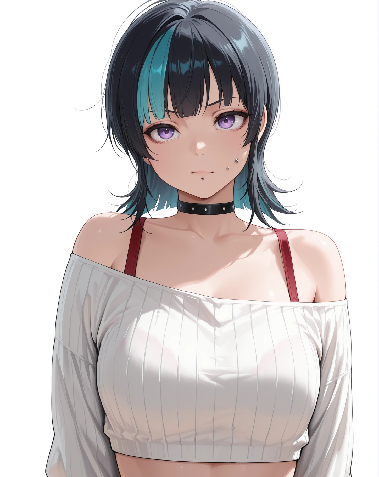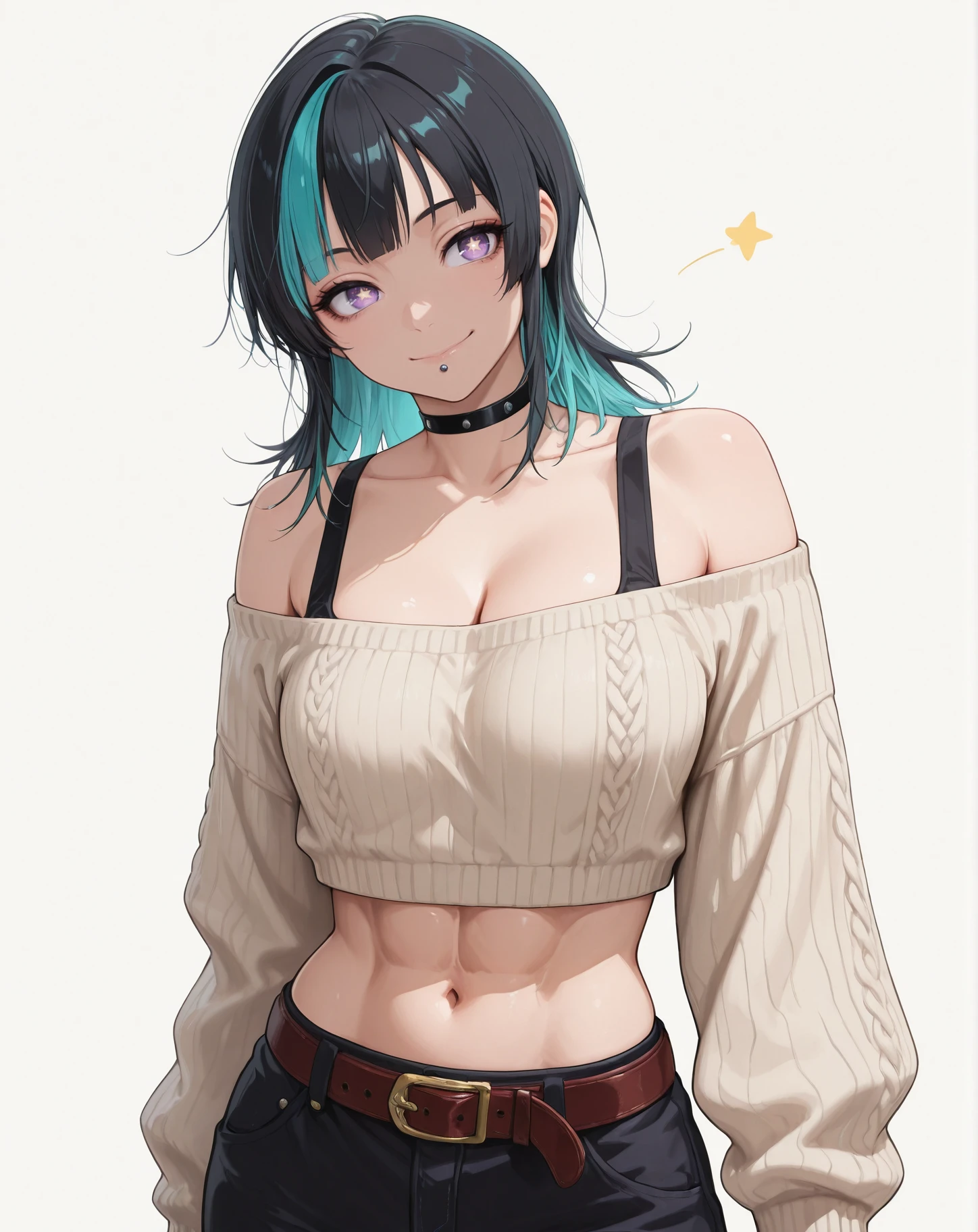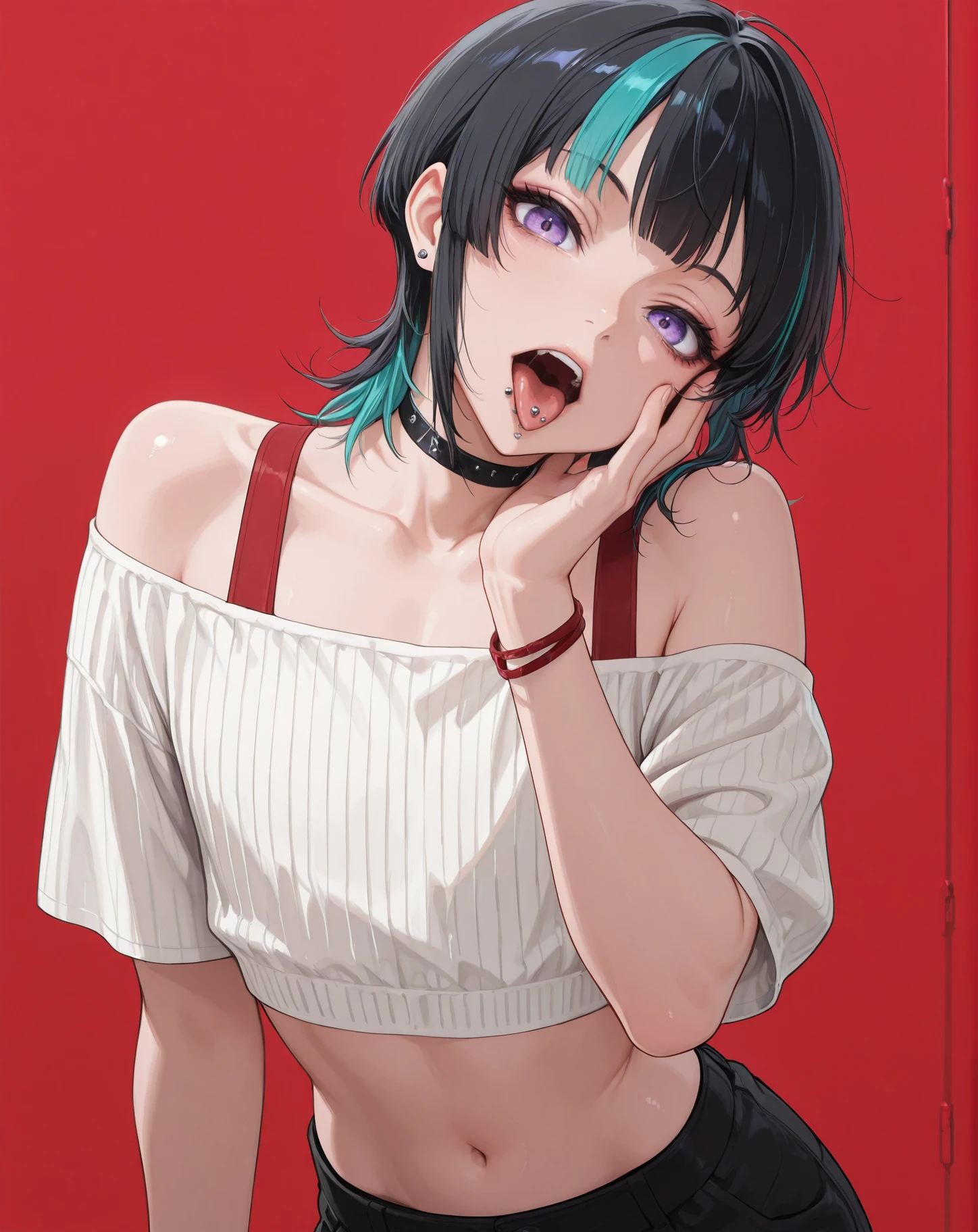 hoshi kirara, black hair, cheek piercing, purple eyes, short hair, streaked hair