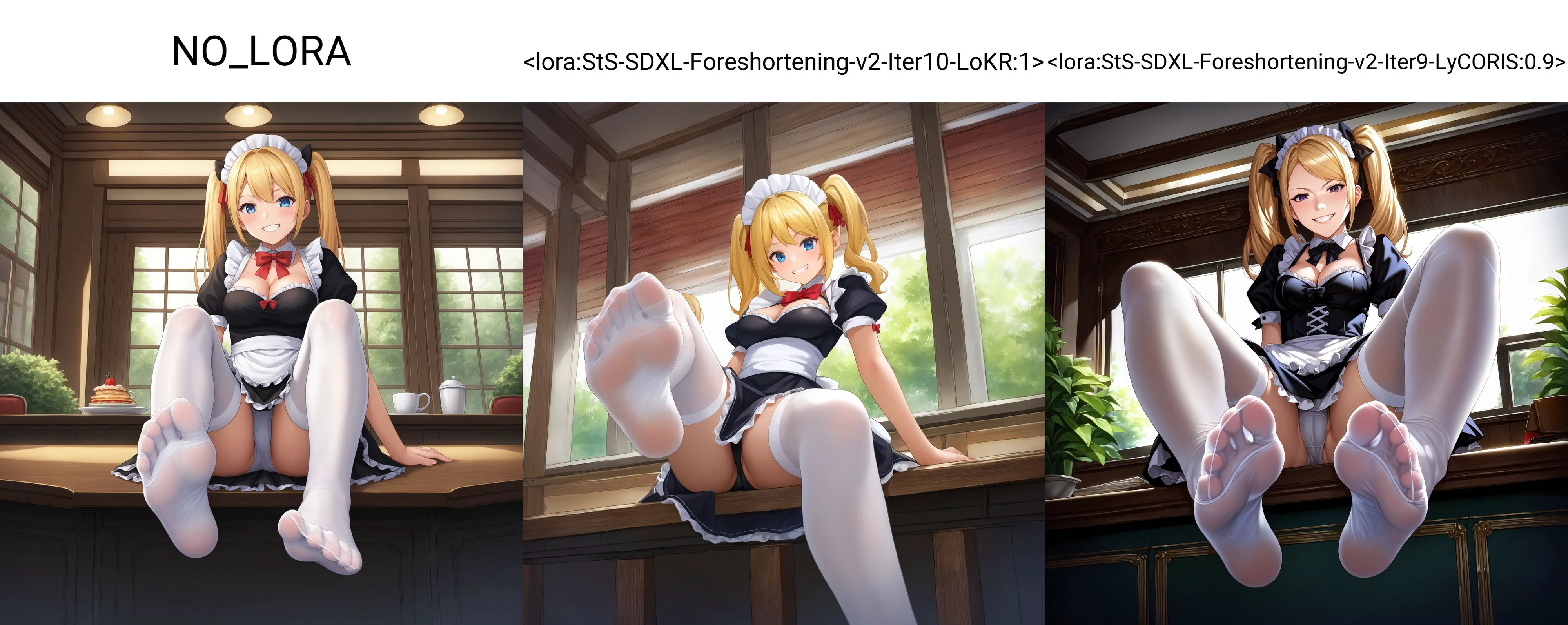 Activation tag for v2.0 LoRas is sts-foreshortening-v2 . Recommended weight 0.6 to 1.0 . Because of the sheer percentage of foreshortening pictures on the internet being foot/feet related, this LyCORIS does foot_focus, feet, and soles rather well. This LyCORIS also does arms_outstreched and reaching_towards_viewer well. This LyCORIS pairs well with my detail slider LoRA for PonyXL.