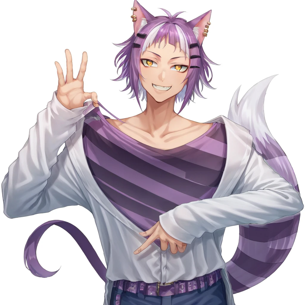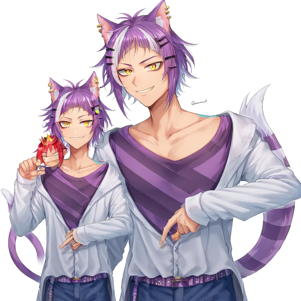 cat ears, slitted cat pupils, purple hair, animal ears, multicolored hair