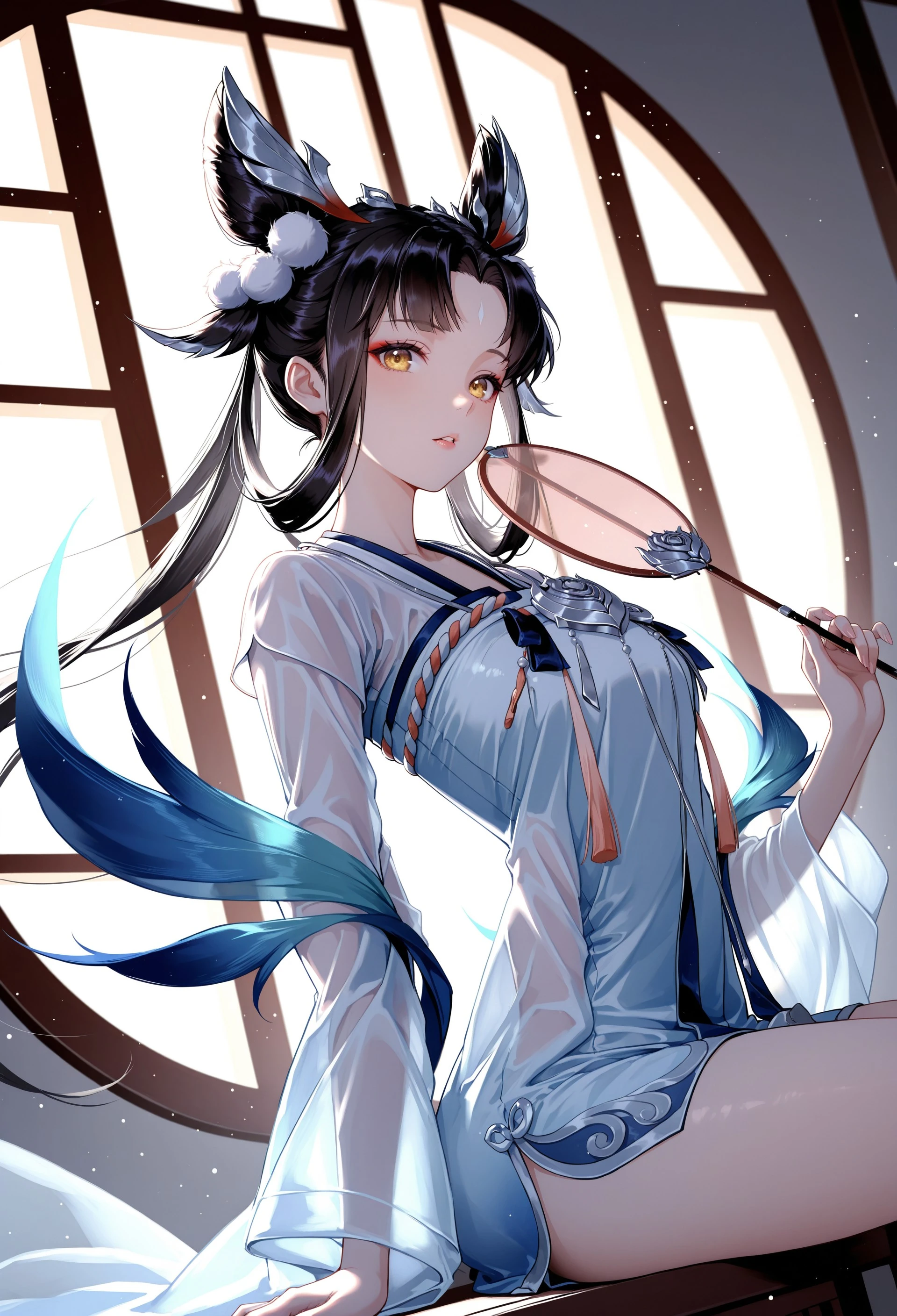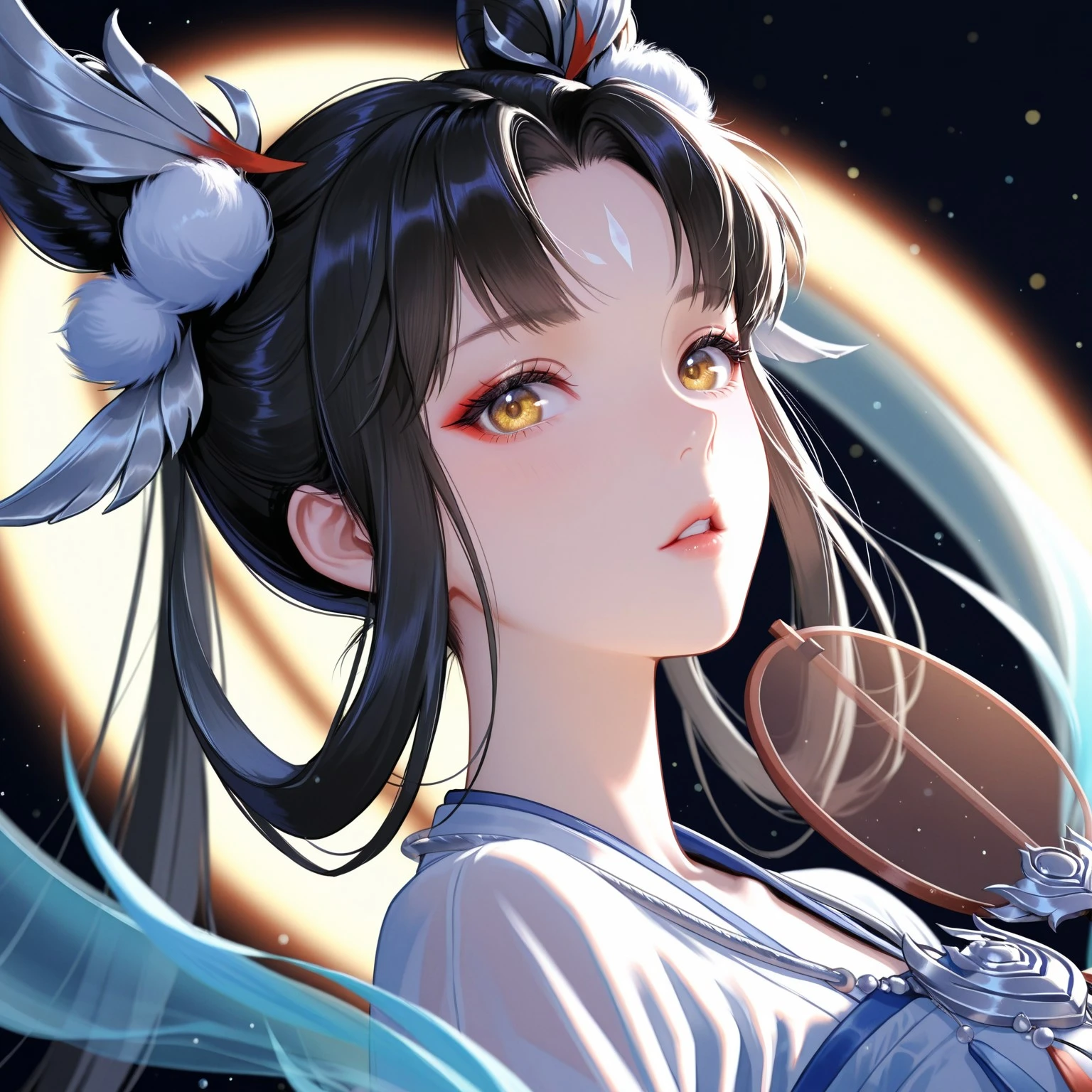 RMLchange, black hair, long hair, double bun, hair ornament, forehead marking, golden eyes, chinese clothes, floating clothes, jewelry, ribbon, circular fan,