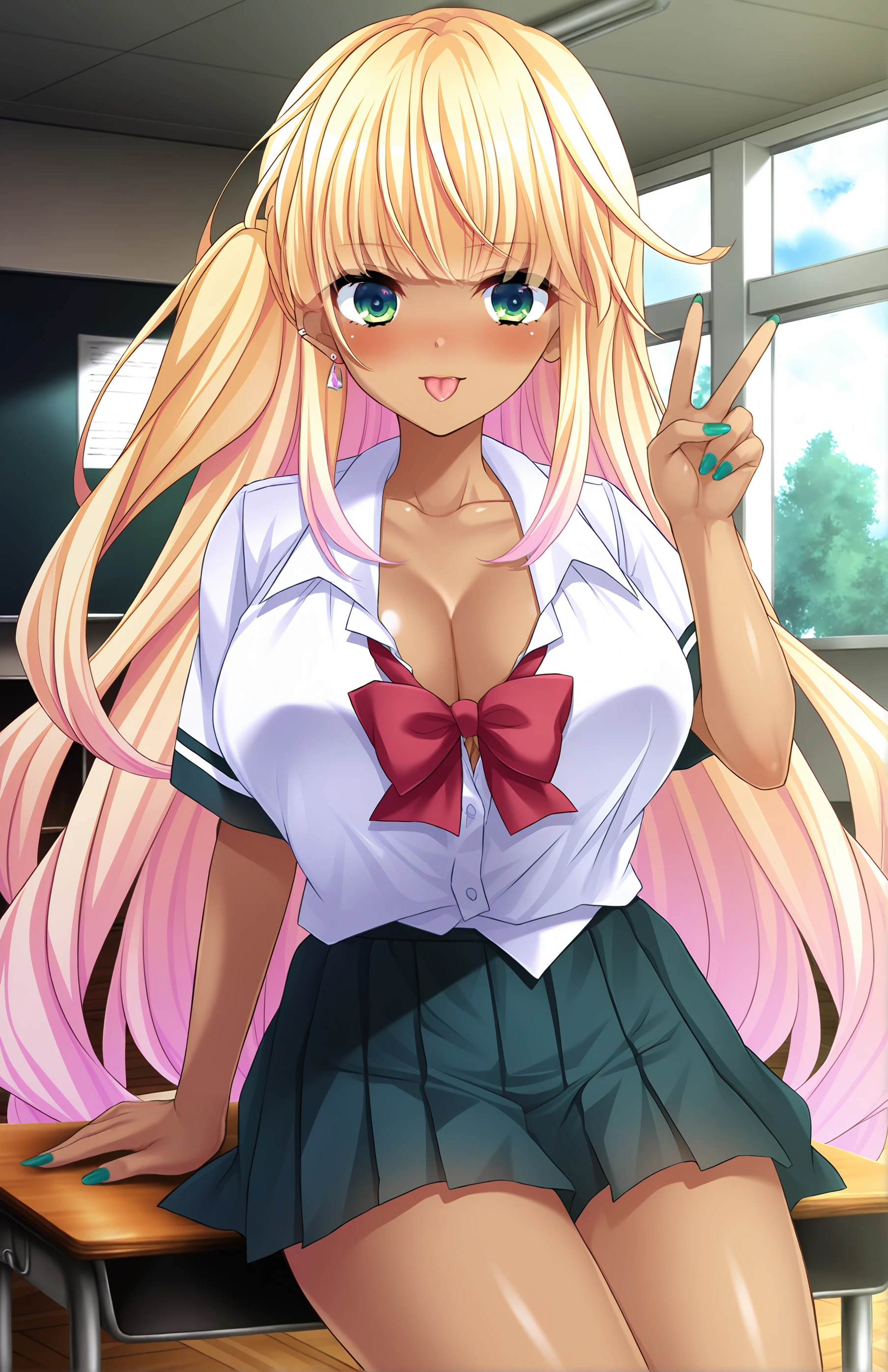 MiyaharaRisa, long hair, breasts, bangs, skirt, blonde hair, large breasts, shirt, bow, cleavage, jewelry, very long hair, school uniform, green eyes, collarbone, white shirt, short sleeves, multicolored hair, pleated skirt, earrings, collared shirt, dark skin, bowtie, nail polish, dark-skinned female, gradient hair, green skirt, gyaru, kogal
