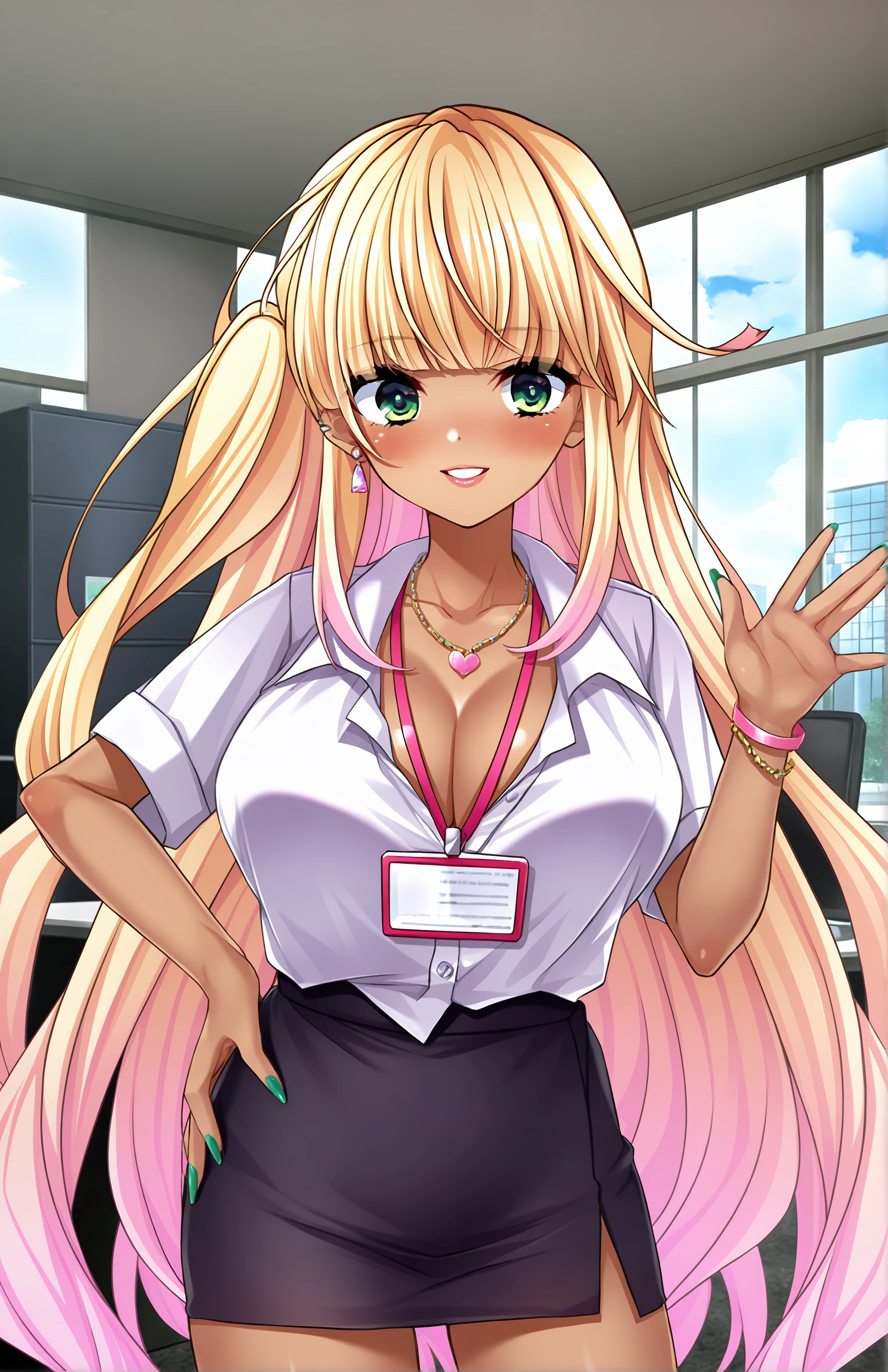 MiyaharaRisa, long hair, breasts, bangs, skirt, blonde hair, large breasts, shirt, long sleeves, navel, cleavage, jewelry, very long hair, green eyes, collarbone, white shirt, pink hair, multicolored hair, earrings, dark skin, black skirt, nail polish, dark-skinned female, gradient hair, piercing, slip, pencil skirt, gyaru